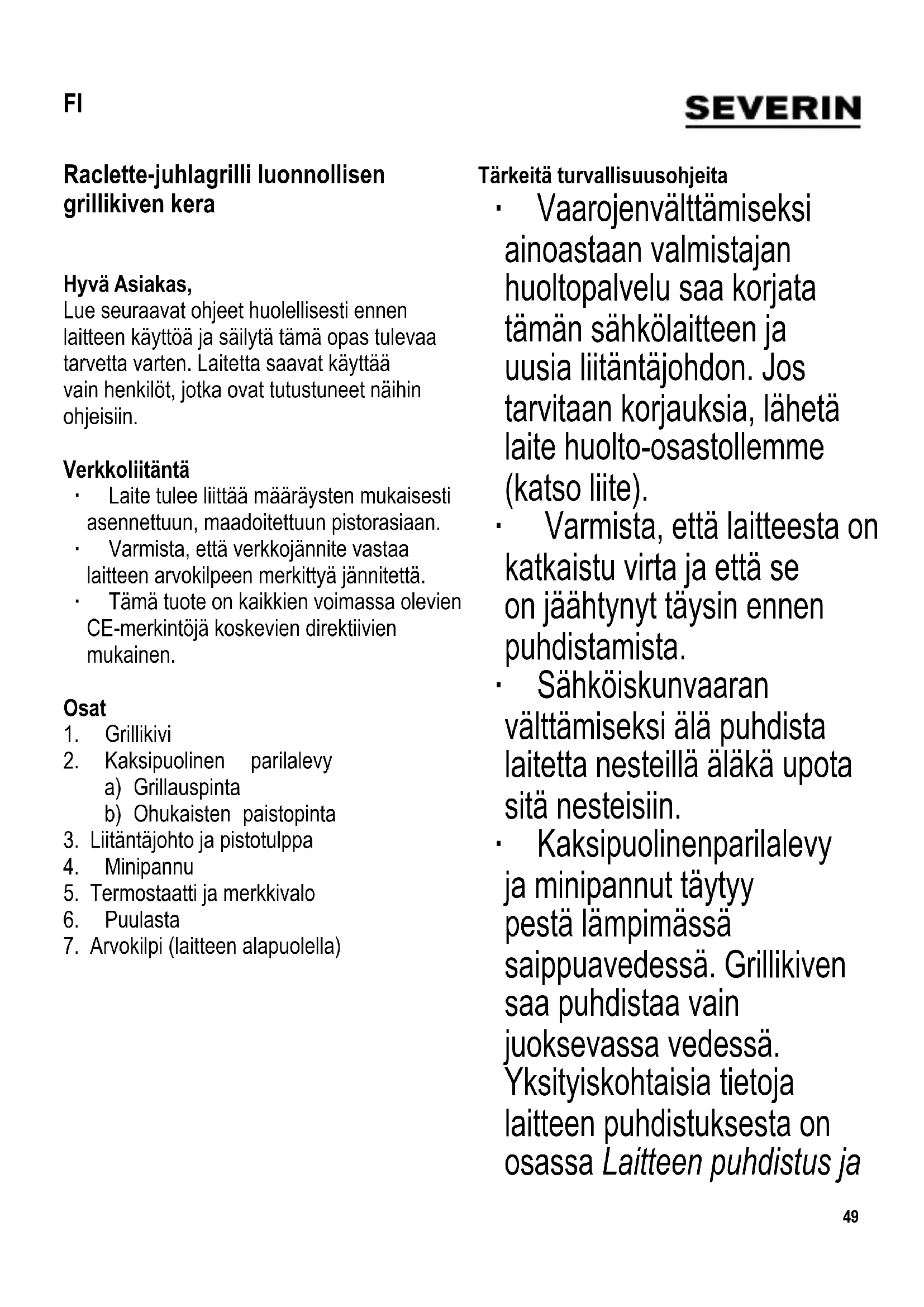 Tärkeitä turvallisuusohjeita ∙ Vaarojen välttämiseksi ainoastaan valmistajan huoltopalvelu saa korjata tämän sähkölaitteen ja uusia liitäntäjohdon. Jos tarvitaan korjauksia, lähetä laite huolto-osastollemme (katso liite). ∙ Varmista, että laitteesta on katkaistu virta ja että se on jäähtynyt täysin ennen puhdistamista. ∙ Sähköiskun vaaran välttämiseksi älä puhdista laitetta nesteillä äläkä upota sitä nesteisiin. ∙ Kaksipuolinen parilalevy ja minipannut täytyy pestä lämpimässä saippuavedessä. Grillikiven saa puhdistaa vain juoksevassa vedessä. Yksityiskohtaisia tietoja laitteen puhdistuksesta on osassa Laitteen puhdistus ja FI50 hoito. ∙ Tätä laitetta ei ole tarkoitettu käytettäväksi erillisen ajastimen tai kaukosäätimen kanssa. ∙ Tämä laite on tarkoitettu kotitalouskäyttöön tai vastaavaan, kuten - ruokalat, toimistot ja muut kaupalliset ympäristöt, - maatalousyritykset, - hotellien, motellien jne. ja vastaavien yritysten asiakkaat, - aamiaisen ja majoituksen tarjoavat majatalot. ∙ Tätä laitetta saavat käyttää lapset (vähintään 8-vuotiaat) sekä henkilöt, joilla on fyysisesti, aistillisesti tai henkisesti rajoittunut toimintakyky tai joilla on puuttuvat tai vajavaiset tiedot laitteen toiminnasta, mikäli heitä valvotaan tai ohjataan laitteen käytössä ja he ymmärtävät täysin kaikki käyttöön liittyvät vaarat ja turvatoimenpiteet. ∙ Lasten ei saa antaa leikkiä laitteella. ∙ Lasten ei saa antaa tehdä laitteen puhdistus- tai huoltotoimenpiteitä, elleivät he ole aikuisen valvonnassa sekä vähintään 8 vuotta vanhoja. ∙ Laite ja sen liitäntäjohto täytyy aina pitää alle 8-vuotiaiden ulottumattomissa. ∙ Varoitus: Pidä lapset poissa pakkausmateriaalien luota potentiaalisen vaaratilanteen esim. tukehtumisvaaran vuoksi. ∙ Ennen käyttöönottoa tarkista laite ja mahdolliset lisäosat vaurioiden varalta. Jos laite on esimerkiksi pudonnut kovalle pinnalle tai liitäntäjohdon vetämiseen on käytetty liikaa voimaa, laitetta ei saa enää käyttää: näkymättömätkin vauriot voivat aiheuttaa laitetta käytettäessä vaaratilanteita. ∙ Laitteen pinnat, kaksipuolinen parilalevy, grillikivi ja minipannut kuumenevat käytön aikana. Varoitus: Palovammojen vaara on olemassa.51 ∙ Älä koskaan poistu paikalta laitteen ollessa toimintakunnossa. ∙ Älä jätä liitäntäjohtoa roikkumaan äläkä anna sen koskettaa kuumia osia. ∙ Laite on sijoitettava käytön ajaksi kuumuudenkestävälle, vakaalle ja tasaiselle pinnalle, joka kestää roiskeet ja tahrautumisen. Rasvaista tai nestepitoista ruokaa valmistettaessa ei aina ole mahdollista välttää roiskumista. ∙ Älä aseta grilliä seinän viereen tai nurkkaan ja varmista, ettei sen lähellä ole tulenarkoja materiaaleja. ∙ Älä aseta laitetta kuumalle alustalle, tai tulen tai palovaarallisen höyryn läheisyyteen. ∙ Turvaohjeita: Älä käytä laitetta ulkosalla. ∙ Ennen käyttöä kaksipuolinen parilalevy ja grillikivi on asetettava laitteen päälle kuumennuselementin yläpuolelle. ∙ Irrota pistotulppa pistorasiasta aina - käytön jälkeen, - jos laitteessa on käyttöhäiriö, - ennen laitteen puhdistamista. ∙ Kun irrotat pistotulpan pistorasiasta, älä vedä liitäntäjohdosta; tartu aina pistotulppaan. ∙ Valmistaja ei ole vastuussa mahdollisista vaurioista, jos ne johtuvat laitteen väärinkäytöstä tai käyttöohjeiden laiminlyömisestä. Käyttötarkoitus Tämä laite on sähköinen raclette-grilli, joka soveltuu lihan, kalan ja vihannesten vähärasvaiseen grillaukseen, juuston gratinointiin ja ohukaisten paistamiseen. Kaikki muu kuin näissä ohjeissa kuvailtu käyttö on määräysten vastaista ja voi aiheuttaa henkilövammoja tai aineellisia vahinkoja. Ennen ensimmäistä käyttöönottoa ∙ Poista kaikki pakkausmateriaali. ∙ Puhdista kaksipuolinen parilalevy, grillikivi ja minipannut kostealla liinalla. ∙ Lämmitä kivialustalla / levyllä ja minipannuilla varustettua grilliä noin 10 minuutin ajan tyhjänä, jotta ensimmäisen käyttökerran aikainen tyypillinen ominaishaju haihtuu (kevyttä savunmuodostusta voi olla havaittavissa). Sen takia täytyy varmistaa riittävä tuuletus avaamalla ikkuna tai parvekkeen ovi. ∙ Puhdista laite tämän jälkeen kappaleessa Laitteen puhdistus ja hoito olevan kuvauksen mukaisesti. Kivialusta ∙ Kiinnitä kivialusta laitteeseen kiillotettu puoli ylöspäin kaksipuolisen parilalevyn viereen. Varoitus: Vältä asettamasta kylmää kivialustaa kuumalle lämpövastukselle. ∙ Kivialustalla voidaan kypsentää vihanneksia, lihaviipaleita, kalaa jne. ∙ Alusta on luonnonkiveä. Lämpötilan vaihteluiden aikana tapahtuva luonnollinen laajentuminen ja viileneminen aiheuttaa pieniä halkeamia52 ja värin tummumista. Tämä on normaalia, eikä vaikuta haitallisesti laitteen toimintaan. ∙ Älä aseta kivialustalle jäistä ruokaa tai etikkaa sisältäviä ruoka-aineita (esim. suolakurkkuja tai sinappia). Kaksipuolinen parilalevy ∙ Asenna kaksipuolinen parilalevy laitteeseen kivialustan viereen. ∙ Parilalevyä voidaan käyttää sileä puoli ylöspäin normaaliin grillaamiseen. Parilalevyä pitää voidella hieman ennen käyttöä. Kääntöpuoli soveltuu 4 pienen ohukaisen tai pannukakun paistamiseen. Säädettävä termostaatti ja merkkivalo ∙ Jos termostaattinuppi on käännetty ääriasentoon oikealle, kuumennuselementti on koko ajan päällä. Jos se käännetään vasemmalle, laite kytkeytyy vuorotellen pois päältä ja päälle. ∙ Punainen merkkivalo palaa niin kauan kun kuumennuselementti on kytkettynä päälle. ∙ Kun ruoka on valmista, käännä termostaatti pienimpään asentoonsa ja vedä verkkopistoke irti. Käyttö Vihje: Optimaalista grillausnautintoa varten liha tulisi ottaa jääkaapista noin 30 minuuttia ennen grillausta ja jättää seisomaan peitetylle lautaselle. ∙ Aseta grillikivi ja kaksipuolinen parilalevy laitteen päälle ja varmista samall