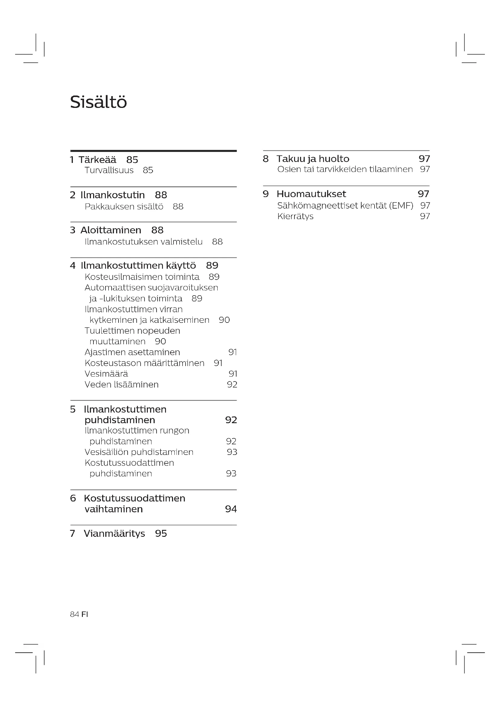 - Tarkista suodattimet, ennen kuin otat ilmankostuttimen uudelleen käyttöön. Jos suodatin on erittäin likainen ja siinä on tummia läikkiä, vaihda se (katso käyttöoppaan kohta Kostutussuodattimen vaihtaminen).97FI Suomi 9 Huomautukset Sähkömagneettiset kentät (EMF) Tämä Philips-laite vastaa kaikkia sähkömagneettisia kenttiä (EMF) koskevia standardeja ja säännöksiä. Kierrätys Tämä merkki tarkoittaa, että tätä tuotetta ei saa hävittää tavallisen kotitalousjätteen mukana (2012/19/EU). Noudata maasi sähkö- ja elektroniikkalaitteiden erillistä keräystä koskevia sääntöjä. Asianmukainen hävittäminen auttaa ehkäisemään ympäristölle ja ihmisille mahdollisesti koituvia haittavaikutuksia. 8 Takuu ja huolto Jos tarvitset lisätietoja tai ilmenee ongelma, käy Philipsin verkkosivulla osoitteessa www.philips.com tai ota yhteys Philipsin maakohtaiseen kuluttajapalvelukeskukseen (puhelinnumero on kansainvälisessä takuulehtisessä). Jos maassasi ei ole kuluttajapalvelukeskusta, ota yhteys paikalliseen Philips-jälleenmyyjään. Osien tai tarvikkeiden tilaaminen Voit ostaa vaihto- tai lisäosia Philips- jälleenmyyjältä tai osoitteesta www.philips.com/support. Jos et löydä varaosia, ota yhteyttä Philipsin maakohtaiseen kuluttajapalvelukeskukseen (puhelinnumero on kansainvälisessä takuulehtisessä).98 FR Contenu 1 Important 99 Sécurité 99 2 Votre humidicateur 102 Contenu de l'emballage 102 3 Guide de démarrage 103 Préparation de l'humidication 103 4 Utilisation de l'humidicateur 103 Signication de l'indication d'humidité 103 Fonctionnement de l'alerte et du verrouillage de protection de l'air sain 103 Mise sous et hors tension de l'humidicateur 104 Modication de la vitesse du ventilateur 104 Réglage du programmateur 105 Réglage du taux d'humidité 105 Niveau d'eau 105 Remplissage d'eau 106 5 Nettoyage de votre humidicateur 106 Nettoyage du corps de l'humidicateur 106 Nettoyage du réservoir d'eau 107 Nettoyage du ltre d'humidication 107 6 Remplacement du ltre d'humidication 108 7 Dépannage 109 8 Garantie et service 111 Commande de pièces ou d'accessoires 111 9 Mentions légales 111 Champs électromagnétiques (CEM) 111 Recyclage 11199FR Français Agréé Philips ou par un technicien qualié an d'éviter tout accident.