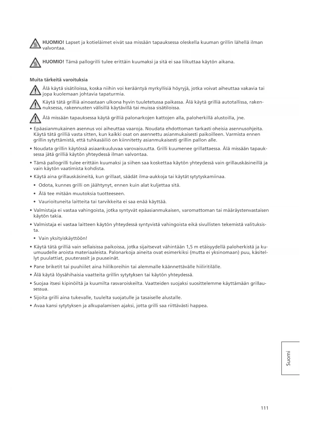 25069 Grillspett (4 st.) 25078 Kycklinghållare 25168 Rökplanka av al (2 st.) 25081 Potatishållare 25071 Fiskhållare 25074 Pizzasten, rund 41 cm 25075 Grillplatta, rund 40 cm111 Suomi HUOMIO! Lapset ja kotieläimet eivät saa missään tapauksessa oleskella kuuman grillin lähellä ilman valvontaa. HUOMIO! Tämä pallogrilli tulee erittäin kuumaksi ja sitä ei saa liikuttaa käytön aikana. Muita tärkeitä varoituksia Älä käytä sisätiloissa, koska niihin voi kerääntyä myrkyllisiä höyryjä, jotka voivat aiheuttaa vakavia tai jopa kuolemaan johtavia tapaturmia. Käytä tätä grilliä ainoastaan ulkona hyvin tuuletetussa paikassa. Älä käytä grilliä autotallissa, raken- nuksessa, rakennusten välisillä käytävillä tai muissa sisätiloissa. Älä missään tapauksessa käytä grilliä palonarkojen kattojen alla, paloherkillä alustoilla, jne.