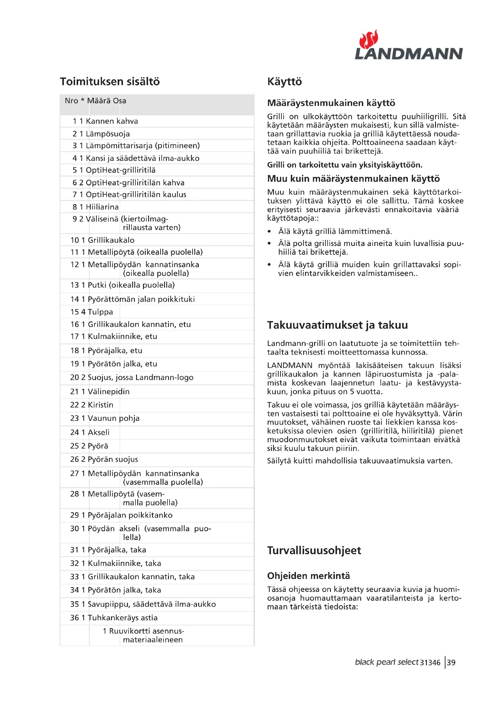 Toimituksen sisältö Nro * Määrä Osa 1 1 Kannen kahva 2 1 Lämpösuoja 3 1 Lämpömittarisarja (pitimineen) 4 1 Kansi ja säädettävä ilma-aukko 5 1 OptiHeat-grilliritilä 6 2 OptiHeat-grilliritilän kahva 7 1 OptiHeat-grilliritilän kaulus 8 1 Hiiliarina 9 2 Väliseinä (kiertoilmag- rillausta varten) 10 1 Grillikaukalo 11 1 Metallipöytä (oikealla puolella) 12 1 Metallipöydän kannatinsanka (oikealla puolella) 13 1 Putki (oikealla puolella) 14 1 Pyörättömän jalan poikkituki 15 4 Tulppa 16 1 Grillikaukalon kannatin, etu 17 1 Kulmakiinnike, etu 18 1 Pyöräjalka, etu 19 1 Pyörätön jalka, etu 20 2 Suojus, jossa Landmann-logo 21 1 Välinepidin 22 2 Kiristin 23 1 Vaunun pohja 24 1 Akseli 25 2 Pyörä 26 2 Pyörän suojus 27 1 Metallipöydän kannatinsanka (vasemmalla puolella) 28 1 Metallipöytä (vasem- malla puolella) 29 1 Pyöräjalan poikkitanko 30 1 Pöydän akseli (vasemmalla puo- lella) 31 1 Pyöräjalka, taka 32 1 Kulmakiinnike, taka 33 1 Grillikaukalon kannatin, taka 34 1 Pyörätön jalka, taka 35 1 Savupiippu, säädettävä ilma-aukko 36 1 Tuhkankeräys astia 1 Ruuvikortti asennus- materiaaleineen Käyttö Määräystenmukainen käyttö Grilli on ulkokäyttöön tarkoitettu puuhiiligrilli. Sitä käytetään määräysten mukaisesti, kun sillä valmiste- taan grillattavia ruokia ja grilliä käytettäessä nouda- tetaan kaikkia ohjeita. Polttoaineena saadaan käyt- tää vain puuhiiliä tai brikettejä. Grilli on tarkoitettu vain yksityiskäyttöön. Muu kuin määräystenmukainen käyttö Muu kuin määräystenmukainen sekä käyttötarkoi- tuksen ylittävä käyttö ei ole sallittu. Tämä koskee erityisesti seuraavia järkevästi ennakoitavia vääriä käyttötapoja::