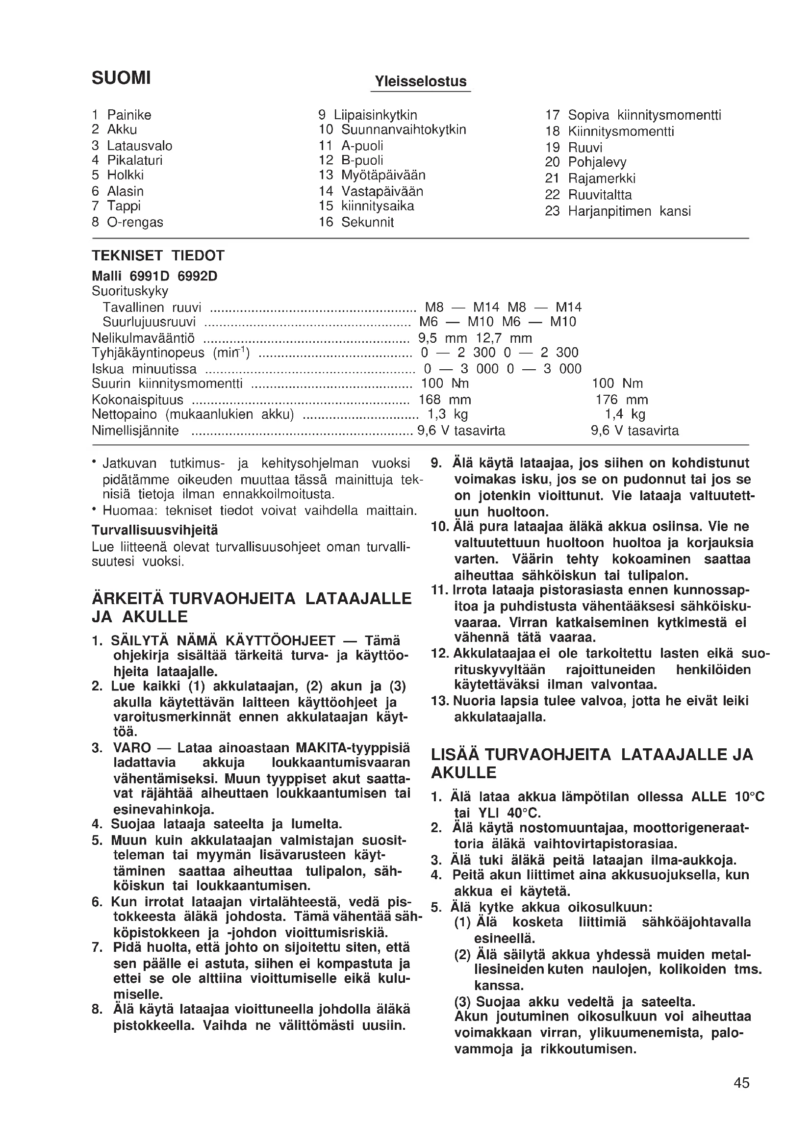 6991D/6992D (Nor) (’100. 10. 23)SUOMI Yleisselostus 1 Painike 2 Akku 3 Latausvalo 4 Pikalaturi 5 Holkki 6 Alasin 7 Tappi 8 O-rengas 9 Liipaisinkytkin 10 Suunnanvaihtokytkin 11 A-puoli 12 B-puoli 13 Myötäpäivään 14 Vastapäivään 15 kiinnitysaika 16 Sekunnit 17 Sopiva kiinnitysmomentti 18 Kiinnitysmomentti 19 Ruuvi 20 Pohjalevy 21 Rajamerkki 22 Ruuvitaltta 23 Harjanpitimen kansi TEKNISET TIEDOT Malli 6991D 6992D Suorituskyky Tavallinen ruuvi ....................................................... M8 — M14 M8 — M14 Suurlujuusruuvi ....................................................... M6 — M10 M6 — M10 Nelikulmavääntiö ....................................................... 9,5 mm 12,7 mm Tyhjäkäyntinopeus (min