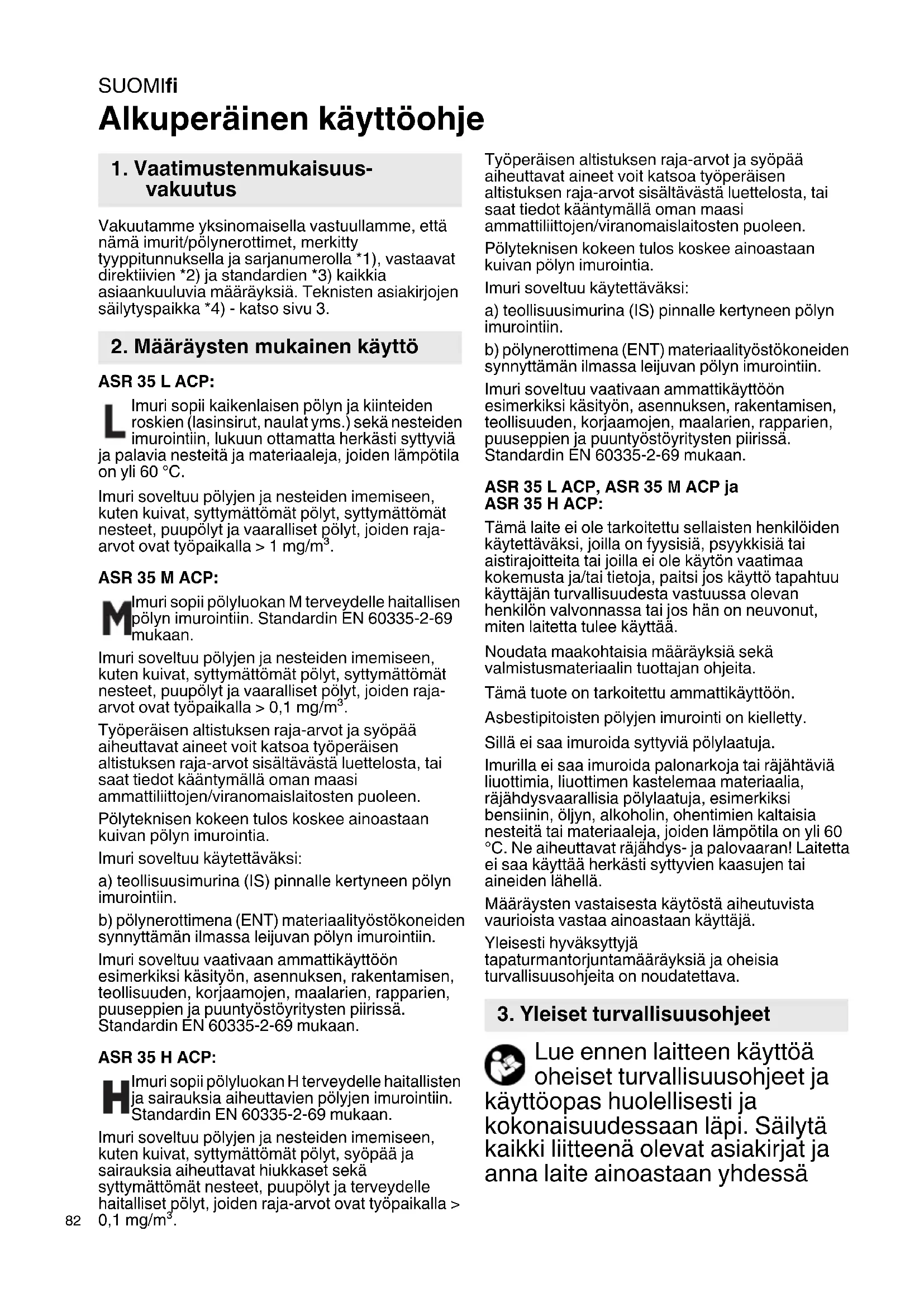 ajaksi, vedä verkkopistoke irti pistorasiasta. Imuria ei saa käyttää eikä säilyttää kosteissa olosuhteissa. HUOMIO - Tätä konetta saa säilyttää vain sisätiloissa. Hapot, asetoni ja liuottimet voivat syövyttää laitteen osia. Kytke laite pois päältä ja vedä verkkopistoke irti pistorasiasta jokaisen käyttökerran jälkeen ja aina ennen huolto- ja puhdistustöiden aloittamista. Imurin puhdistamiseen ei saa käyttää höyry- tai painepesureita. Kannen sisäpuoli tulee pitää aina kuivana. Laitteeseen muodostuu mikro- organismeja, jos puhdistusta ei tehdä pitkään aikaan, varsinkin elintarvikkeita käsittelevissä yrityksissä: Puhdista ja desinfioi laite aina heti käytön jälkeen. Älä missään tapauksessa avaa konetta ulkona sateella tai myrsky- isellä ilmalla. Älä käytä ulkona matalissa lämpötiloissa. Laitetta ei saa käyttää räjähdys- vaarallisissa tiloissa. Huolehdi siitä, että imuri seisoo tukevasti alustallaan. Huoneessa täytyy olla riittävän tehokas ilmanvaihto, jos poistoilma puhalletaan takaisin huoneeseen. Noudata maakohtaisia määräyksiä. Huomio! Tämä laite sisältää terveydelle haitallista pölyä. Tyhjennyksen ja huollon, mukaan lukien pölynkeruusäiliön poistamisen, saavat suorittaa vain ammattihenkilöt, joilla on yllään vastaavat suojavarusteet. Varoitus yleisestä vaarasta! Varo! Älä aloita laitteen käyttöä ennen kuin olet lukenut käyttöoppaan! VAROITUS - Käyttöhenkilökunnan täytyy saada riittävä opastus näiden imureiden käytöstä. Erityiset turvaohjeet mallille ASR 35 M ACP: Varoituskilpi pölyluokan M koneille: Huomioi tyhjennyksen ja huollon yhteydessä: Ennen kuin avaat laitteen, puhdista se. Käytä hengityssuojainta. Vältä altistamasta sivullisia pölylle. Huolehdi paikallisesta suodatetusta koneellisesta ilmanvaihdosta. Puhdista lopuksi huoltoalue. Älä käytä ilman täydellistä suodatusjärjestelmää. (suodatinkasetit ja PE- suodatinpussit). Standardin EN 60335 osa 1 ja 69 mukaisessa testissä on todettu, että turvallisuustekniset vaatimukset sähköturvallisuuden suhteen täytetään myös vesi- ilmaseoksen imuroinnin yhteydessä. Erityiset turvallisuusohjeet mallille ASR 35 H ACP: Varoituskilpi pölyluokan L koneille:SUOMI fi
