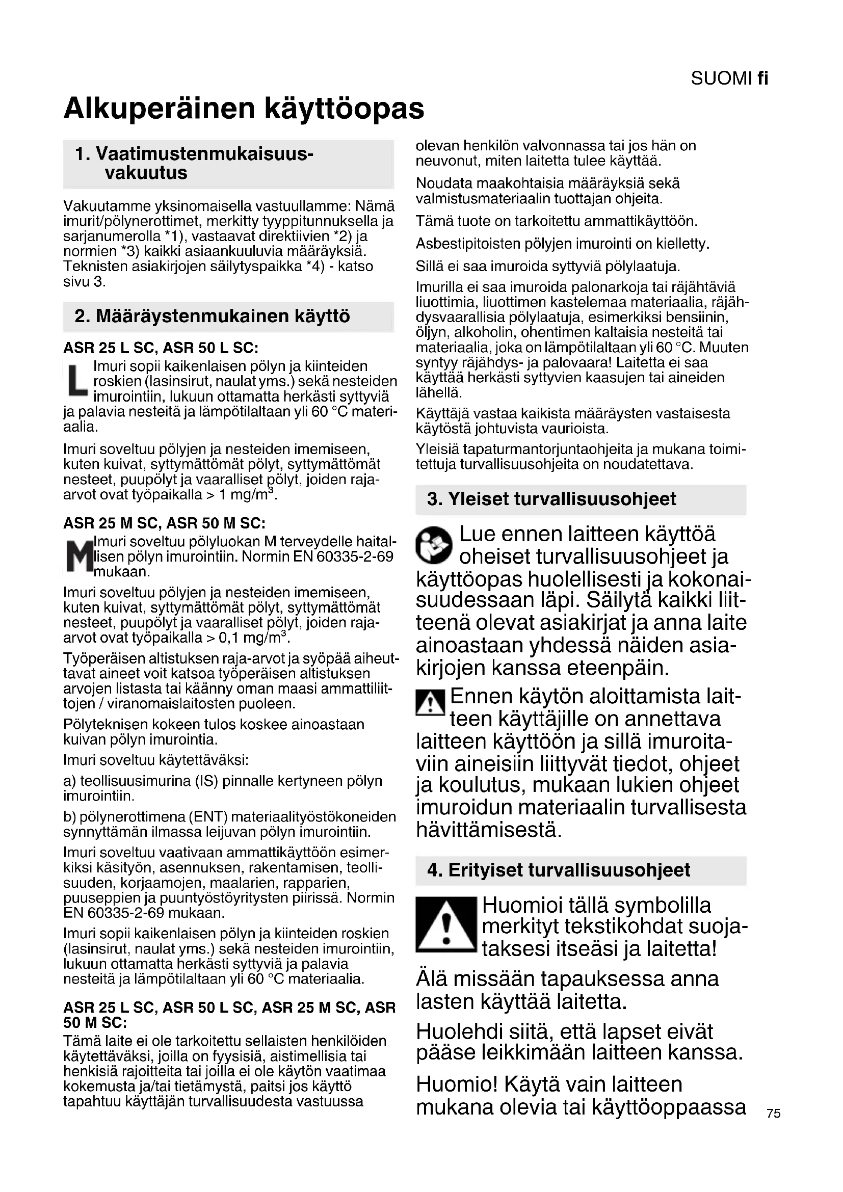 Alkuperäinen käyttöopas Vakuutamme yksinomaisella vastuullamme: Nämä imurit/pölynerottimet, merkitty tyyppitunnuksella ja sarjanumerolla *1), vastaavat direktiivien *2) ja normien *3) kaikki asiaankuuluvia määräyksiä. Teknisten asiakirjojen säilytyspaikka *4) - katso sivu 3. ASR 25 L SC, ASR 50 L SC: Imuri sopii kaikenlaisen pölyn ja kiinteiden roskien (lasinsirut, naulat yms.) sekä nesteiden imurointiin, lukuun ottamatta herkästi syttyviä ja palavia nesteitä ja lämpötilaltaan yli 60 °C materi- aalia. Imuri soveltuu pölyjen ja nesteiden imemiseen, kuten kuivat, syttymättömät pölyt, syttymättömät nesteet, puupölyt ja vaaralliset pölyt, joiden raja- arvot ovat työpaikalla > 1 mg/m³. ASR 25 M SC, ASR 50 M SC: Imuri soveltuu pölyluokan M terveydelle haital- lisen pölyn imurointiin. Normin EN 60335-2-69 mukaan. Imuri soveltuu pölyjen ja nesteiden imemiseen, kuten kuivat, syttymättömät pölyt, syttymättömät nesteet, puupölyt ja vaaralliset pölyt, joiden raja- arvot ovat työpaikalla > 0,1 mg/m³. Työperäisen altistuksen raja-arvot ja syöpää aiheut- tavat aineet voit katsoa työperäisen altistuksen arvojen listasta tai käänny oman maasi ammattiliit- tojen / viranomaislaitosten puoleen. Pölyteknisen kokeen tulos koskee ainoastaan kuivan pölyn imurointia. Imuri soveltuu käytettäväksi: a) teollisuusimurina (IS) pinnalle kertyneen pölyn imurointiin. b) pölynerottimena (ENT) materiaalityöstökoneiden synnyttämän ilmassa leijuvan pölyn imurointiin. Imuri soveltuu vaativaan ammattikäyttöön esimer- kiksi käsityön, asennuksen, rakentamisen, teolli- suuden, korjaamojen, maalarien, rapparien, puuseppien ja puuntyöstöyritysten piirissä. Normin EN 60335-2-69 mukaan. Imuri sopii kaikenlaisen pölyn ja kiinteiden roskien (lasinsirut, naulat yms.) sekä nesteiden imurointiin, lukuun ottamatta herkästi syttyviä ja palavia nesteitä ja lämpötilaltaan yli 60 °C materiaalia. ASR 25 L SC, ASR 50 L SC, ASR 25 M SC, ASR 50 M SC: Tämä laite ei ole tarkoitettu sellaisten henkilöiden käytettäväksi, joilla on fyysisiä, aistimellisia tai henkisiä rajoitteita tai joilla ei ole käytön vaatimaa kokemusta ja/tai tietämystä, paitsi jos käyttö tapahtuu käyttäjän turvallisuudesta vastuussa olevan henkilön valvonnassa tai jos hän on neuvonut, miten laitetta tulee käyttää. Noudata maakohtaisia määräyksiä sekä valmistusmateriaalin tuottajan ohjeita. Tämä tuote on tarkoitettu ammattikäyttöön. Asbestipitoisten pölyjen imurointi on kielletty. Sillä ei saa imuroida syttyviä pölylaatuja. Imurilla ei saa imuroida palonarkoja tai räjähtäviä liuottimia, liuottimen kastelemaa materiaalia, räjäh- dysvaarallisia pölylaatuja, esimerkiksi bensiinin, öljyn, alkoholin, ohentimen kaltaisia nesteitä tai materiaalia, joka on lämpötilaltaan yli 60 °C. Muuten syntyy räjähdys- ja palovaara! Laitetta ei saa käyttää herkästi syttyvien kaasujen tai aineiden lähellä. Käyttäjä vastaa kaikista määräysten vastaisesta käytöstä johtuvista vaurioista. Yleisiä tapaturmantorjuntaohjeita ja mukana toimi- tettuja turvallisuusohjeita on noudatettava. Lue ennen laitteen käyttöä oheiset turvallisuusohjeet ja käyttöopas huolellisesti ja kokonai- suudessaan läpi. Säilytä kaikki liit- teenä olevat asiakirjat ja anna laite ainoastaan yhdessä näiden asia- kirjojen kanssa eteenpäin. Ennen käytön aloittamista lait- teen käyttäjille on annettava laitteen käyttöön ja sillä imuroita- viin aineisiin liittyvät tiedot, ohjeet ja koulutus, mukaan lukien ohjeet imuroidun materiaalin turvallisesta hävittämisestä. Huomioi tällä symbolilla merkityt tekstikohdat suoja- taksesi itseäsi ja laitetta! Älä missään tapauksessa anna lasten käyttää laitetta. Huolehdi siitä, että lapset eivät pääse leikkimään laitteen kanssa. Huomio! Käytä vain laitteen mukana olevia tai käyttöoppaassa