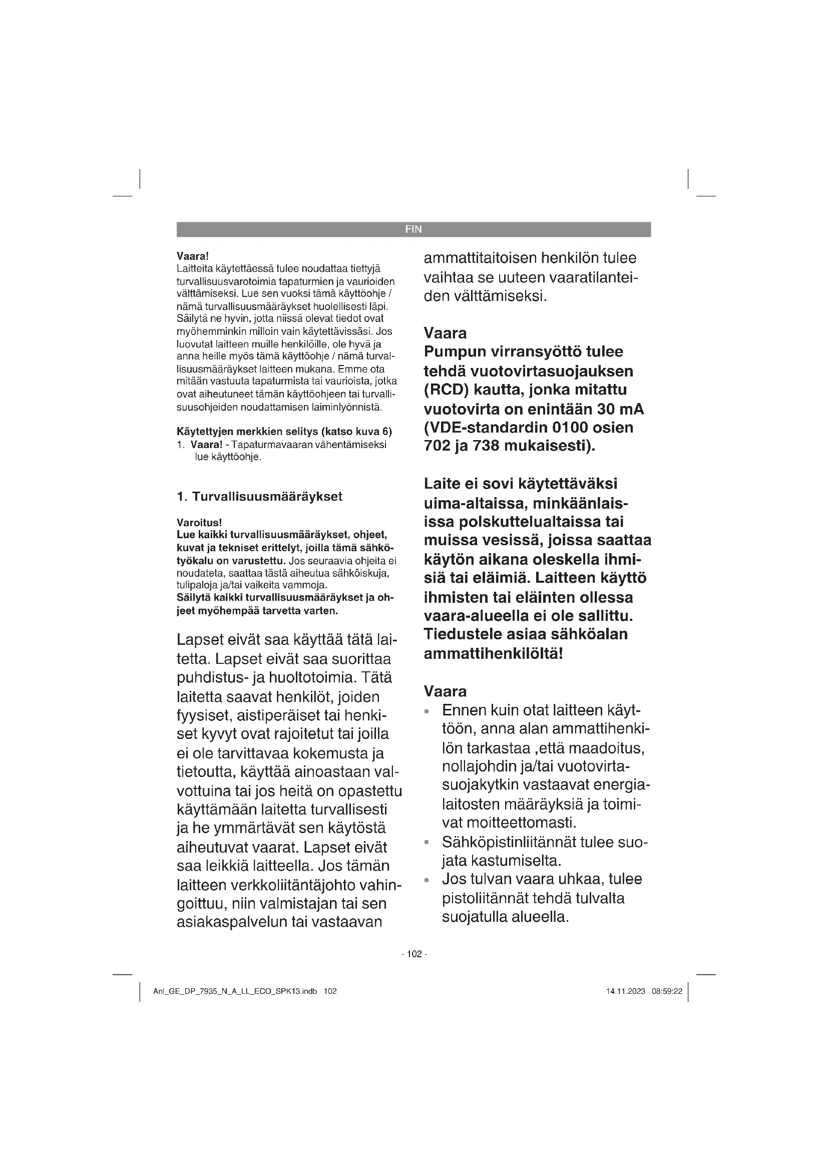 Jos tulvan vaara uhkaa, tulee pistoliitännät tehdä tulvalta suojatulla alueella. Anl_GE_DP_7935_N_A_LL_ECO_SPK13.indb 102Anl_GE_DP_7935_N_A_LL_ECO_SPK13.indb 102 14.11.2023 08:59:2214.11.2023 08:59:22FIN