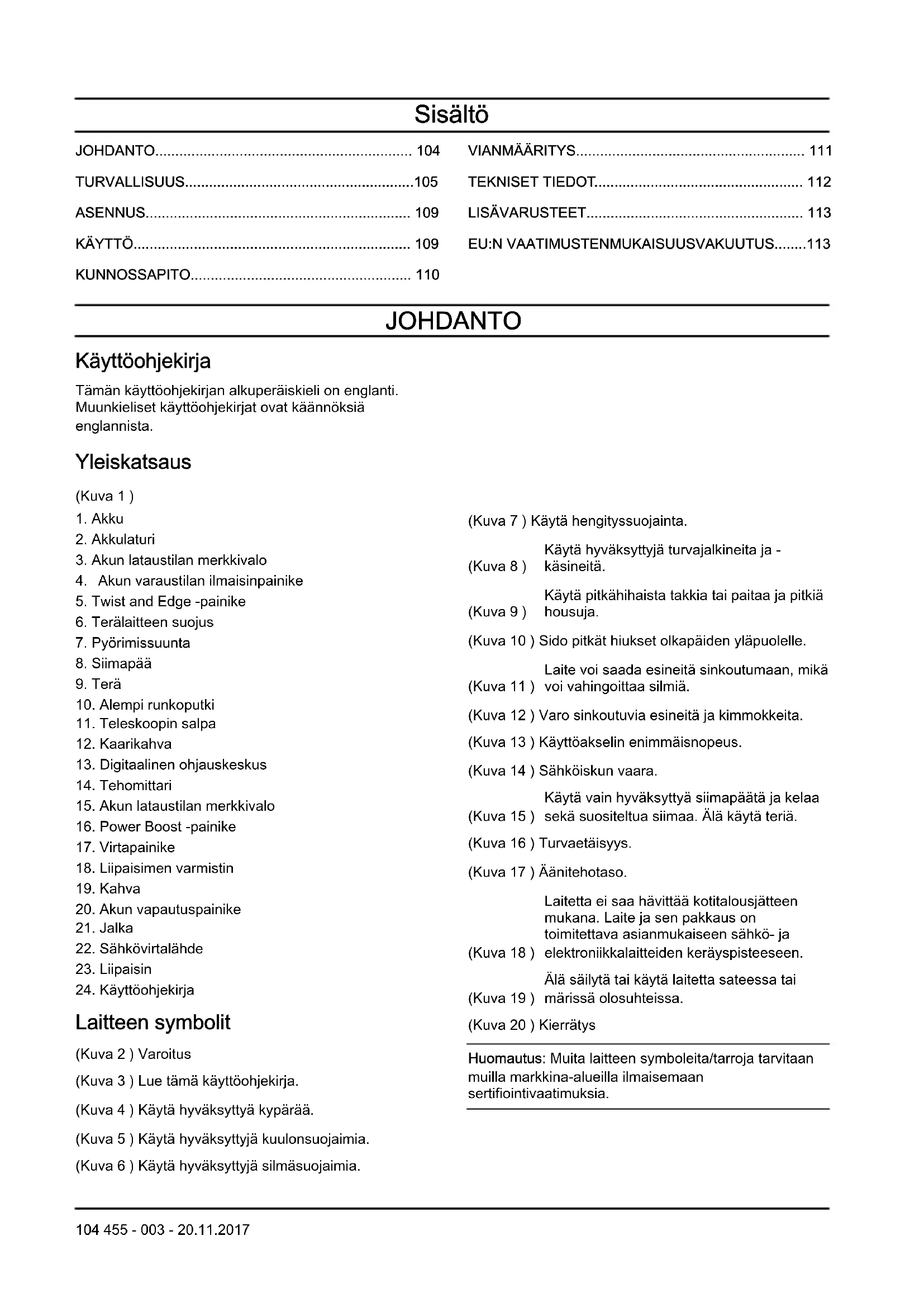 Laitteen symbolit (Kuva 2 ) Varoitus (Kuva 3 ) Lue tämä käyttöohjekirja. (Kuva 4 ) Käytä hyväksyttyä kypärää. (Kuva 5 ) Käytä hyväksyttyjä kuulonsuojaimia. (Kuva 6 ) Käytä hyväksyttyjä silmäsuojaimia. (Kuva 7 ) Käytä hengityssuojainta. (Kuva 8 ) Käytä hyväksyttyjä turvajalkineita ja - käsineitä. (Kuva 9 ) Käytä pitkähihaista takkia tai paitaa ja pitkiä housuja. (Kuva 10 ) Sido pitkät hiukset olkapäiden yläpuolelle. (Kuva 11 ) Laite voi saada esineitä sinkoutumaan, mikä voi vahingoittaa silmiä. (Kuva 12 ) Varo sinkoutuvia esineitä ja kimmokkeita. (Kuva 13 ) Käyttöakselin enimmäisnopeus. (Kuva 14 ) Sähköiskun vaara. (Kuva 15 ) Käytä vain hyväksyttyä siimapäätä ja kelaa sekä suositeltua siimaa. Älä käytä teriä. (Kuva 16 ) Turvaetäisyys. (Kuva 17 ) Äänitehotaso. (Kuva 18 ) Laitetta ei saa hävittää kotitalousjätteen mukana. Laite ja sen pakkaus on toimitettava asianmukaiseen sähkö- ja elektroniikkalaitteiden keräyspisteeseen. (Kuva 19 ) Älä säilytä tai käytä laitetta sateessa tai märissä olosuhteissa. (Kuva 20 ) Kierrätys Huomautus: Muita laitteen symboleita/tarroja tarvitaan muilla markkina-alueilla ilmaisemaan sertifiointivaatimuksia. 104 455 - 003 - 20.11.2017Tuotevastuu Tuotevastuulain mukaisesti emme ole vastuussa tuotteen aiheuttamasta vaurioista, jos