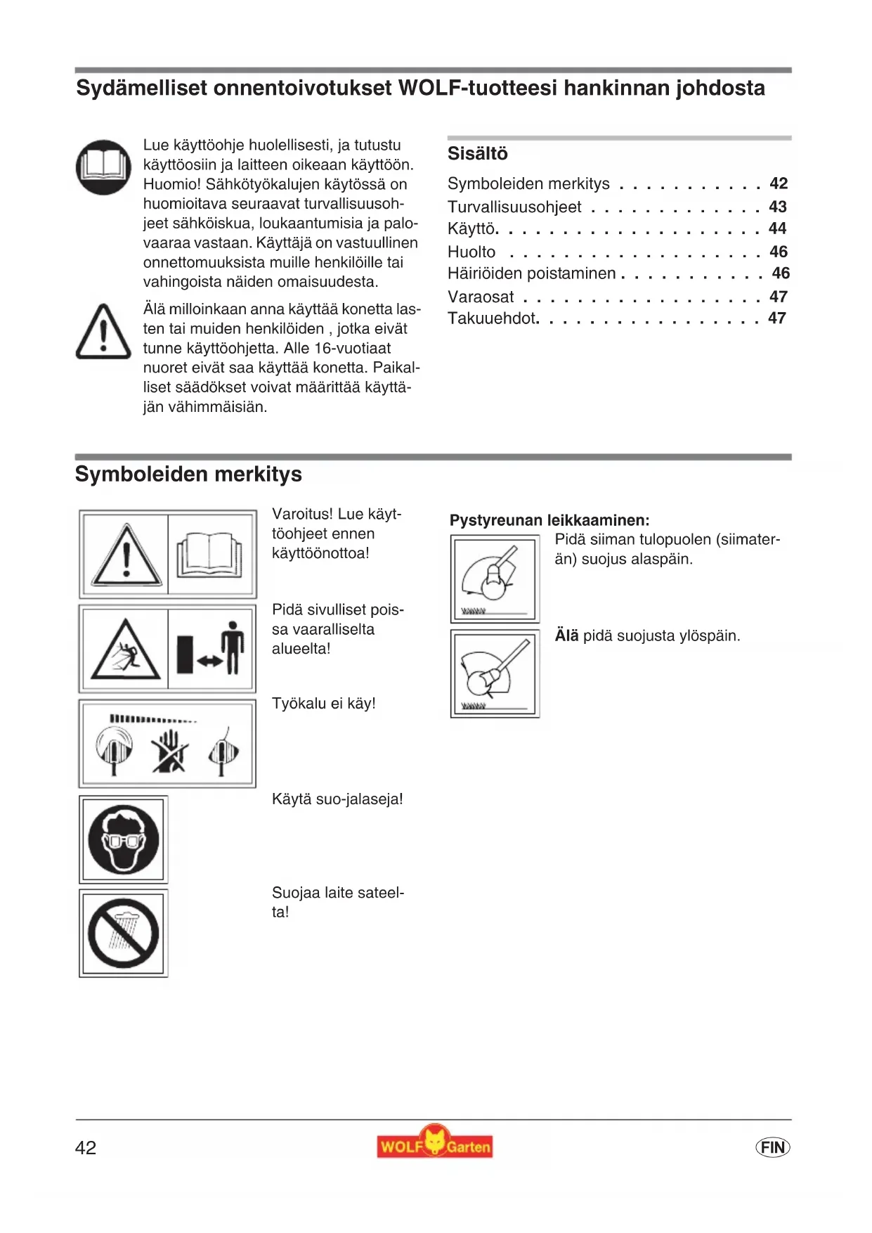 - f Sydämelliset onnentoivotukset WOLF-tuotteesi hankinnan johdosta Sisältö Symboleiden merkitys p. 42