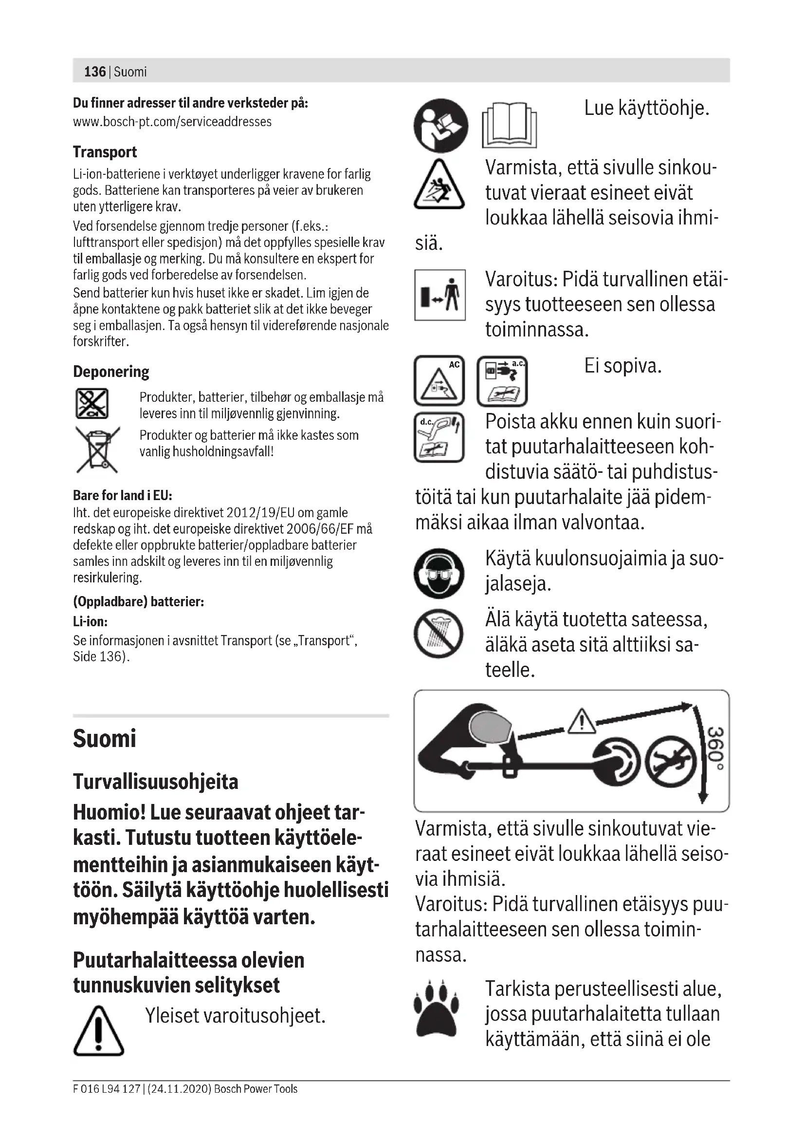 a.c. Ei sopiva. d.c. Poista akku ennen kuin suori- tat puutarhalaitteeseen koh- distuvia säätö- tai puhdistus- töitä tai kun puutarhalaite jää pidem- mäksi aikaa ilman valvontaa. Käytä kuulonsuojaimia ja suo- jalaseja. Älä käytä tuotetta sateessa, äläkä aseta sitä alttiiksi sa- teelle. Varmista, että sivulle sinkoutuvat vie- raat esineet eivät loukkaa lähellä seiso- via ihmisiä. Varoitus: Pidä turvallinen etäisyys puu- tarhalaitteeseen sen ollessa toimin- nassa. Tarkista perusteellisesti alue, jossa puutarhalaitetta tullaan käyttämään, että siinä ei ole F 016 L94 127 | (24.11.2020) Bosch Power ToolsSuomi | 137 villi- tai kotieläimiä. Villi- ja kotieläimet voivat loukkaantua koneen käytön ai- kana. Tarkista koneen käyttöalue pe- rusteellisesti ja poista kaikki kivet, ti- kut, langat, luut ja vieraat esineet. Katso konetta käytettäessä, että ti- heässä ruohossa ei ole villi- tai kotieläi- miä eikä pieniä oksanpätkiä piilossa. Yleiset sähkötyökalujen turvaohjeet u Lue kaikki tämän sähkötyökalun mukana toimitetut varoitukset, ohjeet, kuvat ja tekniset tiedot. Alla mainittujen ohjeiden noudatta- misen laiminlyönti saattaa aiheuttaa sähköiskun, tulipalon ja/tai vakavan loukkaantumisen. u Säilytä kaikki turvallisuusohjeet ja muut ohjeet tulevaisuutta varten. u Turvallisuusohjeissa käytetty käsite "sähkötyökalu" käsittää verkkokäyt- töisiä sähkötyökaluja (verkkojoh- dolla) ja akkukäyttöisiä sähkötyöka- luja (ilman verkkojohtoa). Työpaikan turvallisuus u Pidä työskentelyalue puhtaana ja hyvin valaistuna. Työpaikan epäjär- jestys tai valaisemattomat työalueet voivat johtaa tapaturmiin. u Älä työskentele sähkötyökalulla räjähdysalttiissa ympäristössä, jossa on palavaa nestettä, kaasua tai pölyä. Sähkötyökalu muodostaa kipinöitä, jotka saattavat sytyttää pö- lyn tai höyryn. u Pidä lapset ja sivulliset loitolla sähkötyökalua käyttäessäsi. Voit menettää laitteen hallinnan, jos suuntaat huomiosi muualle. Sähköturvallisuus u Sähkötyökalun pistotulpan tulee sopia pistorasiaan. Pistotulppaa ei saa muuttaa millään tavalla. Älä käytä minkäänlaisia pistorasia- adaptereita maadoitettujen sähkö- työkalujen kanssa. Alkuperäisessä kunnossa olevat pistotulpat ja sopi- vat pistorasiat vähentävät sähköis- kun vaaraa. u Vältä maadoitettujen pintojen, ku- ten putkien, pattereiden, liesien tai jääkaappien koskettamista. Sähköiskun vaara kasvaa, jos kehosi on maadoitettu. u Älä altista sähkötyökalua sateelle tai kosteudelle. Veden pääsy säh- kötyökalun sisään kasvattaa sähköis- kun riskiä. u Älä käytä verkkojohtoa väärin. Älä käytä johtoa sähkötyökalun kanta- miseen, ripustamiseen tai pistotul- pan irrottamiseen pistorasiasta vetämällä. Pidä johto loitolla kuu- muudesta, öljystä, terävistä reu- noista ja liikkuvista osista. Vahin- goittuneet tai sotkeutuneet johdot kasvattavat sähköiskun vaaraa. u Käyttäessäsi sähkötyökalua ul- kona käytä ainoastaan ulkokäyt- töön soveltuvaa jatkojohtoa. Ulko- Bosch Power Tools F 016 L94 127 | (24.11.2020)138 | Suomi käyttöön soveltuvan jatkojohdon käyttö pienentää sähköiskun vaaraa. u Jos sähkötyökalua on pakko käyt- tää kosteassa ympäristössä, on käytettävä vikavirtasuojakyt- kintä. Vikavirtasuojakytkimen käyttö vähentää sähköiskun vaaraa. Henkilöturvallisuus u Ole valpas, kiinnitä huomiota työs- kentelyysi ja noudata tervettä jär- keä sähkötyökalua käyttäessäsi. Älä käytä mitään sähkötyökalua, jos olet väsynyt tai huumeiden, al- koholin tai lääkkeiden vaikutuksen alaisena. Hetken tarkkaamattomuus sähkötyökalua käytettäessä saattaa johtaa vakavaan loukkaantumiseen. u Käytä henkilökohtaisia suojava- rusteita. Käytä aina suojalaseja. Henkilökohtaisen suojavarustuksen (esim. pölynaamari, luistamattomat turvajalkineet, suojakypärä tai kuu- lonsuojaimet kulloisenkin tehtävän mukaan) käyttö vähentää loukkaan- tumisriskiä. u Estä tahaton käynnistyminen. Varmista, että käynnistyskytkin on kytketty pois päältä ennen kuin yhdistät työkalun sähköverkkoon ja/tai akkuun, otat työkalun kä- teen tai kannat sitä. Jos kannat sähkötyökalua sormi käynnistyskyt- kimellä tai kytket sähkötyökalun pis- totulpan pistorasiaan käynnistyskyt- kimen ollessa käyntiasennossa, altis- tat itsesi onnettomuuksille. u Poista mahdollinen säätötyökalu tai kiinnitysavain ennen kuin käyn- nistät sähkötyökalun. Kiinnitysa- vain tai säätötyökalu, joka on unoh- dettu paikalleen sähkötyökalun pyö- rivään osaan, saattaa aiheuttaa tapa- turman. u Vältä kurkottelua. Huolehdi aina tukevasta seisoma-asennosta ja tasapainosta. Näin pystyt parem- min hallitsemaan sähkötyökalun odottamattomissa tilanteissa. u Käytä tarkoitukseen soveltuvia vaatteita. Älä käytä löysiä työ- vaatteita tai koruja. Pidä hiukset ja vaatteet poissa liikkuvien osien ulottuvilta. Väljät vaatteet, korut ja pitkät hiukset voivat takertua liikku- viin osiin. u Jos laitteissa on pölynpoistolii- täntä, varmista, että se on kyt- ketty oikein ja toimii kunnolla. Pö- lynpoistojärjestelmän käyttö vähen- tää pölyn aiheuttamia vaaroja. u Työskentele keskittyneesti ja nou- data aina turvallisuusmääräyksiä. Hetkellinenkin huolimattomuus voi aiheuttaa vakavia vammoja. Sähkötyökalun käyttö ja huolto u Älä ylikuormita laitetta. Käytä ky- seiseen työhön tarkoitettua sähkö- työkalua. Sopivan tehoisella sähkö- työkalulla teet työt paremmin ja tur- vallisemmin. u Älä käytä sähkötyökalua, jota ei voida käynnistää ja pysäyttää F 016 L94 127 | (24.11.2020) Bosch Power ToolsSuomi | 139 käynnistyskytkimestä. Sähkötyö- kalu, jota ei voi enää hallita käynnis- tyskytkimellä, on vaarallinen ja täy- tyy korjauttaa. u Irrota pistotulppa pistorasiasta ja/ tai irrota akku (jos irrotettava) sähkötyök