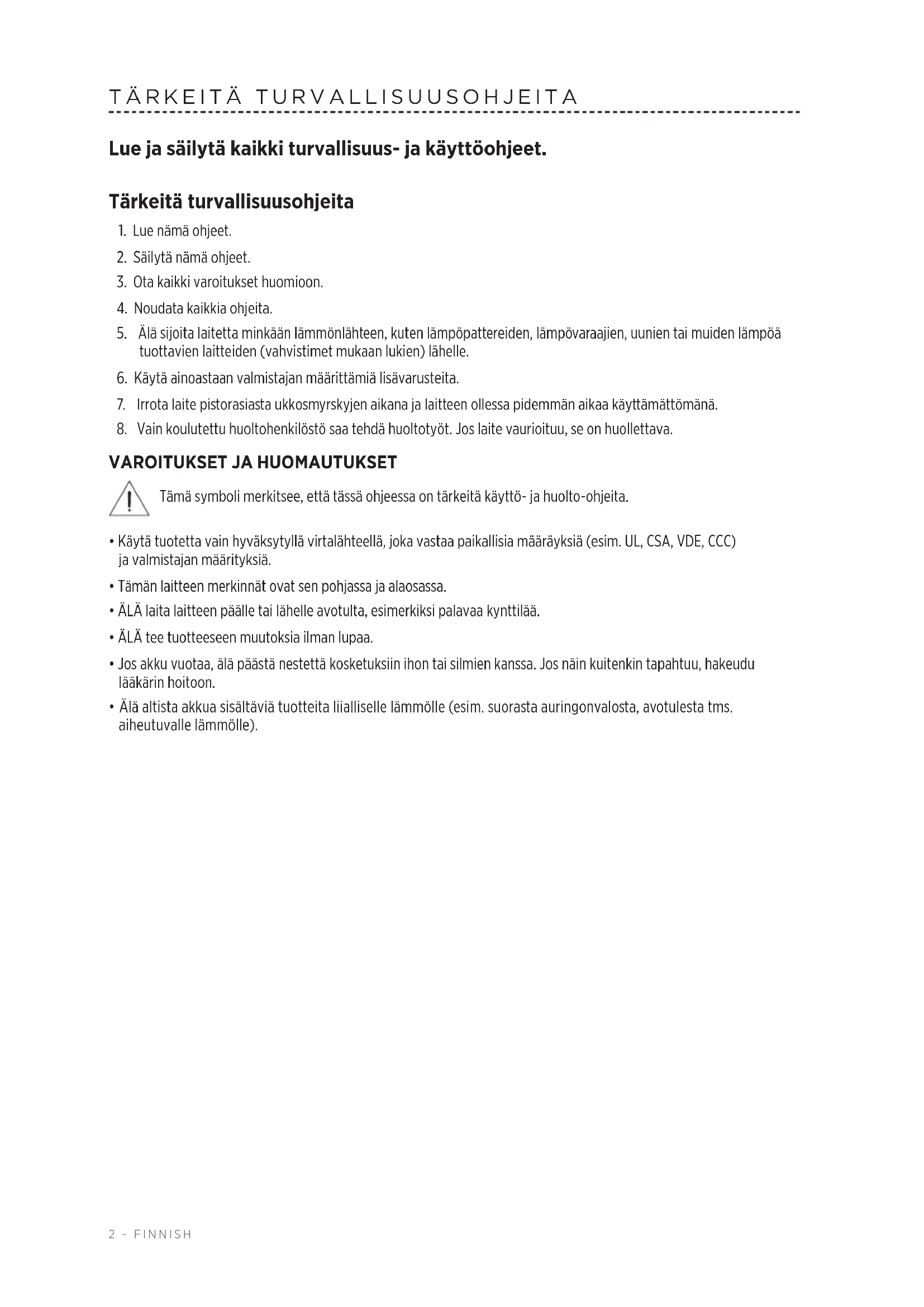 - Älä altista akkua sisältäviä tuotteita liialliselle lämmölle (esim. suorasta auringonvalosta, avotulesta tms. aiheutuvalle lämmölle).FINNISH - 3