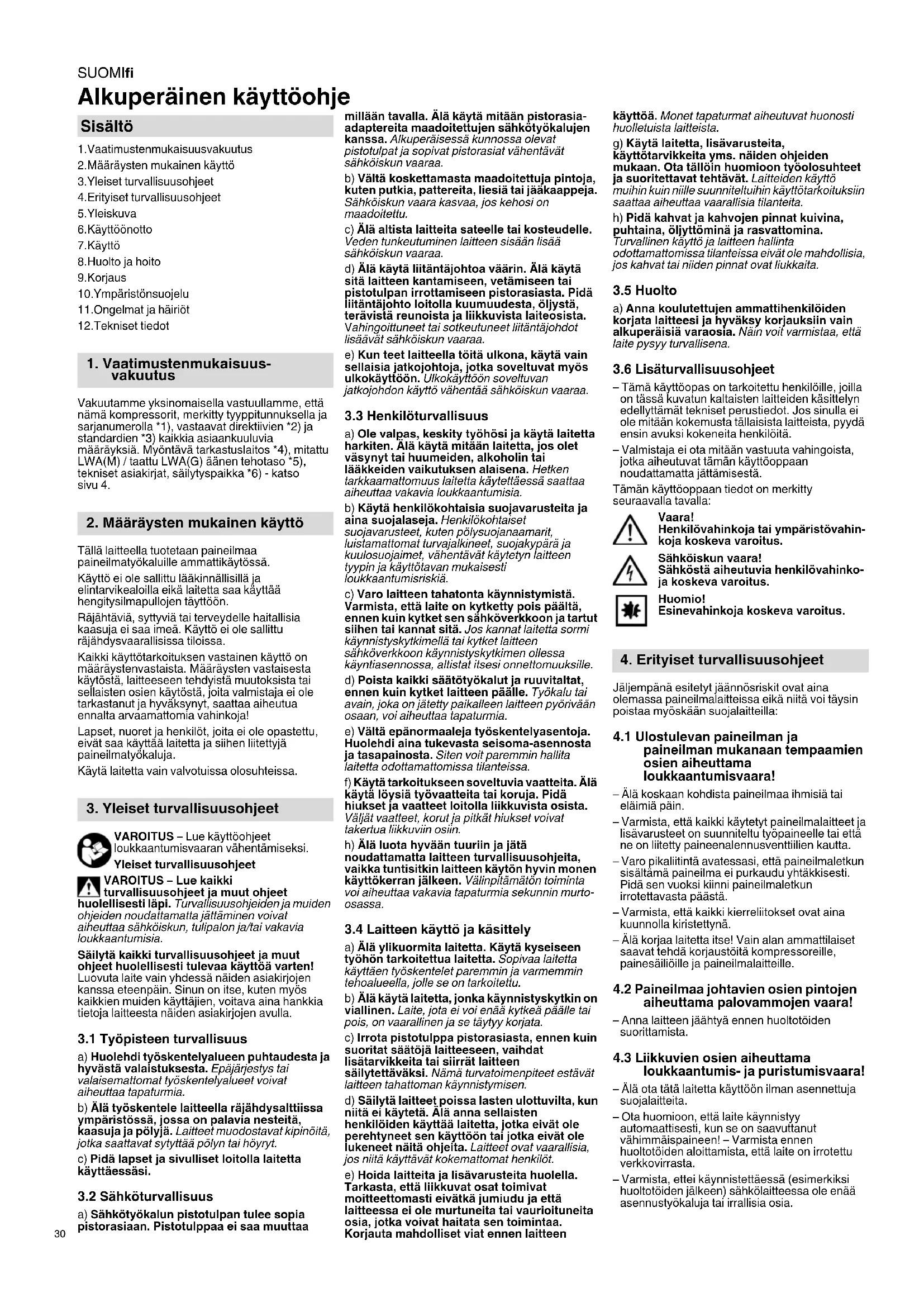 Alkuperäinen käyttöohje 1.Vaatimustenmukaisuusvakuutus 2.Määräysten mukainen käyttö 3.Yleiset turvallisuusohjeet 4.Erityiset turvallisuusohjeet 5.Yleiskuva 6.Käyttöönotto 7.Käyttö 8.Huolto ja hoito 9.Korjaus 10.Ympäristönsuojelu 11.Ongelmat ja häiriöt 12.Tekniset tiedot Vakuutamme yksinomaisella vastuullamme, että nämä kompressorit, merkitty tyyppitunnuksella ja sarjanumerolla *1), vastaavat direktiivien *2) ja standardien *3) kaikkia asiaankuuluvia määräyksiä. Myöntävä tarkastuslaitos *4), mitattu LWA(M) / taattu LWA(G) äänen tehotaso *5), tekniset asiakirjat, säilytyspaikka *6) - katso sivu 4. Tällä laitteella tuotetaan paineilmaa paineilmatyökaluille ammattikäytössä. Käyttö ei ole sallittu lääkinnällisillä ja elintarvikealoilla eikä laitetta saa käyttää hengitysilmapullojen täyttöön. Räjähtäviä, syttyviä tai terveydelle haitallisia kaasuja ei saa imeä. Käyttö ei ole sallittu räjähdysvaarallisissa tiloissa. Kaikki käyttötarkoituksen vastainen käyttö on määräystenvastaista. Määräysten vastaisesta käytöstä, laitteeseen tehdyistä muutoksista tai sellaisten osien käytöstä, joita valmistaja ei ole tarkastanut ja hyväksynyt, saattaa aiheutua ennalta arvaamattomia vahinkoja! Lapset, nuoret ja henkilöt, joita ei ole opastettu, eivät saa käyttää laitetta ja siihen liitettyjä paineilmatyökaluja. Käytä laitetta vain valvotuissa olosuhteissa. VAROITUS – Lue käyttöohjeet loukkaantumisvaaran vähentämiseksi. Yleiset turvallisuusohjeet VAROITUS – Lue kaikki turvallisuusohjeet ja muut ohjeet huolellisesti läpi. Turvallisuusohjeiden ja muiden ohjeiden noudattamatta jättäminen voivat aiheuttaa sähköiskun, tulipalon ja/tai vakavia loukkaantumisia. Säilytä kaikki turvallisuusohjeet ja muut ohjeet huolellisesti tulevaa käyttöä varten! Luovuta laite vain yhdessä näiden asiakirjojen kanssa eteenpäin. Sinun on itse, kuten myös kaikkien muiden käyttäjien, voitava aina hankkia tietoja laitteesta näiden asiakirjojen avulla.