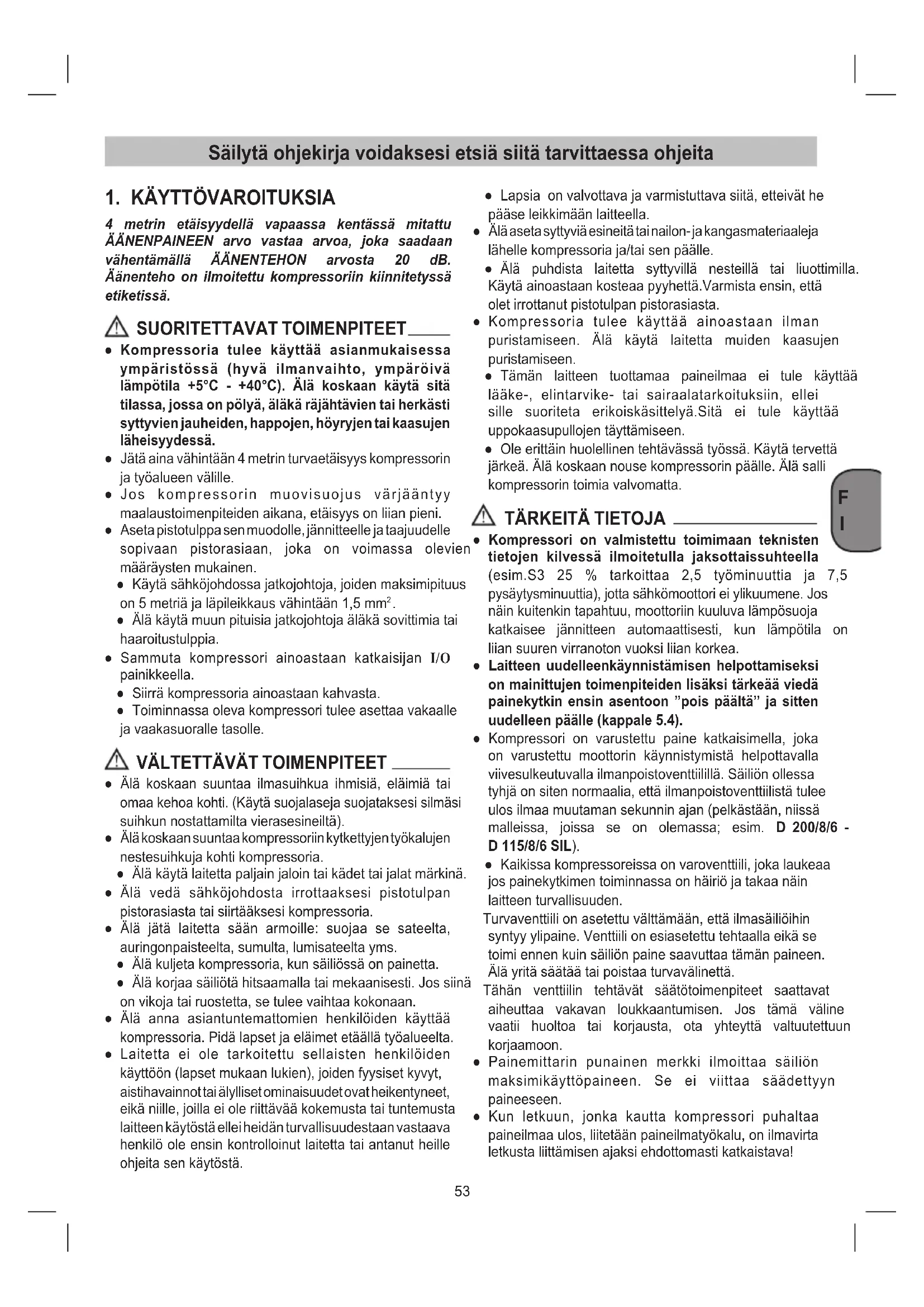 4 metrin etäisyydellä vapaassa kentässä mitattu ÄÄNENPAINEEN arvo vastaa arvoa, joka saadaan vähentämällä ÄÄNENTEHON arvosta 20 dB. Äänenteho on ilmoitettu kompressoriin kiinnitetyssä etiketissä. SUORITETTAVAT TOIMENPITEET ● Kompressoria tulee käyttää asianmukaisessa ympäristössä (hyvä ilmanvaihto, ympäröivä lämpötila +5°C - +40°C). Älä koskaan käytä sitä tilassa, jossa on pölyä, äläkä räjähtävien tai herkästi syttyvien jauheiden, happojen, höyryjen tai kaasujen läheisyydessä. ● Jätä aina vähintään 4 metrin turvaetäisyys kompressorin jatyöalueenvälille. ● Jos kompressorin muovisuojus värjääntyy maalaustoimenpiteidenaikana,etäisyysonliianpieni. ● Asetapistotulppasenmuodolle,jännitteellejataajuudelle sopivaan pistorasiaan, joka on voimassa olevien määräystenmukainen. ● Käytäsähköjohdossajatkojohtoja,joidenmaksimipituus on5metriäjaläpileikkausvähintään1,5mm