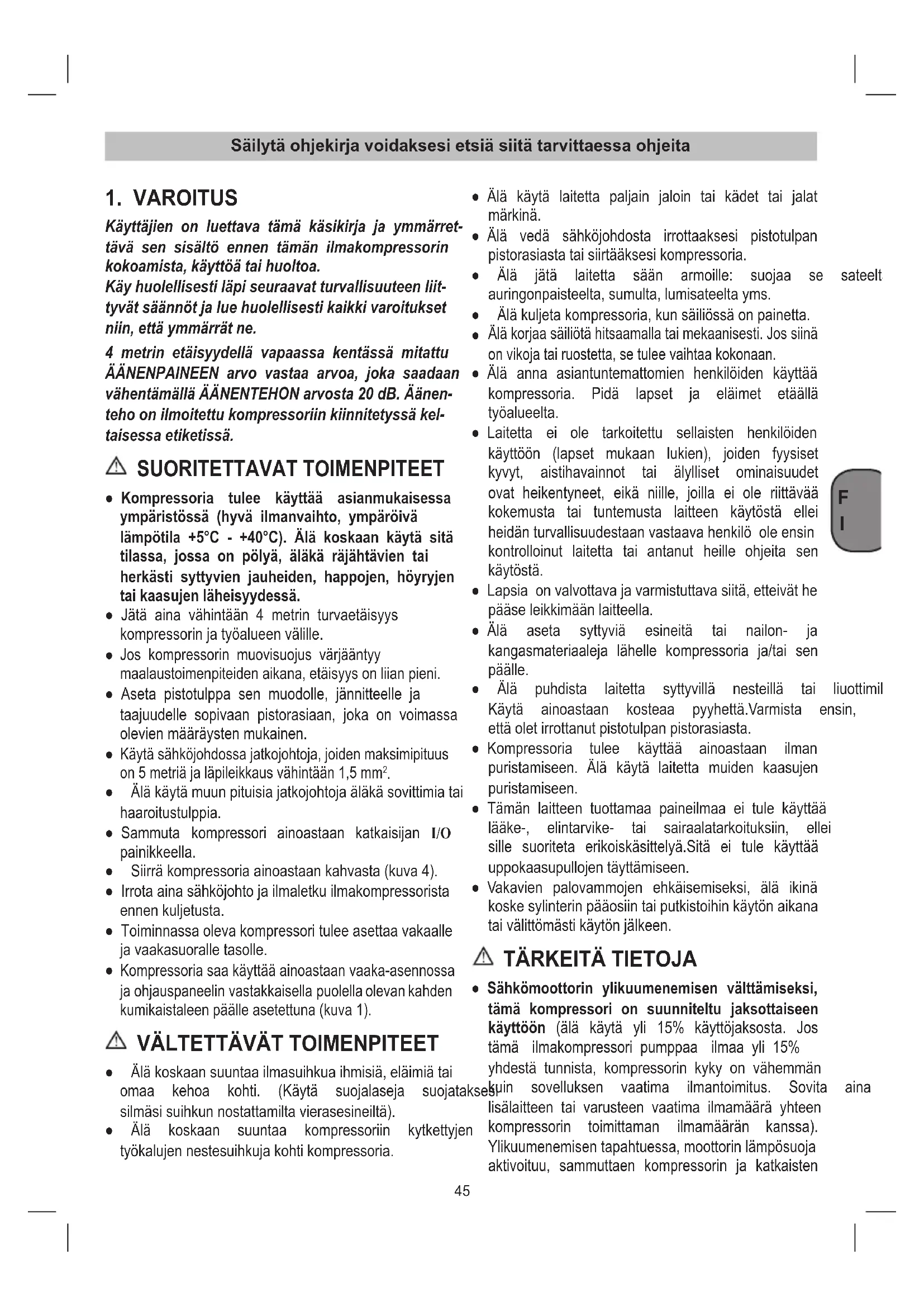 Käyttäjien on luettava tämä käsikirja ja ymmärret- tävä sen sisältö ennen tämän ilmakompressorin kokoamista, käyttöä tai huoltoa. Käy huolellisesti läpi seuraavat turvallisuuteen liit- tyvät säännöt ja lue huolellisesti kaikki varoitukset niin, että ymmärrät ne. 4 metrin etäisyydellä vapaassa kentässä mitattu ÄÄNENPAINEEN arvo vastaa arvoa, joka saadaan vähentämällä ÄÄNENTEHON arvosta 20 dB. Äänen- teho on ilmoitettu kompressoriin kiinnitetyssä kel- taisessa etiketissä. SUORITETTAVAT TOIMENPITEET ● Kompressoria tulee käyttää asianmukaisessa ympäristössä (hyvä ilmanvaihto, ympäröivä lämpötila +5°C - +40°C). Älä koskaan käytä sitä tilassa, jossa on pölyä, äläkä räjähtävien tai herkästi syttyvien jauheiden, happojen, höyryjen tai kaasujen läheisyydessä. ● Jätä aina vähintään 4 metrin turvaetäisyys kompressorinjatyöalueenvälille.