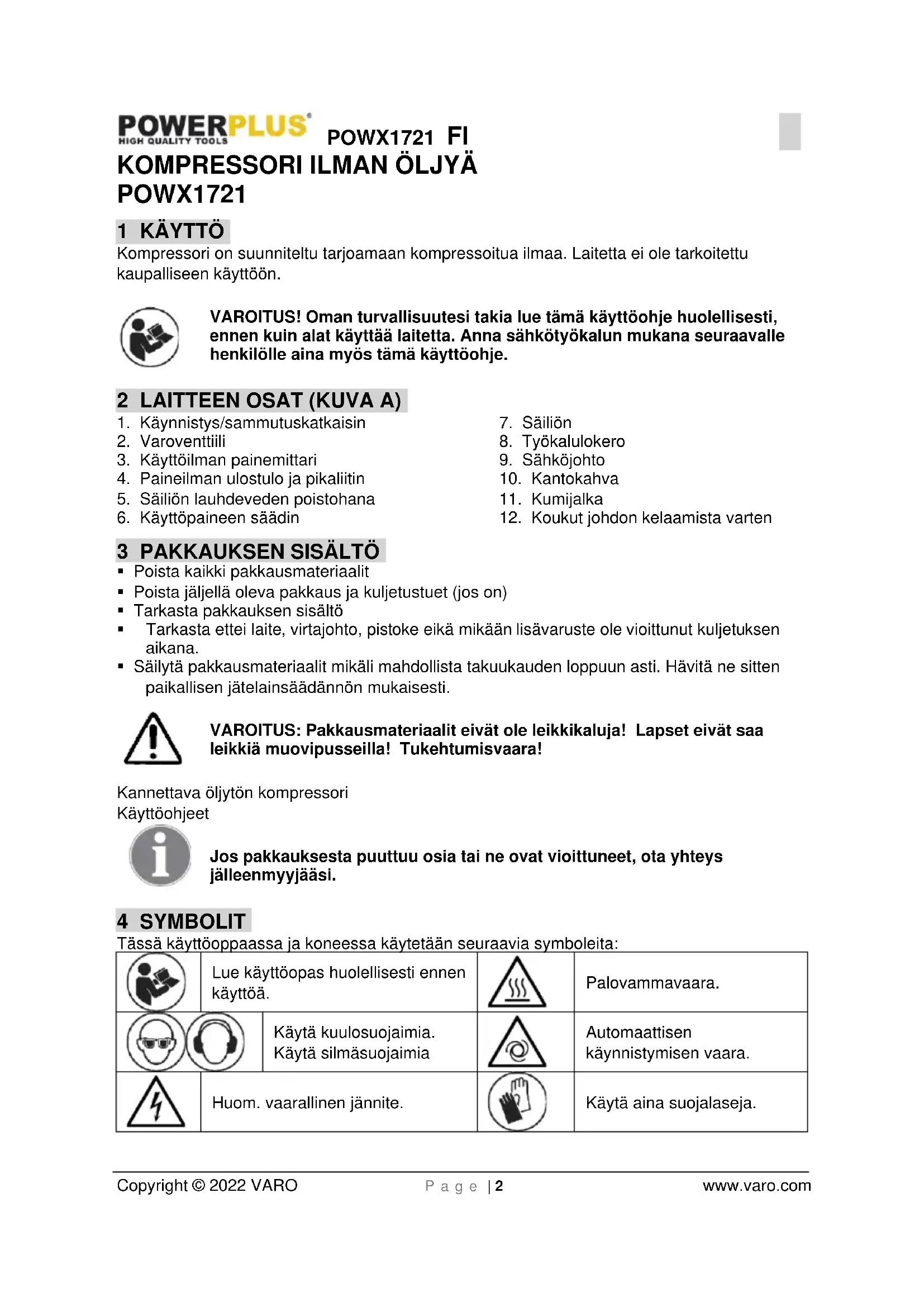 - Kompressoria tulee käyttää asianmukaisessa ympäristössä (hyvä ilmastointi, ympäröivä lämpötila +5°C - +40°C). Älä koskaan käytä sitä pölyjen, happojen, höyryjen tai räjähdysvaarallisten tai syttyvien kaasujen läheisyydessä.POWX1721 FI Copyright © 2022 VARO P a g e | 5 www.varo.com