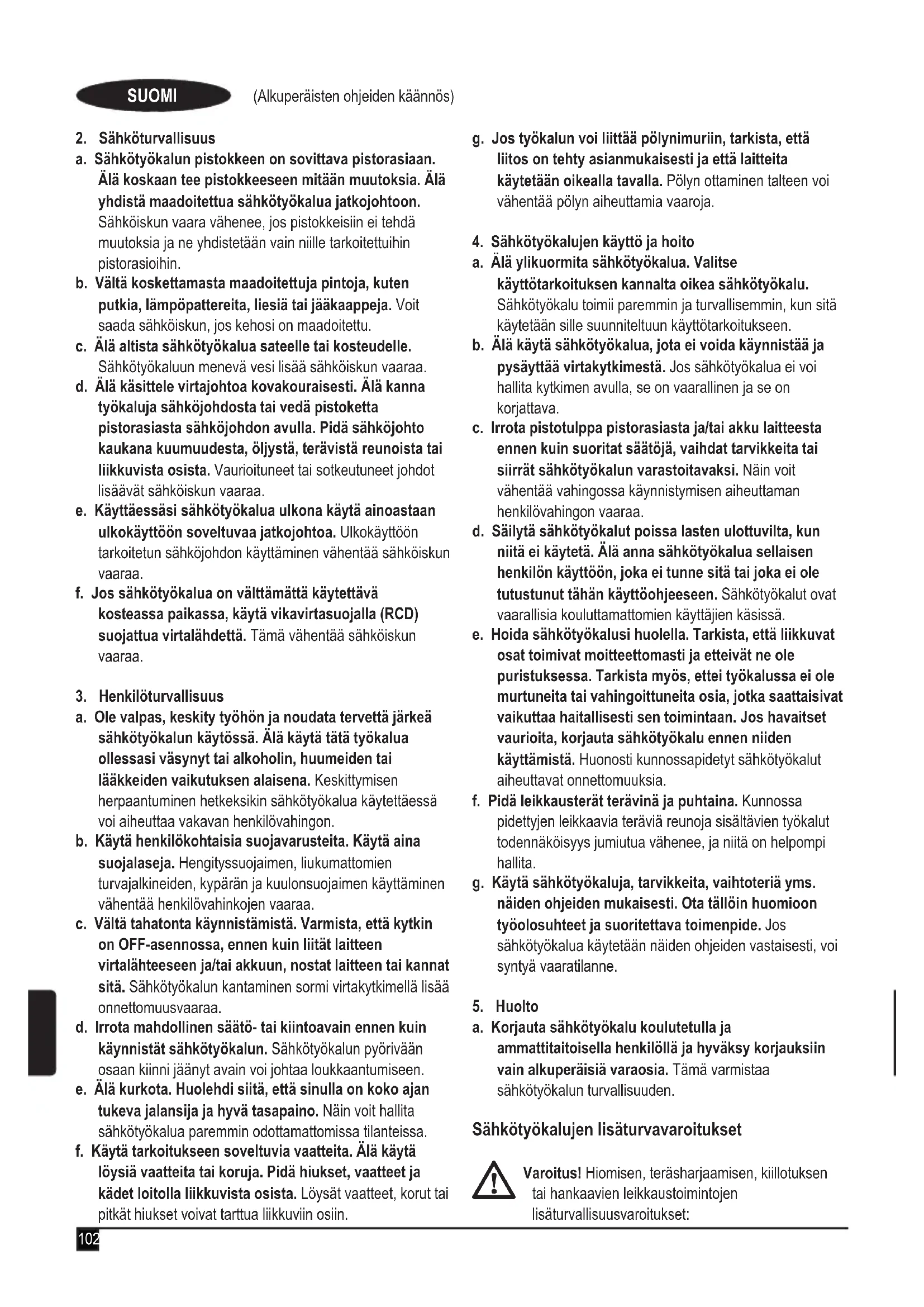 a. Pidä työalue puhtaana ja hyvin valaistuna. Onnettomuuksia sattuu herkemmin epäsiistissä tai huonosti valaistussa ympäristössä. b. Älä käytä sähkötyökalua räjähdysalttiissa ympäristössä, jossa on syttyvää nestettä, kaasua tai pölyä. Sähkötyökalujen aiheuttamat kipinät voivat sytyttää pölyn tai kaasut. c. Pidä lapset ja sivulliset loitolla sähkötyökalua käyttäessäsi. Keskittymiskyvyn herpaantuminen voi aiheuttaa hallinnan menettämisen.102 (Alkuperäisten ohjeiden käännös) SUOMI
