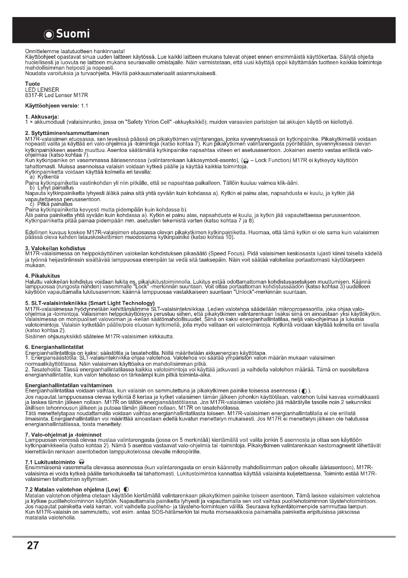 M17R-valaisimessa hyödynnetään kehittämämme SLT-valaisinteknikkaa. Ledien valotehoa saedellän mikroprosessorilla, joka ohjaa valohjelmia ja -toiminta ja. Valaisimen heppokaytöisyss perustu siihen, etta pikakytkimen valintarenkaan lisäksi siina on ainoastaan yksi käytökykin. Valaisimessa on monipuoliset valovoiman ja -keilän saatomahdollisuudet. Siina on kaksi energianhallintatila, nelja valo-ohjelmaa ja lukuisia valotoiminta ja. Valaisin kytkætan paälle/pois etuosan kytkimella, jolla myos valitaan eri valotoiminta. Kytkintä voidaan käytä kolmella eri tavalla (katso kohtaa 2).