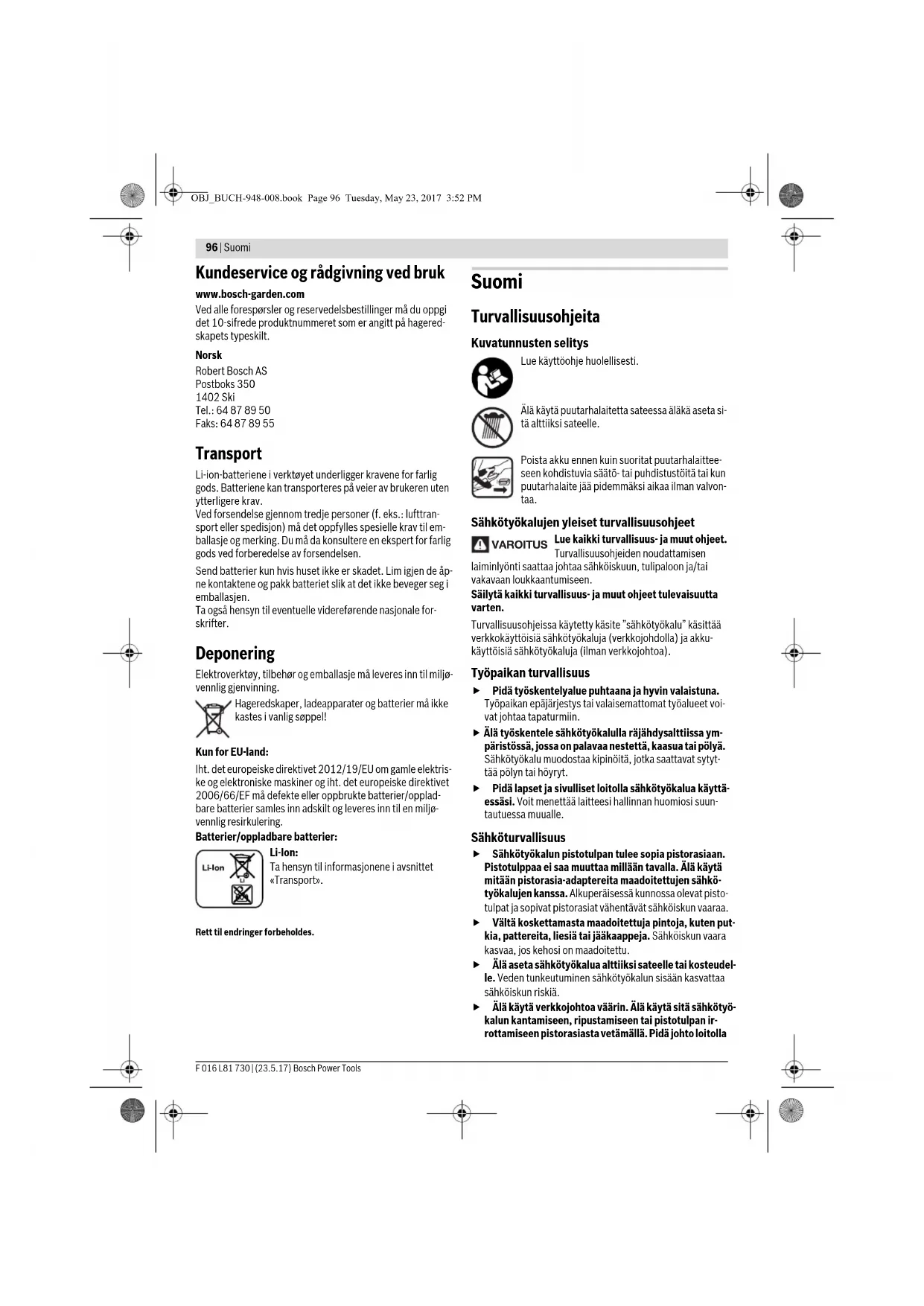 - riippuen käytetystä akusta OBJ_BUCH-948-008.book Page 100 Tuesday, May 23, 2017 3:52 PMSuomi | 101 Bosch Power Tools F 016 L81 730 | (23.5.17) Älä käytä 4,0 Ah akkua tässä sähkötyökalussa. Melu-/tärinätiedot Melun mittausarvot on määritetty EN 60745-2-15 mukaan. Laitteen tyypillinen A-painotettu melutaso on: äänen paineta- so 67 dB(A); äänen tehotaso 87 dB(A). Epävarmuus K =3 dB. Käytä kuulonsuojaimia! Värähtelyn yhteisarvot a