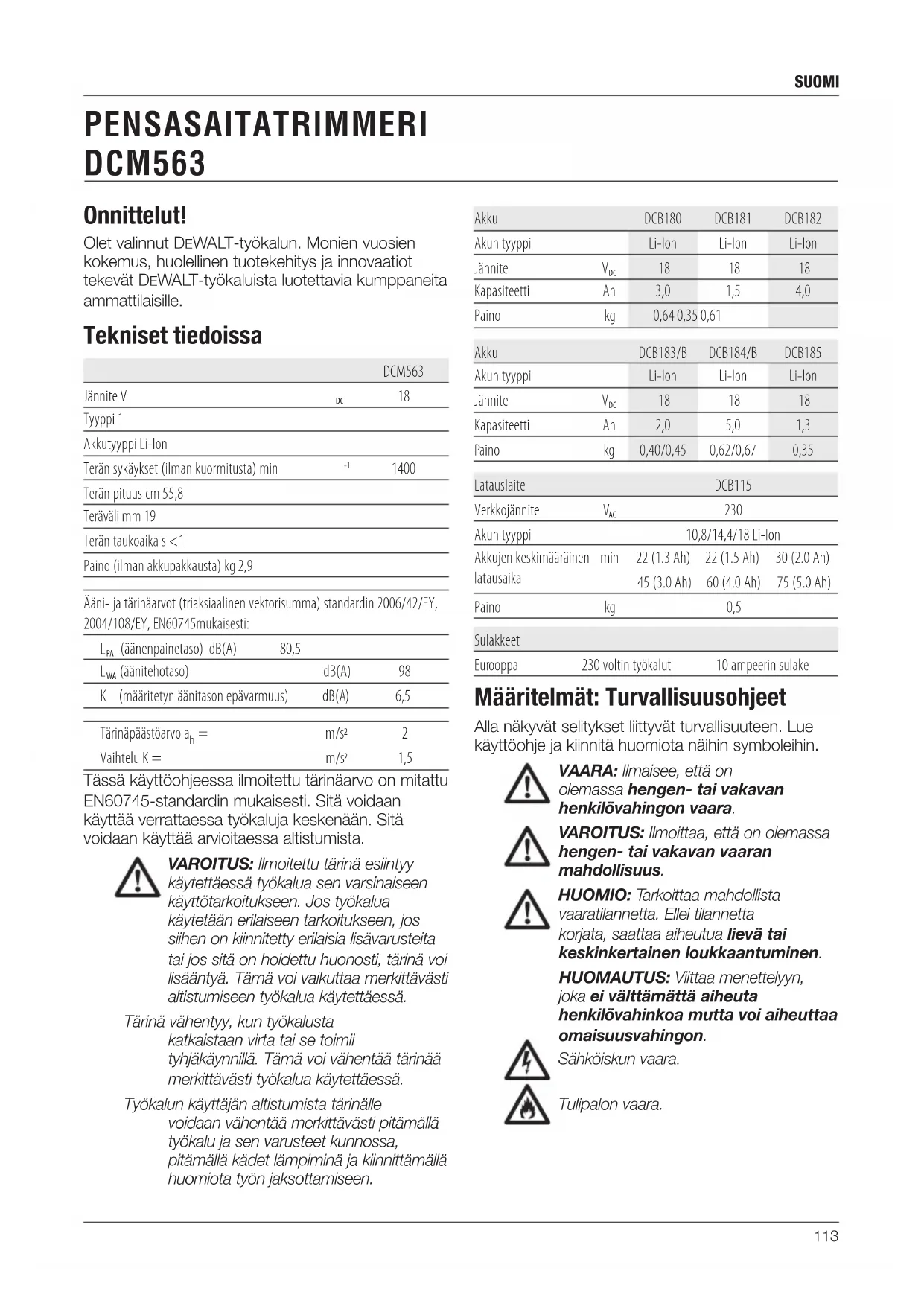 Akun tyyppi 10,8/14,4/18 Li-Ion Akkujen keskimääräinen latausaika min 22 (1.3 Ah) 22 (1.5 Ah) 30 (2.0 Ah) 45 (3.0 Ah) 60 (4.0 Ah) 75 (5.0 Ah) Paino kg 0,5 Sulakkeet Eurooppa 230 voltin työkalut 10 ampeerin sulake Määritelmät: Turvallisuusohjeet Alla näkyvät selitykset liittyvät turvallisuuteen. Lue käyttöohje ja kiinnitä huomiota näihin symboleihin. VAARA: Ilmaisee, että on olemassa hengen- tai vakavan henkilövahingon vaara. VAROITUS: Ilmoittaa, että on olemassa hengen- tai vakavan vaaran mahdollisuus. HUOMIO: Tarkoittaa mahdollista vaaratilannetta. Ellei tilannetta korjata, saattaa aiheutua lievä tai keskinkertainen loukkaantuminen. HUOMAUTUS: Viittaa menettelyyn, joka ei välttämättä aiheuta henkilövahinkoa mutta voi aiheuttaa omaisuusvahingon. Sähköiskun vaara. Tulipalon vaara.114 suomi EY-yhdenmukaisuusilmoitus KONEDIREKTIIVI ULKOMELUDIREKTIIVI PENSASAITATRIMMERI DCM563 DeWALT erklærer, at produkterne beskrevet under Tekniske data er udformet i overensstemmelse med: 2006/42/EC, EN 60745-1:2009 + A11:2010; EN 60745-2-15:2009 + A1:2010 2000/14/EY, Puhallin, Liite VI DEKRA Certification B.V., Utrechtseweg 310, 6802 ED Arnhem, Alankomaat Ilmoitetun laitoksen tunnusnro: 0344 Äänitehon taso 2000/14/EY:n mukaan (artikkeli 13, liite III):