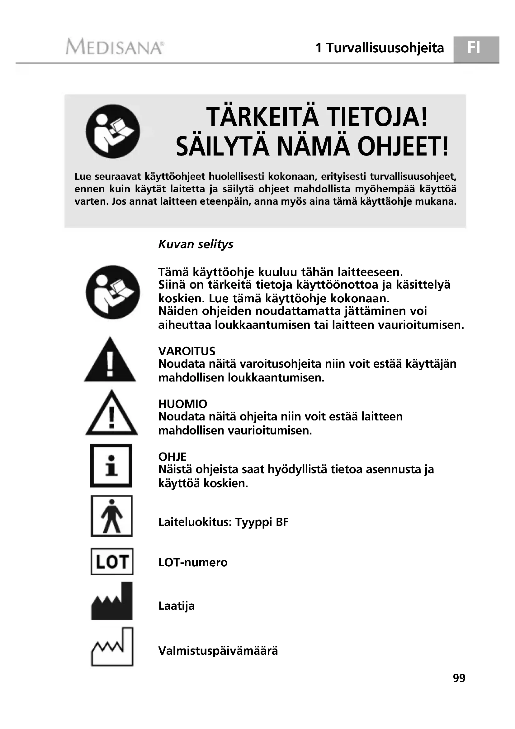 TÄRKEITÄ TIETOJA! SÄILYTÄ NÄMÄ OHJEET! Kuvan selitys Tämä käyttöohje kuuluu tähän laitteeseen. Siinä on tärkeitä tietoja käyttöönottoa ja käsittelyä koskien. Lue tämä käyttöohje kokonaan. Näiden ohjeiden noudattamatta jättäminen voi aiheuttaa loukkaantumisen tai laitteen vaurioitumisen. VAROITUS Noudata näitä varoitusohjeita niin voit estää käyttäjän mahdollisen loukkaantumisen. HUOMIO Noudata näitä ohjeita niin voit estää laitteen mahdollisen vaurioitumisen. OHJE Näistä ohjeista saat hyödyllistä tietoa asennusta ja käyttöä koskien. Laiteluokitus: Tyyppi BF LOT-numero Laatija Valmistuspäivämäärä Lue seuraavat käyttöohjeet huolellisesti kokonaan, erityisesti turvallisuusohjeet,ennen kuin käytät laitetta ja säilytä ohjeet mahdollista myöhempää käyttöävarten. Jos annat laitteen eteenpäin, anna myös aina tämä käyttäohje mukana. MTP_Pro_51090_3MAM_West_21082017_Blutdruckmessgerät 21.08.17 07:36 Seite 99100 1 Turvallisuusohjeita