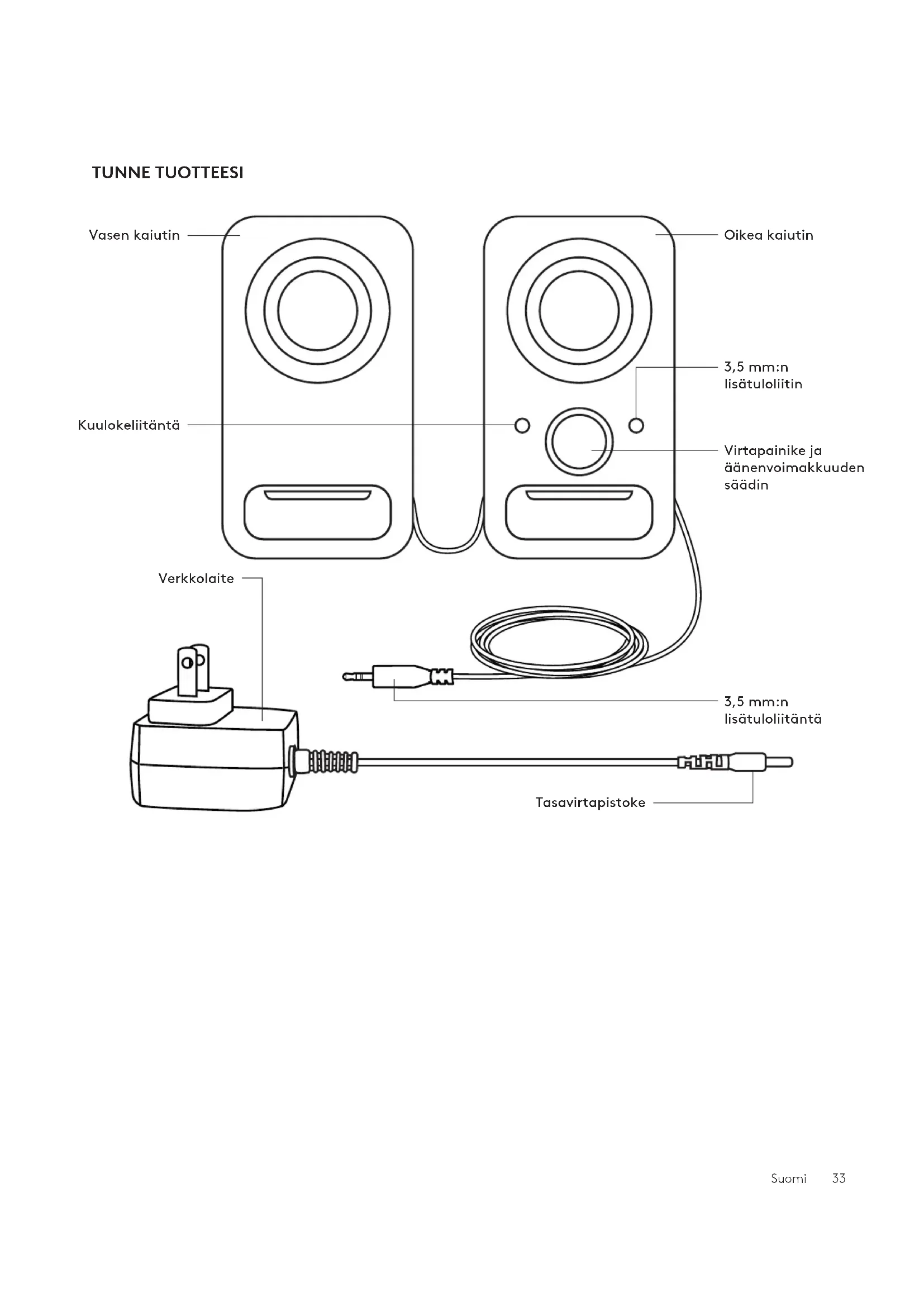vedådreie volumknappen på høyre høyttaler medklokken (eller mot klokken). 1Suomi 33 TUNNE TUOTTEESI Vasen kaiutin Kuulokeliitäntä Tasavirtapistoke Oikea kaiutin Virtapainike ja äänenvoimakkuuden säädin 3,5mm:n lisätuloliitäntä 3,5mm:n lisätuloliitin VerkkolaiteSuomi 34