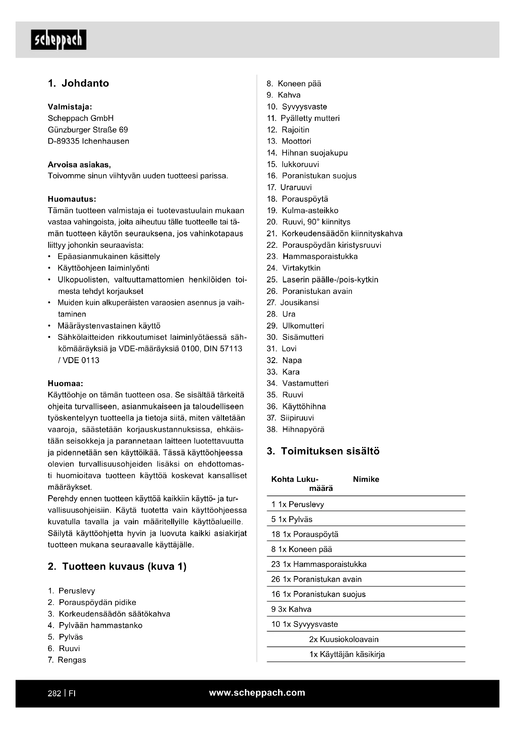 Valmistaja: Scheppach GmbH Günzburger Straße 69 D-89335 Ichenhausen Arvoisa asiakas, Toivomme sinun viihtyvän uuden tuotteesi parissa. Huomautus: Tämän tuotteen valmistaja ei tuotevastuulain mukaan vastaa vahingoista, joita aiheutuu tälle tuotteelle tai tä- män tuotteen käytön seurauksena, jos vahinkotapaus liittyy johonkin seuraavista: