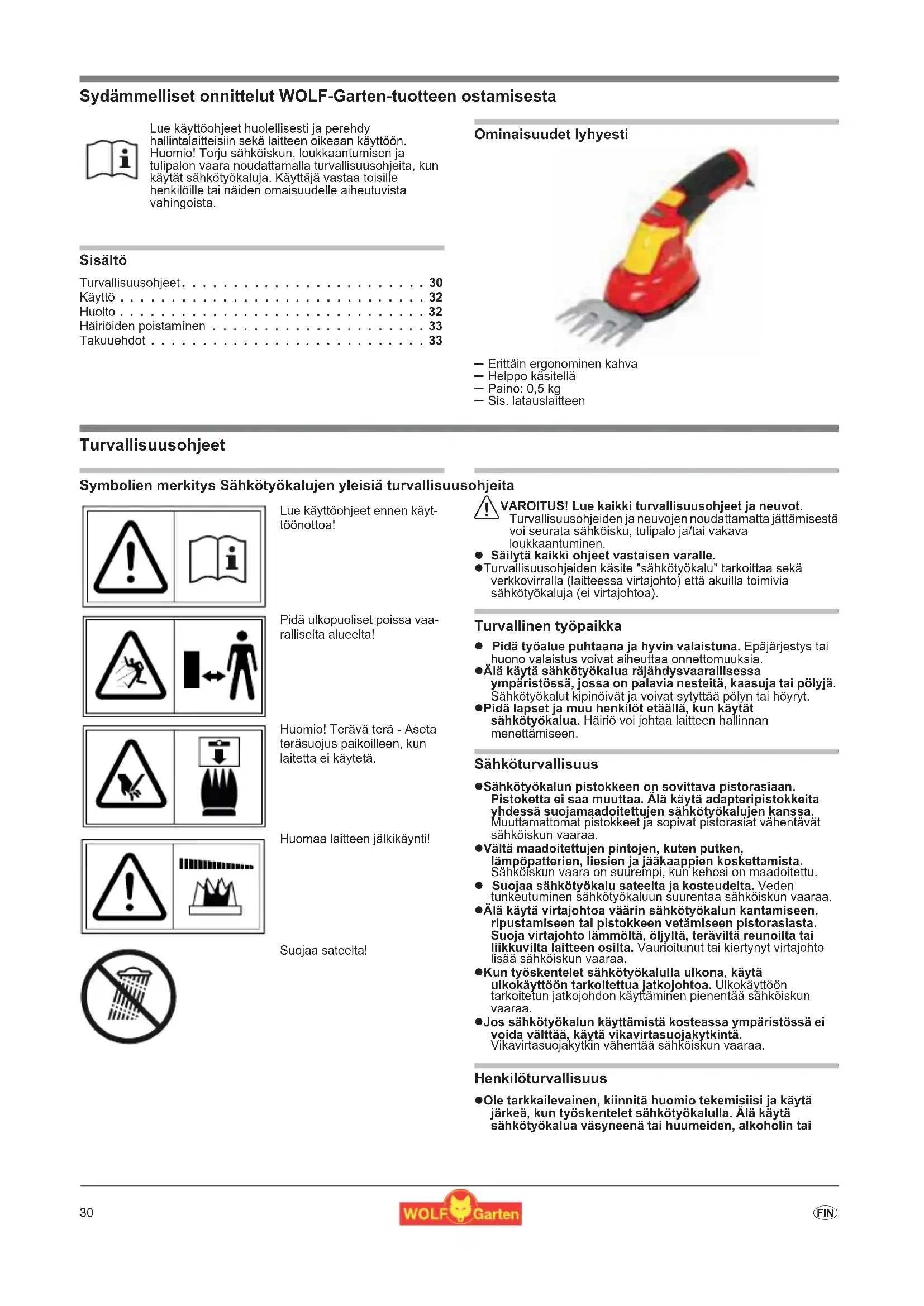 - Sydämmelliset onnittelut WOLF-Garten-tuotteen ostamisesta Sisältö Turvallisuusohjeet p. 30