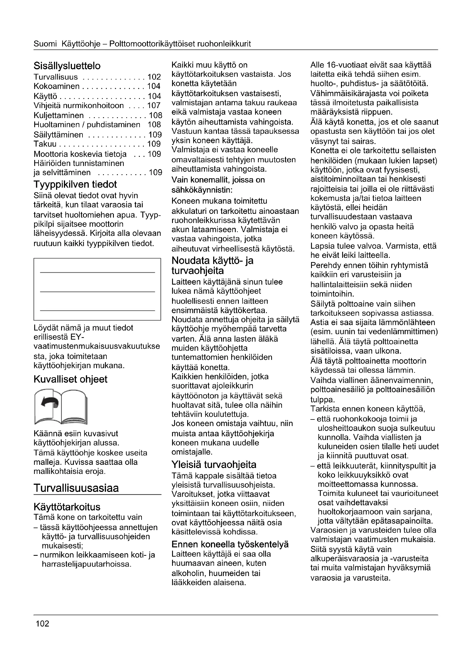 - Häiriöiden tunnistaminen ja selvittäminen Tyyppikilven tiedot Siinä olevat tiedot ovat hyvin tärkeitä, kun tilaat varaosia tai tarvitset huoltomiehen apua. Tyyp- pikilpi sijaitsee moottorin läheisyydessä. Kirjoita alla olevaan ruutuun kaikki tyyppikilven tiedot. Löydät nämä ja muut tiedot erillisestä EY- vaatimustenmukaisuusvakuutukse sta, joka toimitetaan käyttöohjekirjan mukana. Kuvalliset ohjeet Käännä esiin kuvasivut käyttöohjekirjan alussa. Tämä käyttöohje koskee useita malleja. Kuvissa saattaa olla mallikohtaisia eroja. Turvallisuusasiaa Käyttötarkoitus Tämä kone on tarkoitettu vain – tässä käyttöohjeessa annettujen käyttö- ja turvallisuusohjeiden mukaisesti; – nurmikon leikkaamiseen koti- ja harrastelijapuutarhoissa. Kaikki muu käyttö on käyttötarkoituksen vastaista. Jos konetta käytetään käyttötarkoituksen vastaisesti, valmistajan antama takuu raukeaa eikä valmistaja vastaa koneen käytön aiheuttamista vahingoista. Vastuun kantaa tässä tapauksessa yksin koneen käyttäjä. Valmistaja ei vastaa koneelle omavaltaisesti tehtyjen muutosten aiheuttamista vahingoista. Vain konemallit, joissa on sähkökäynnistin: Koneen mukana toimitettu akkulaturi on tarkoitettu ainoastaan ruohonleikkurissa käytettävän akun lataamiseen. Valmistaja ei vastaa vahingoista, jotka aiheutuvat virheellisestä käytöstä. Noudata käyttö- ja turvaohjeita Laitteen käyttäjänä sinun tulee lukea nämä käyttöohjeet huolellisesti ennen laitteen ensimmäistä käyttökertaa. Noudata annettuja ohjeita ja säilytä käyttöohje myöhempää tarvetta varten. Älä anna lasten äläkä muiden käyttöohjetta tuntemattomien henkilöiden käyttää konetta. Kaikkien henkilöiden, jotka suorittavat ajoleikkurin käyttöönoton ja käyttävät sekä huoltavat sitä, tulee olla näihin tehtäviin koulutettuja. Jos koneen omistaja vaihtuu, niin muista antaa käyttöohjekirja koneen mukana uudelle omistajalle. Yleisiä turvaohjeita Tämä kappale sisältää tietoa yleisistä turvallisuusohjeista. Varoitukset, jotka viittaavat yksittäisiin koneen osiin, niiden toimintaan tai käyttötarkoitukseen, ovat käyttöohjeessa näitä osia käsittelevissä kohdissa. Ennen koneella työskentelyä Laitteen käyttäjä ei saa olla huumaavan aineen, kuten alkoholin, huumeiden tai lääkkeiden alaisena. Alle 16-vuotiaat eivät saa käyttää laitetta eikä tehdä siihen esim. huolto-, puhdistus- ja säätötöitä. Vähimmäisikärajasta voi poiketa tässä ilmoitetusta paikallisista määräyksistä riippuen. Älä käytä konetta, jos et ole saanut opastusta sen käyttöön tai jos olet väsynyt tai sairas. Konetta ei ole tarkoitettu sellaisten henkilöiden (mukaan lukien lapset) käyttöön, jotka ovat fyysisesti, aistitoiminnoiltaan tai henkisesti rajoitteisia tai joilla ei ole riittävästi kokemusta ja/tai tietoa laitteen käytöstä, ellei heidän turvallisuudestaan vastaava henkilö valvo ja opasta heitä koneen käytössä. Lapsia tulee valvoa. Varmista, että he eivät leiki laitteella. Perehdy ennen töihin ryhtymistä kaikkiin eri varusteisiin ja hallintalaitteisiin sekä niiden toimintoihin. Säilytä polttoaine vain siihen tarkoitukseen sopivassa astiassa. Astia ei saa sijaita lämmönlähteen (esim. uunin tai vedenlämmittimen) lähellä. Älä täytä polttoainetta sisätiloissa, vaan ulkona. Älä täytä polttoainetta moottorin käydessä tai ollessa lämmin. Vaihda viallinen äänenvaimennin, polttoainesäiliö ja polttoainesäiliön tulppa. Tarkista ennen koneen käyttöä, – että ruohonkokooja toimii ja ulosheittoaukon suoja sulkeutuu kunnolla. Vaihda viallisten ja kuluneiden osien tilalle heti uudet ja kiinnitä puuttuvat osat. – että leikkuuterät, kiinnityspultit ja koko leikkuuyksikkö ovat moitteettomassa kunnossa. Toimita kuluneet tai vaurioituneet osat vaihdettavaksi huoltokorjaamoon vain sarjana, jotta vältytään epätasapainoilta. Varaosien ja varusteiden tulee olla valmistajan vaatimusten mukaisia. Siitä syystä käytä vain alkuperäisvaraosia ja -varusteita tai muita valmistajan hyväksymiä varaosia ja varusteita.Käyttöohje – Polttomoottorikäyttöiset ruohonleikkurit Suomi p. 109