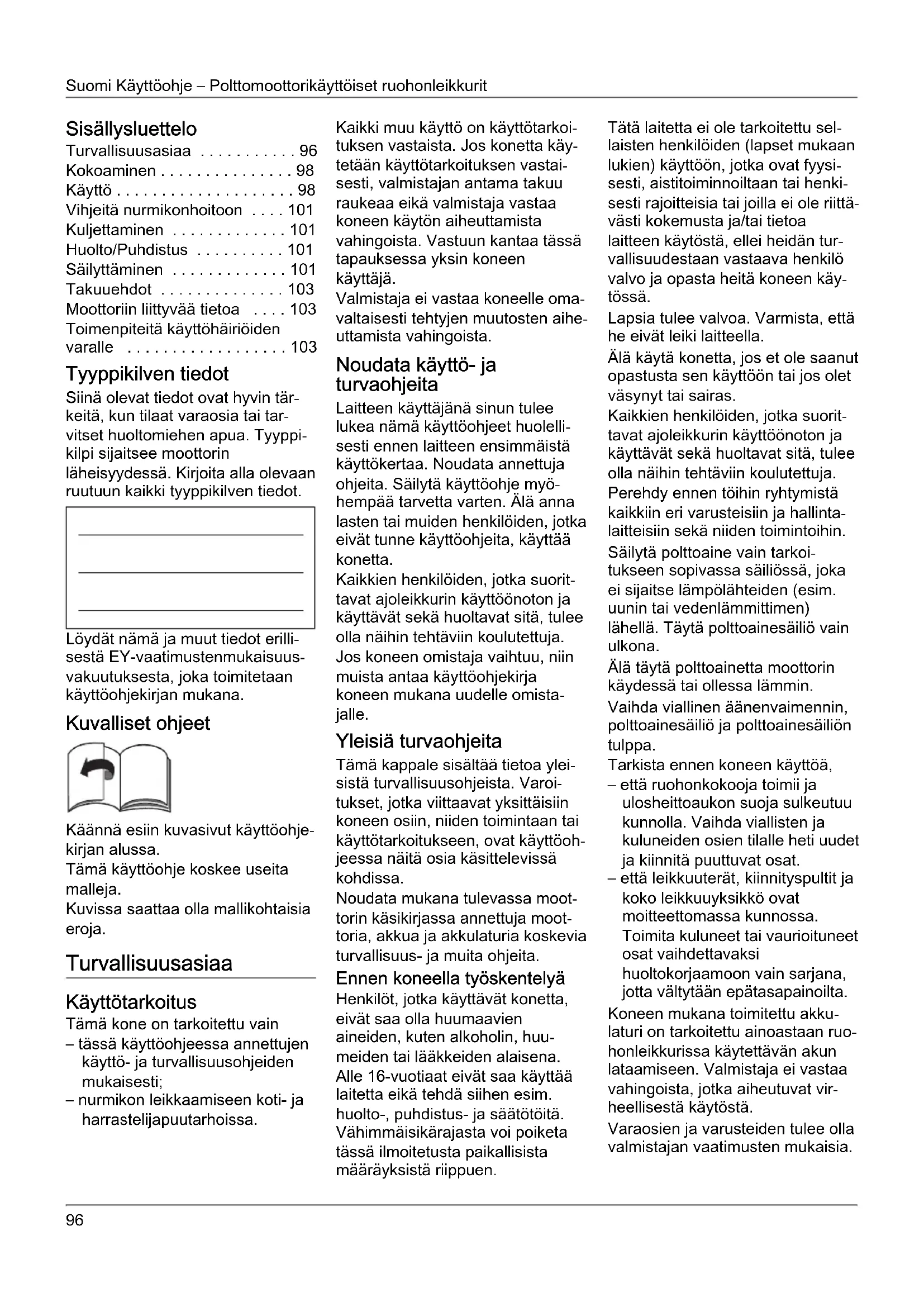 - Toimenpiteitä käyttöhäiriöiden varalle Tyyppikilven tiedot Siinä olevat tiedot ovat hyvin tär- keitä, kun tilaat varaosia tai tar- vitset huoltomiehen apua. Tyyppi- kilpi sijaitsee moottorin läheisyydessä. Kirjoita alla olevaan ruutuun kaikki tyyppikilven tiedot. Löydät nämä ja muut tiedot erilli- sestä EY-vaatimustenmukaisuus- vakuutuksesta, joka toimitetaan käyttöohjekirjan mukana. Kuvalliset ohjeet Käännä esiin kuvasivut käyttöohje- kirjan alussa. Tämä käyttöohje koskee useita malleja. Kuvissa saattaa olla mallikohtaisia eroja. Turvallisuusasiaa Käyttötarkoitus Tämä kone on tarkoitettu vain – tässä käyttöohjeessa annettujen käyttö- ja turvallisuusohjeiden mukaisesti; – nurmikon leikkaamiseen koti- ja harrastelijapuutarhoissa. Kaikki muu käyttö on käyttötarkoi- tuksen vastaista. Jos konetta käy- tetään käyttötarkoituksen vastai- sesti, valmistajan antama takuu raukeaa eikä valmistaja vastaa koneen käytön aiheuttamista vahingoista. Vastuun kantaa tässä tapauksessa yksin koneen käyttäjä. Valmistaja ei vastaa koneelle oma- valtaisesti tehtyjen muutosten aihe- uttamista vahingoista. Noudata käyttö- ja turvaohjeita Laitteen käyttäjänä sinun tulee lukea nämä käyttöohjeet huolelli- sesti ennen laitteen ensimmäistä käyttökertaa. Noudata annettuja ohjeita. Säilytä käyttöohje myö- hempää tarvetta varten. Älä anna lasten tai muiden henkilöiden, jotka eivät tunne käyttöohjeita, käyttää konetta. Kaikkien henkilöiden, jotka suorit- tavat ajoleikkurin käyttöönoton ja käyttävät sekä huoltavat sitä, tulee olla näihin tehtäviin koulutettuja. Jos koneen omistaja vaihtuu, niin muista antaa käyttöohjekirja koneen mukana uudelle omista- jalle. Yleisiä turvaohjeita Tämä kappale sisältää tietoa ylei- sistä turvallisuusohjeista. Varoi- tukset, jotka viittaavat yksittäisiin koneen osiin, niiden toimintaan tai käyttötarkoitukseen, ovat käyttöoh- jeessa näitä osia käsittelevissä kohdissa. Noudata mukana tulevassa moot- torin käsikirjassa annettuja moot- toria, akkua ja akkulaturia koskevia turvallisuus- ja muita ohjeita. Ennen koneella työskentelyä Henkilöt, jotka käyttävät konetta, eivät saa olla huumaavien aineiden, kuten alkoholin, huu- meiden tai lääkkeiden alaisena. Alle 16-vuotiaat eivät saa käyttää laitetta eikä tehdä siihen esim. huolto-, puhdistus- ja säätötöitä. Vähimmäisikärajasta voi poiketa tässä ilmoitetusta paikallisista määräyksistä riippuen. Tätä laitetta ei ole tarkoitettu sel- laisten henkilöiden (lapset mukaan lukien) käyttöön, jotka ovat fyysi- sesti, aistitoiminnoiltaan tai henki- sesti rajoitteisia tai joilla ei ole riittä- västi kokemusta ja/tai tietoa laitteen käytöstä, ellei heidän tur- vallisuudestaan vastaava henkilö valvo ja opasta heitä koneen käy- tössä. Lapsia tulee valvoa. Varmista, että he eivät leiki laitteella. Älä käytä konetta, jos et ole saanut opastusta sen käyttöön tai jos olet väsynyt tai sairas. Kaikkien henkilöiden, jotka suorit- tavat ajoleikkurin käyttöönoton ja käyttävät sekä huoltavat sitä, tulee olla näihin tehtäviin koulutettuja. Perehdy ennen töihin ryhtymistä kaikkiin eri varusteisiin ja hallinta- laitteisiin sekä niiden toimintoihin. Säilytä polttoaine vain tarkoi- tukseen sopivassa säiliössä, joka ei sijaitse lämpölähteiden (esim. uunin tai vedenlämmittimen) lähellä. Täytä polttoainesäiliö vain ulkona. Älä täytä polttoainetta moottorin käydessä tai ollessa lämmin. Vaihda viallinen äänenvaimennin, polttoainesäiliö ja polttoainesäiliön tulppa. Tarkista ennen koneen käyttöä, – että ruohonkokooja toimii ja ulosheittoaukon suoja sulkeutuu kunnolla. Vaihda viallisten ja kuluneiden osien tilalle heti uudet ja kiinnitä puuttuvat osat. – että leikkuuterät, kiinnityspultit ja koko leikkuuyksikkö ovat moitteettomassa kunnossa. Toimita kuluneet tai vaurioituneet osat vaihdettavaksi huoltokorjaamoon vain sarjana, jotta vältytään epätasapainoilta. Koneen mukana toimitettu akku- laturi on tarkoitettu ainoastaan ruo- honleikkurissa käytettävän akun lataamiseen. Valmistaja ei vastaa vahingoista, jotka aiheutuvat vir- heellisestä käytöstä. Varaosien ja varusteiden tulee olla valmistajan vaatimusten mukaisia.Käyttöohje – Polttomoottorikäyttöiset ruohonleikkurit Suomi p. 103