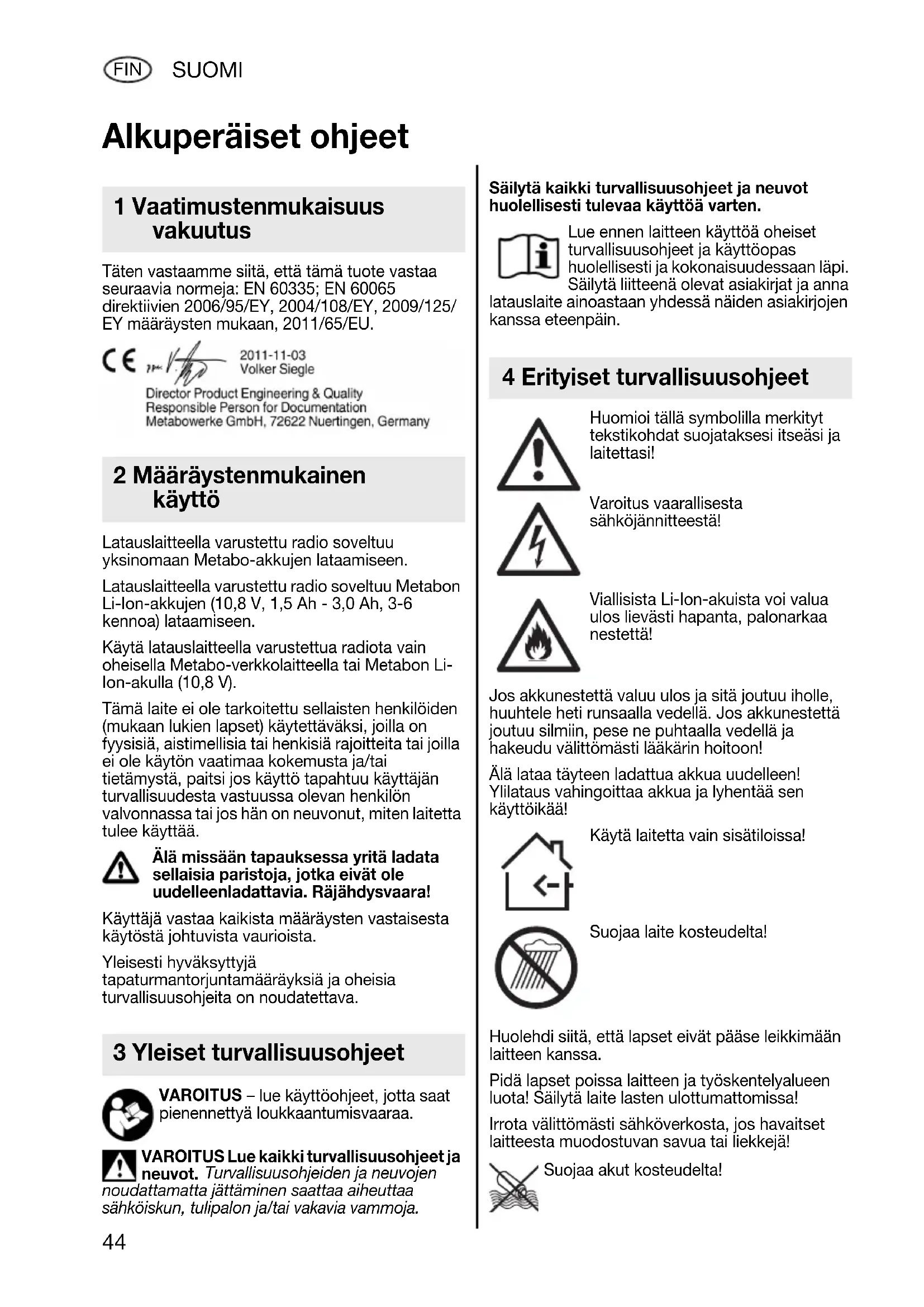 Slå på sparad radiokanal: Visa laddindikering: Laddindikering ”Laddar”: Det är bara behörig elektriker som får repararera enheten! Blir enhetens nätdel blir skadad, så måste den bli utbytt mot Metabo originalreservdel för att undvika risk för fara. Metabo-enheter som behöver repareras skickar du till din Metabo-återförsäljare. Adresser, se www.metabo.com. Du kan hämta reservdelslistor på www.metabo.com. Uttjänta maskiner och tillbehör innehåller en stor andel värdefulla råämnen och plaster som kan tas omhand genom återvinning. Gäller bara EU-länder: släng inte uttjänta elverktyg i hushållssoporna! Enligt EU- direktiv 2002/96/EG om uttjänta el- och elektronikprodukter samt enligt harmoniserad nationell lag ska uttjänta elverktyg källsorteras för miljövänlig återvinning. Vi förbehåller oss rätten till ändringar pga. den tekniska utvecklingen. Batteriernas spänningsintervall= 10,8 V Vikt ..........................................= 1,8 kg Frekvensintervall UKW(FM).....= 87,5-108 MHz Frekvensintervall MV (AM) ......= 522-1 620 kHz Nätdelsutgång.........................= 13,5 V/2 A 8 Reparationer 9Miljöskydd 10 Tekniska data44 SUOMI FIN Täten vastaamme siitä, että tämä tuote vastaa seuraavia normeja: EN 60335; EN 60065 direktiivien 2006/95/EY, 2004/108/EY, 2009/125/ EY määräysten mukaan, 2011/65/EU. Latauslaitteella varustettu radio soveltuu yksinomaan Metabo-akkujen lataamiseen. Latauslaitteella varustettu radio soveltuu Metabon Li-Ion-akkujen (10,8 V, 1,5 Ah - 3,0 Ah, 3-6 kennoa) lataamiseen. Käytä latauslaitteella varustettua radiota vain oheisella Metabo-verkkolaitteella tai Metabon Li- Ion-akulla (10,8 V). Tämä laite ei ole tarkoitettu sellaisten henkilöiden (mukaan lukien lapset) käytettäväksi, joilla on fyysisiä, aistimellisia tai henkisiä rajoitteita tai joilla ei ole käytön vaatimaa kokemusta ja/tai tietämystä, paitsi jos käyttö tapahtuu käyttäjän turvallisuudesta vastuussa olevan henkilön valvonnassa tai jos hän on neuvonut, miten laitetta tulee käyttää. Älä missään tapauksessa yritä ladata sellaisia paristoja, jotka eivät ole uudelleenladattavia. Räjähdysvaara! Käyttäjä vastaa kaikista määräysten vastaisesta käytöstä johtuvista vaurioista. Yleisesti hyväksyttyjä tapaturmantorjuntamääräyksiä ja oheisia turvallisuusohjeita on noudatettava. VAROITUS – lue käyttöohjeet, jotta saat pienennettyä loukkaantumisvaaraa. VAROITUS Lue kaikki turvallisuusohjeet ja neuvot. Turvallisuusohjeiden ja neuvojen noudattamatta jättäminen saattaa aiheuttaa sähköiskun, tulipalon ja/tai vakavia vammoja. Säilytä kaikki turvallisuusohjeet ja neuvot huolellisesti tulevaa käyttöä varten. Lue ennen laitteen käyttöä oheiset turvallisuusohjeet ja käyttöopas huolellisesti ja kokonaisuudessaan läpi. Säilytä liitteenä olevat asiakirjat ja anna latauslaite ainoastaan yhdessä näiden asiakirjojen kanssa eteenpäin. Huomioi tällä symbolilla merkityt tekstikohdat suojataksesi itseäsi ja laitettasi! Varoitus vaarallisesta sähköjännitteestä! Viallisista Li-Ion-akuista voi valua ulos lievästi hapanta, palonarkaa nestettä! Jos akkunestettä valuu ulos ja sitä joutuu iholle, huuhtele heti runsaalla vedellä. Jos akkunestettä joutuu silmiin, pese ne puhtaalla vedellä ja hakeudu välittömästi lääkärin hoitoon! Älä lataa täyteen ladattua akkua uudelleen! Ylilataus vahingoittaa akkua ja lyhentää sen käyttöikää! Käytä laitetta vain sisätiloissa! Suojaa laite kosteudelta! Huolehdi siitä, että lapset eivät pääse leikkimään laitteen kanssa. Pidä lapset poissa laitteen ja työskentelyalueen luota! Säilytä laite lasten ulottumattomissa! Irrota välittömästi sähköverkosta, jos havaitset laitteesta muodostuvan savua tai liekkejä! Suojaa akut kosteudelta! Alkuperäiset ohjeet 1 Vaatimustenmukaisuus vakuutus 2 Määräystenmukainen käyttö 3 Yleiset turvallisuusohjeet 4 Erityiset turvallisuusohjeetSUOMI