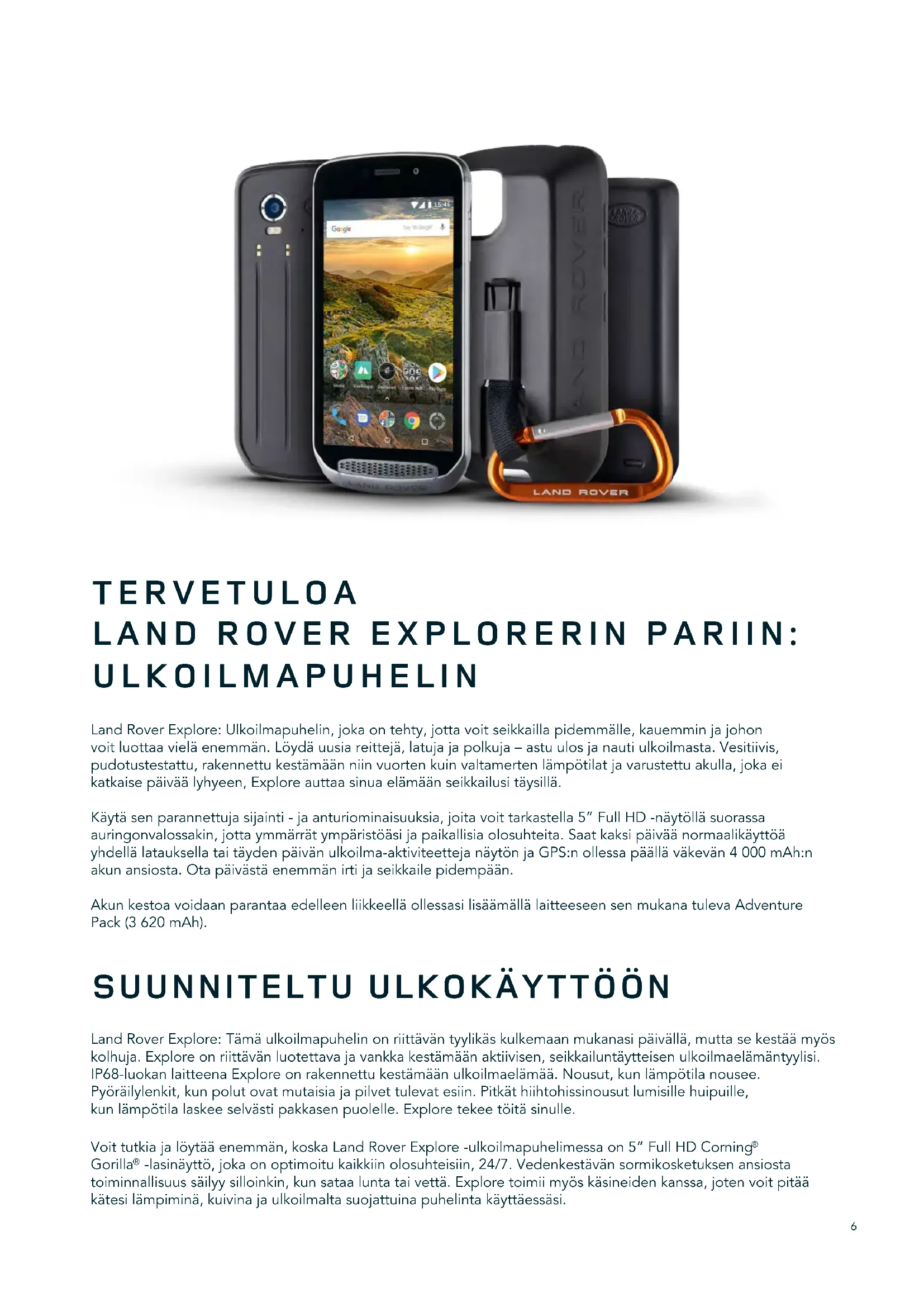 TERVETULOA LAND ROVER EXPLORERIN PARIIN: ULKOILMAPUHELIN Land Rover Explore: Ulkoilmapuhelin, joka on tehty, jotta voit seikkailla pidemmälle, kauemmin ja johon voit luottaa vielä enemmän. Löydä uusia reittejä, latuja ja polkuja – astu ulos ja nauti ulkoilmasta. Vesitiivis, pudotustestattu, rakennettu kestämään niin vuorten kuin valtamerten lämpötilat ja varustettu akulla, joka ei katkaise päivää lyhyeen, Explore auttaa sinua elämään seikkailusi täysillä. Käytä sen parannettuja sijainti - ja anturiominaisuuksia, joita voit tarkastella 5” Full HD -näytöllä suorassa auringonvalossakin, jotta ymmärrät ympäristöäsi ja paikallisia olosuhteita. Saat kaksi päivää normaalikäyttöä yhdellä latauksella tai täyden päivän ulkoilma-aktiviteetteja näytön ja GPS:n ollessa päällä väkevän 4 000 mAh:n akun ansiosta. Ota päivästä enemmän irti ja seikkaile pidempään. Akun kestoa voidaan parantaa edelleen liikkeellä ollessasi lisäämällä laitteeseen sen mukana tuleva Adventure Pack (3 620 mAh).
