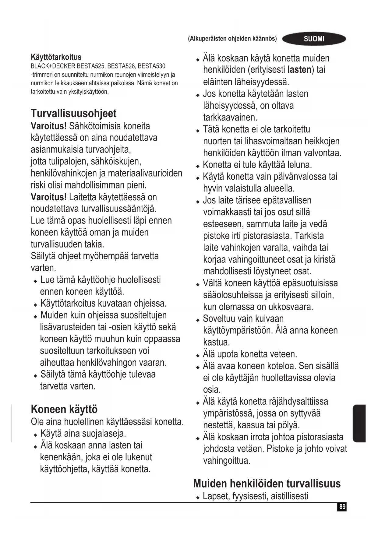 (taattu ääniteho) 96 dB(A)Nämä tuotteet täyttävät myös direktiivien 2014/30/EU ja 2011/65/EU vaatimukset. Lisätietoja saa ottamalla yhteyden Black & Deckeriin seuraavassa osoitteessa. Tiedot ovat myös käyttöohjeen takakannessa.Allekirjoittanut vastaa teknisten tietojen kokoamisesta tehden tämän ilmoituksen Black & Deckerin puolesta.R. LaverickTeknisen osaston johtajaBlack & Decker Europe, 210 Bath Road, Slough,Berkshire, SL1 3YDIso-Britannia14.12.2017TakuuBlack & Decker on vakuuttunut tuotteidensa korkeasta laadusta ja tarjoaa kuluttajille 24 kuukauden takuun, joka astuu voimaan ostopäivänä. Takuu on lisäys kuluttajan laillisiin oikeuksiin eikä vaikuta niihin. Tämä takuu on voimassa kaikissa EU- ja ETA-maissa.Edellytyksenä takuun saamiselle on, että vaade täyttää Black & Deckerin ehdot ja että ostaja toimittaa ostotositteen jälleenmyyjälle tai valtuutetulle huoltoliikkeelle. Black & Deckerin kahden vuoden takuun ehdot ja lähimmän valtuutetun korjauspalvelun yhteystiedot ovat saatavilla osoitteessa www.2helpU.com tai ottamalla yhteyttä paikalliseen Black & Deckerin toimipisteeseen tässä ohjekirjassa:Käy verkkosivuillamme osoitteessa www.blackanddecker. ja rekisteröi uusi BLACK+DECKER -tuotteesi saadaksesi tietoa uusista tuotteista ja erikoistarjouksista. Προβλεπόμενη χρήση Τα κοπτικά BLACK+DECKER BESTA525, BESTA528, BESTA530 έχουν σχεδιαστεί για κοπή και φινίρισμα άκρων γκαζόν και για κοπή χόρτων σε περιορισμένους χώρους. Αυτά τα μηχανήματα προορίζονται μόνο για καταναλωτική χρήση. Οδηγίες ασφαλείας Προειδοποίηση! Κατά τη χρήση μηχανημάτων που τροφοδοτούνται με ηλεκτρικό ρεύμα δικτύου, θα πρέπει να λαμβάνονται πάντα οι βασικές προφυλάξεις ασφαλείας, συμπεριλαμβανομένων και των παρακάτω, για τον περιορισμό του κινδύνου πυρκαγιάς, ηλεκτροπληξίας, τραυματισμού και υλικών ζημιών. Προειδοποίηση! Κατά τη χρήση του μηχανήματος πρέπει να τηρούνται οι κανόνες ασφαλείας. Για ασφάλεια δική σας και των παρευρισκομένων, διαβάστε αυτές τις οδηγίες πριν χρησιμοποιήσετε το