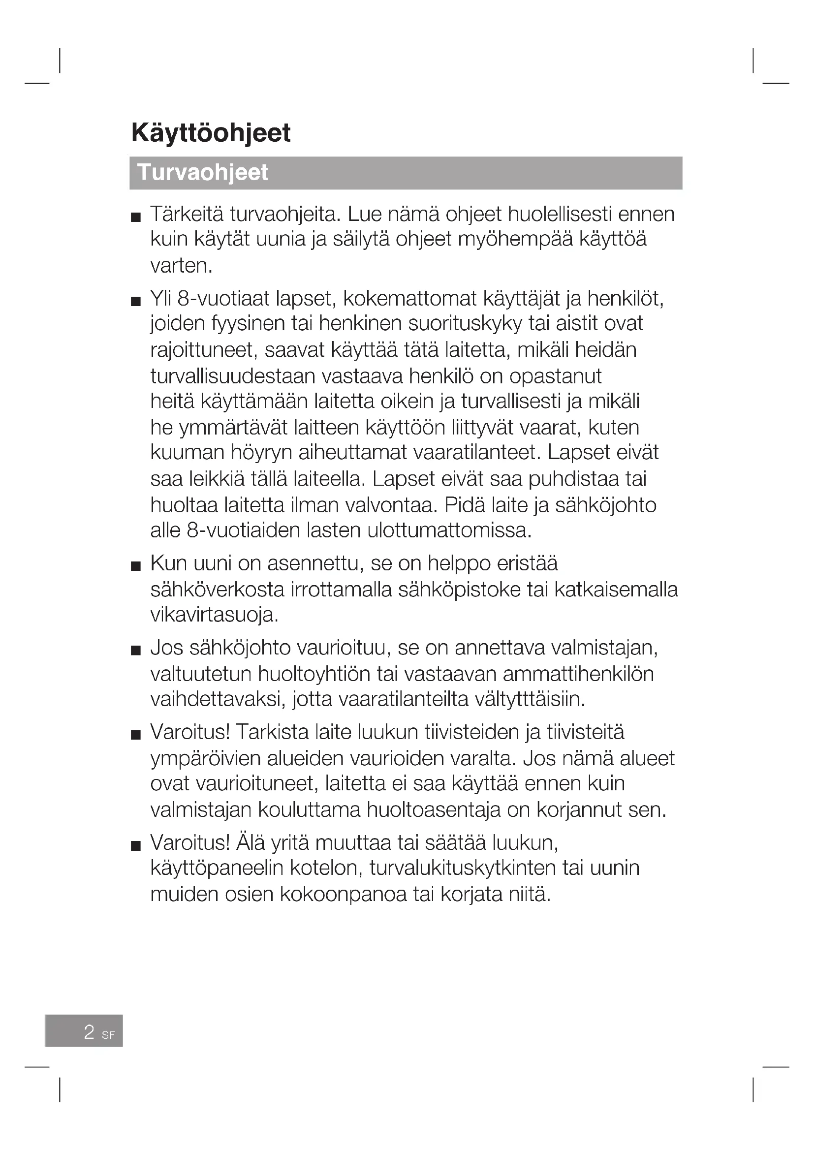 käyttäjät ja henkilöt, joiden fyysinen tai henkinen suorituskyky tai aistit ovat rajoittuneet, saavat käyttää tätä laitetta, mikäli heidän turvallisuudestaan vastaava henkilö on opastanut heitä käyttämään laitetta oikein ja turvallisesti ja mikäli he ymmärtävät laitteen käyttöön liittyvät vaarat, kuten kuuman höyryn aiheuttamat vaaratilanteet. Lapset eivät saa leikkiä tällä laiteella. Lapset eivät saa puhdistaa tai huoltaa laitetta ilman valvontaa. Pidä laite ja sähköjohto alle 8-vuotiaiden lasten ulottumattomissa. Lue ohjeet huolella ja säilytä ne tulevaa käyttöä varten. Tärkeitä turvaohjeita11 SF Suomi Uunin käyttäminen