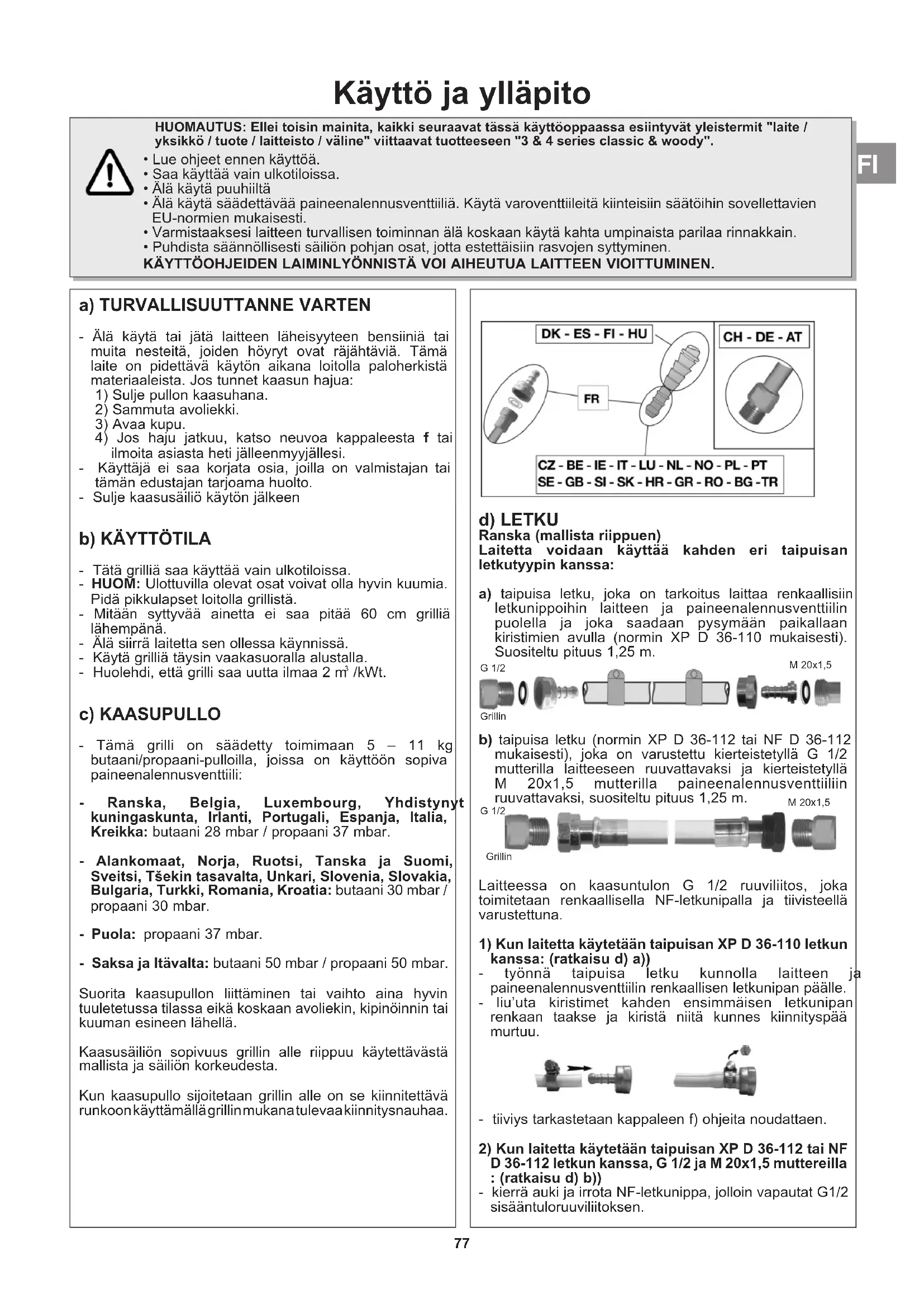 /kWt. c) KAASUPULLO - Tämä grilli on säädetty toimimaan 5 – 11 kg butaani/propaani-pulloilla, joissa on käyttöön sopiva paineenalennusventtiili: - Ranska, Belgia, Luxembourg, Yhdistynyt kuningaskunta, Irlanti, Portugali, Espanja, Italia, Kreikka: butaani 28 mbar / propaani 37 mbar. - Alankomaat, Norja, Ruotsi, Tanska ja Suomi, Sveitsi, Tšekin tasavalta, Unkari, Slovenia, Slovakia, Bulgaria, Turkki, Romania, Kroatia: butaani 30 mbar / propaani 30 mbar. - Puola: propaani 37 mbar. - Saksa ja Itävalta: butaani 50 mbar / propaani 50 mbar. Suorita kaasupullon liittäminen tai vaihto aina hyvin tuuletetussa tilassa eikä koskaan avoliekin, kipinöinnin tai kuuman esineen lähellä. Kaasusäiliön sopivuus grillin alle riippuu käytettävästä mallista ja säiliön korkeudesta. Kun kaasupullo sijoitetaan grillin alle on se kiinnitettävä runkoon käyttämällä grillin mukana tulevaa kiinnitysnauhaa. d) LETKU Ranska (mallista riippuen) Laitetta voidaan käyttää kahden eri taipuisan letkutyypin kanssa: a) taipuisa letku, joka on tarkoitus laittaa renkaallisiin letkunippoihin laitteen ja paineenalennusventtiilin puolella ja joka saadaan pysymään paikallaan kiristimien avulla (normin XP D 36-110 mukaisesti). Suositeltu pituus 1,25 m. b) taipuisa letku (normin XP D 36-112 tai NF D 36-112 mukaisesti), joka on varustettu kierteistetyllä G 1/2 mutterilla laitteeseen ruuvattavaksi ja kierteistetyllä M 20x1,5 mutterilla paineenalennusventtiiliin ruuvattavaksi, suositeltu pituus 1,25 m. Laitteessa on kaasuntulon G 1/2 ruuviliitos, joka toimitetaan renkaallisella NF-letkunipalla ja tiivisteellä varustettuna.