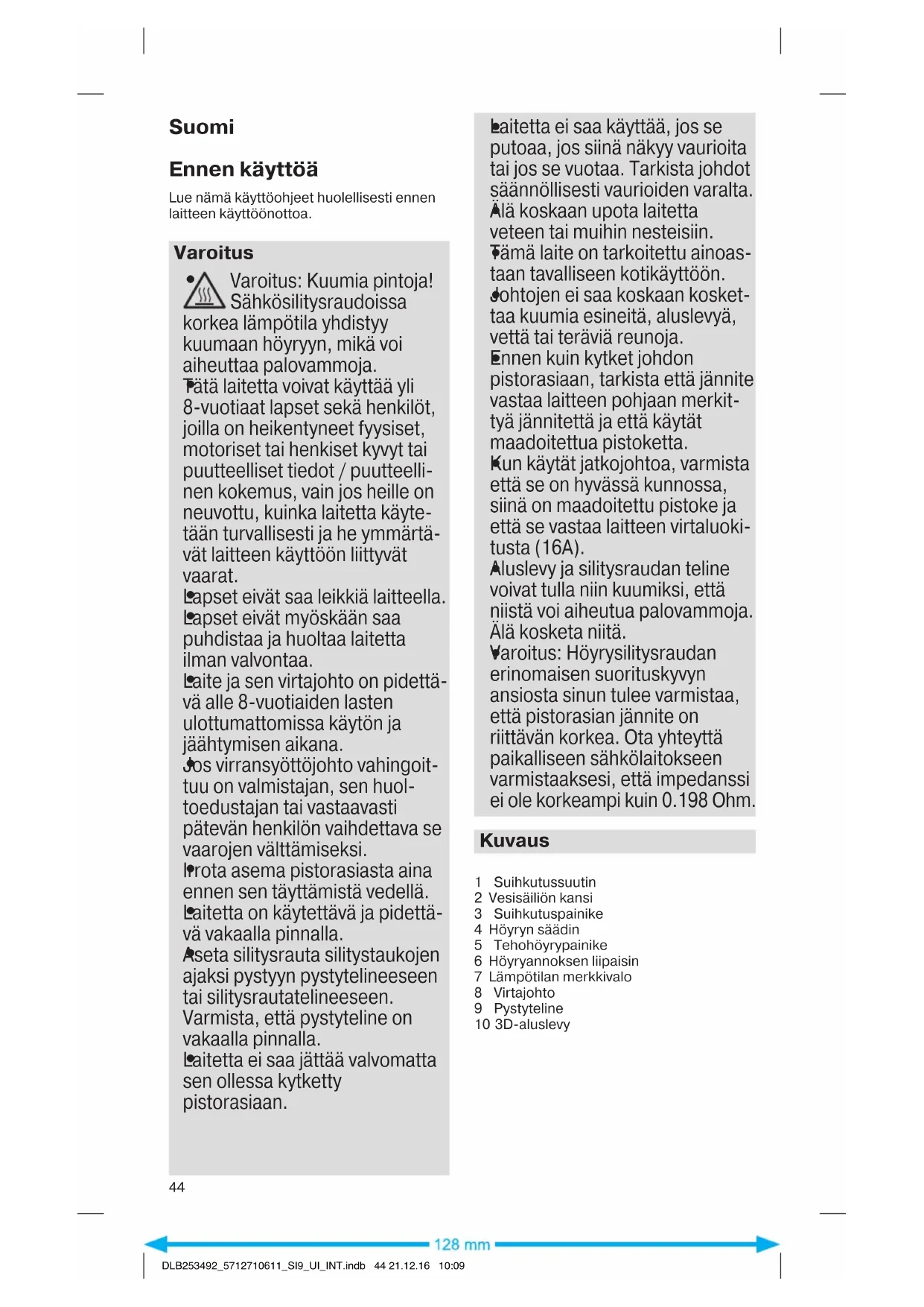 DLB253492_5712710611_SI9_UI_INT.indb 43 21.12.16 10:09Suomi Ennen käyttöä Lue nämä käyttöohjeet huolellisesti ennen laitteen käyttöönottoa. Varoitus