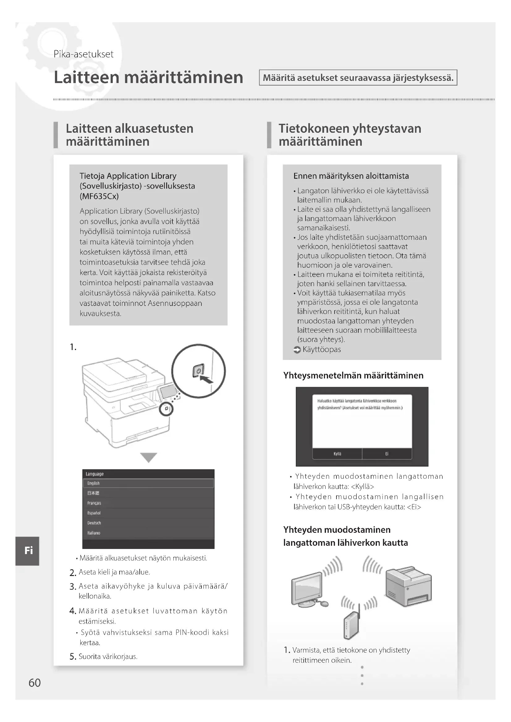 Laitteen määrittäminen Laitteen alkuasetusten määrittäminen Määritä asetukset seuraavassa järjestyksessä. Pika-asetukset FiFiLisätietoja Käyttöoppaan kohta Asetusten tekeminen asennusopasta käyttämällä Tarkista tietokoneen verkkoasetukset. Merkitse SSID ja verkkoavain muistiin.• Tarkista reitittimen tarra. Käyttöopas• Asetusten tekeminen on helpompaa, jos reitittimessä on WPS-merkki. Käyttöopas Aseta tukiasema ja verkkoavain näytön mukaisesti.1. Paina <OK>.2. Paina <SSID-asetukset>.3. Paina <Valitse tukiasema>.4. Valitse tukiasema (SSID) ja paina <Seuraava>.5. Syötä WEP-avain (verkkoavain) ja paina <Käytä>.6. Paina <Kyllä>.• IP-osoite määritetään automaattisesti muutaman minuutin kuluessa.• ”Yhdistetty.” tulee esiin. Asenna ajuri ja ohjelmisto. Ohjelmiston asentaminen sivulla 62Alkuasetusten määritys on nyt tehty.Jos laitteessa on faksitoiminto, siirry faksiasetusten määrittämiseen. sivulla 63 Yhteyden muodostaminen langallisen lähiverkon kautta Laitteen mukana ei toimiteta LAN-kaapelia.Hanki sellainen tarvittaessa. Varmista, että tietokone on yhdistetty reitittimeen oikein. Tarkista tietokoneen verkkoasetukset. Liitä LAN-kaapeli.• Kun kaapeli on liitetty, odota hetki (kunnes IP-osoite asetetaan automaattisesti).• Jos tietokoneeseen on asetettu staattinen IP-osoite, aseta laitteen IP-osoite manuaalisesti. Asenna ajuri ja ohjelmisto. Ohjelmiston asentaminen sivulla 62Alkuasetusten määritys on nyt tehty.Jos laitteessa on faksitoiminto, siirry faksiasetusten määrittämiseen. sivulla 63