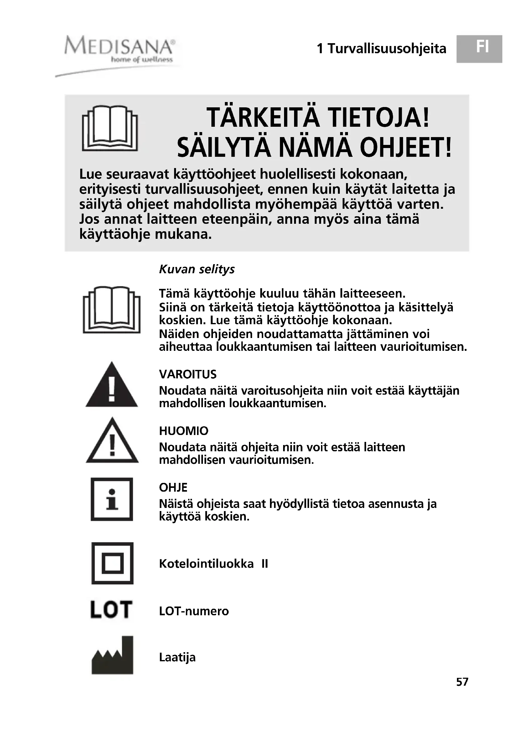 - Lapset eivät saa puhdistaa tai huoltaa laitetta ilman valvontaa. Ei saa pestä! Ei kemiallista pesua! Tämän käyttöohjeen löydät sivustolta: www.medisana.com