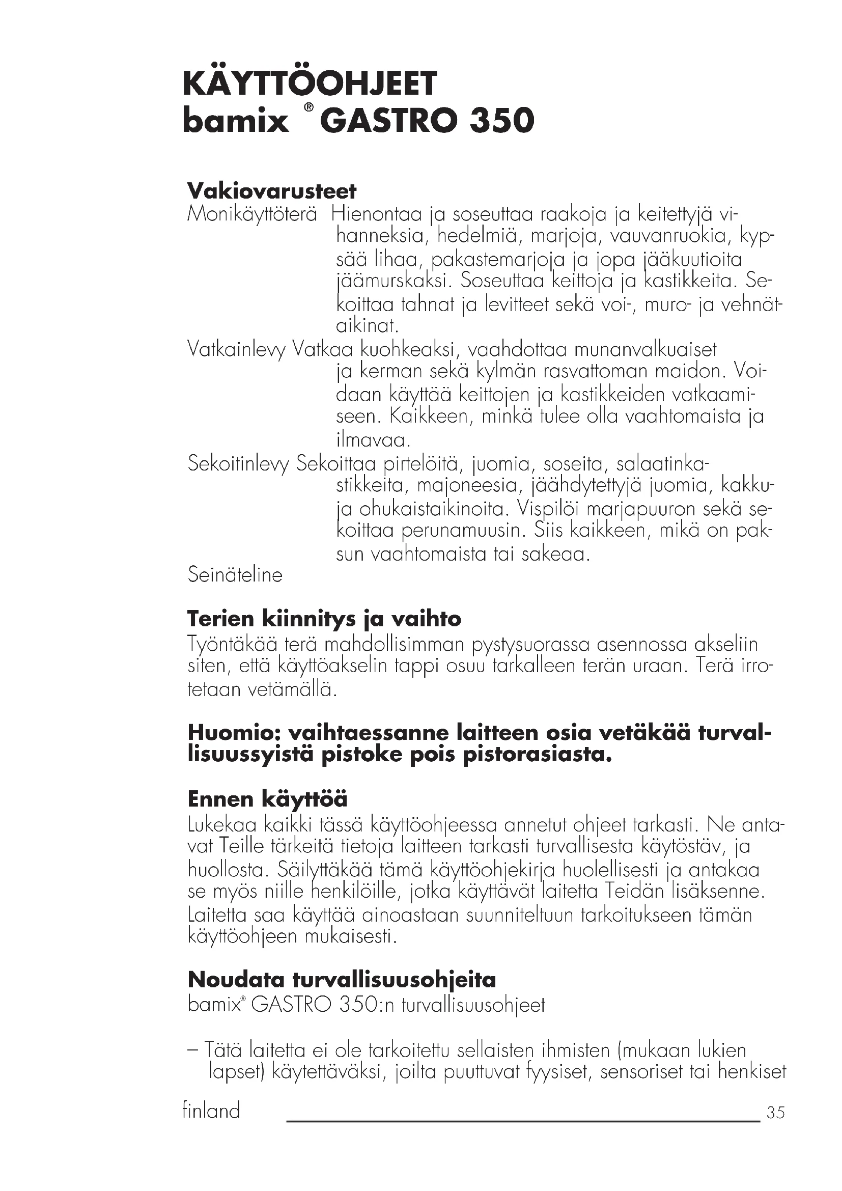 GASTRO 350 Motorens kapacitet: 230V/350W Hastighed: 1: 18’000 o.p.m. 2: 22’000 o.p.m. Isolering: Dobbelt beskyttelse Længde total: 49.5 cm Kan neddykkes: Op til 35 cm Kabel: Oprullet eller løs afhængig af spændingen Vægt: Op til 1.200 gr Testet Producent: ESGE Ltd, CH-9517 Mettlen/Schweiz35 finland Vakiovarusteet Monikäyttöterä Hienontaa ja soseuttaa raakoja ja keitettyjä vi- hanneksia, hedelmiä, marjoja, vauvanruokia, kyp- sää lihaa, pakastemarjoja ja jopa jääkuutioita jäämurskaksi. Soseuttaa keittoja ja kastikkeita. Se- koittaa tahnat ja levitteet sekä voi-, muro- ja vehnät- aikinat. Vatkainlevy Vatkaa kuohkeaksi, vaahdottaa munanvalkuaiset ja kerman sekä kylmän rasvattoman maidon. Voi- daan käyttää keittojen ja kastikkeiden vatkaami- seen. Kaikkeen, minkä tulee olla vaahtomaista ja ilmavaa. Sekoitinlevy Sekoittaa pirtelöitä, juomia, soseita, salaatinka- stikkeita, majoneesia, jäähdytettyjä juomia, kakku- ja ohukaistaikinoita. Vispilöi marjapuuron sekä se- koittaa perunamuusin. Siis kaikkeen, mikä on pak- sun vaahtomaista tai sakeaa. Seinäteline Terien kiinnitys ja vaihto Työntäkää terä mahdollisimman pystysuorassa asennossa akseliin siten, että käyttöakselin tappi osuu tarkalleen terän uraan. Terä irro- tetaan vetämällä. Huomio: vaihtaessanne laitteen osia vetäkää turval- lisuussyistä pistoke pois pistorasiasta. Ennen käyttöä Lukekaa kaikki tässä käyttöohjeessa annetut ohjeet tarkasti. Ne anta- vat Teille tärkeitä tietoja laitteen tarkasti turvallisesta käytöstäv, ja huollosta. Säilyttäkää tämä käyttöohjekirja huolellisesti ja antakaa se myös niille henkilöille, jotka käyttävät laitetta Teidän lisäksenne. Laitetta saa käyttää ainoastaan suunniteltuun tarkoitukseen tämän käyttöohjeen mukaisesti. Noudata turvallisuusohjeita bamix