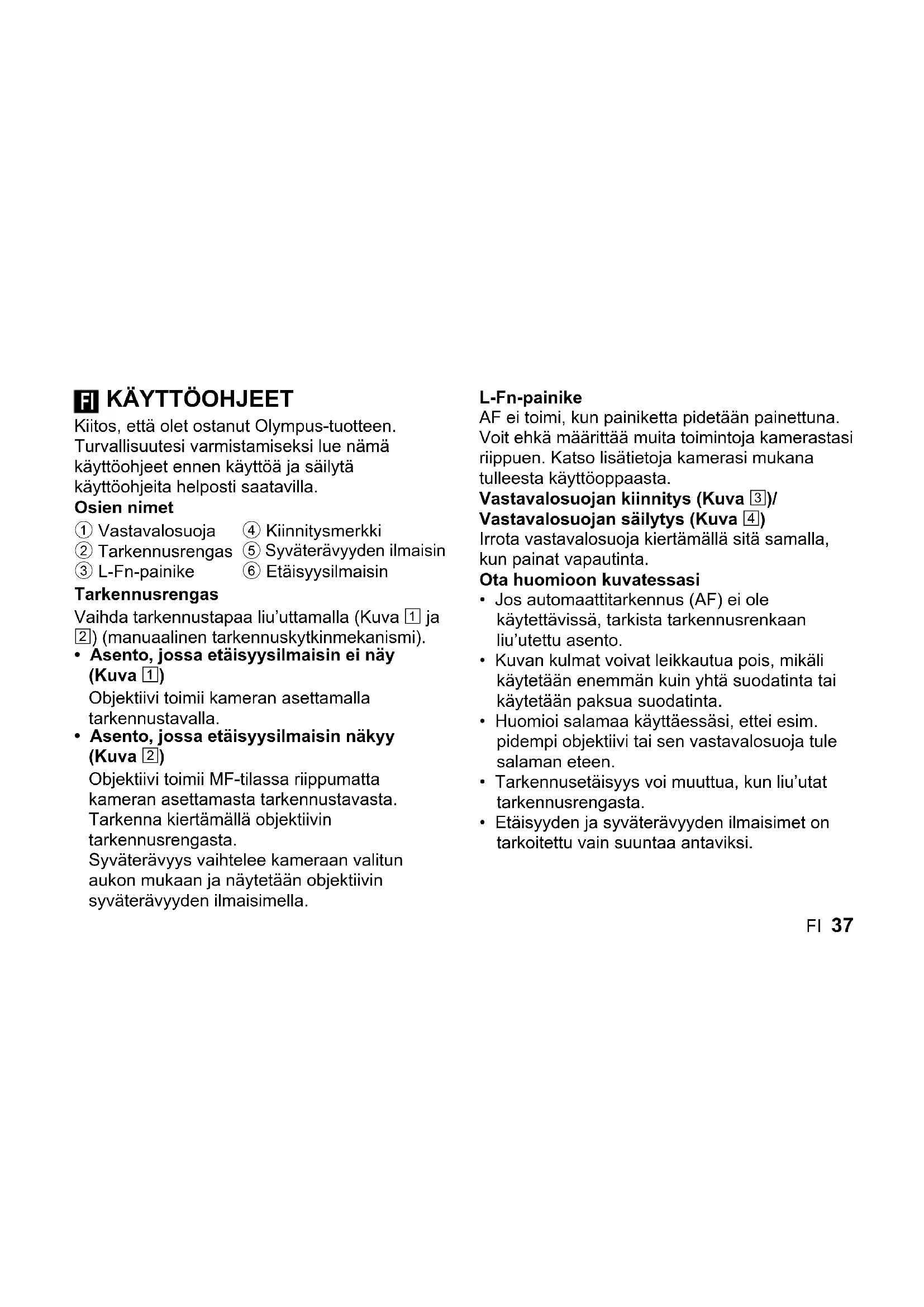 Kiitos, että olet ostanut Olympus-tuotteen. Turvallisuutesi varmistamiseksi lue nämä käyttöohjeet ennen käyttöä ja säilytä käyttöohjeita helposti saatavilla. Osien nimet 1 Vastavalosuoja 2 Tarkennusrengas 3 L-Fn-painike 4 Kiinnitysmerkki
