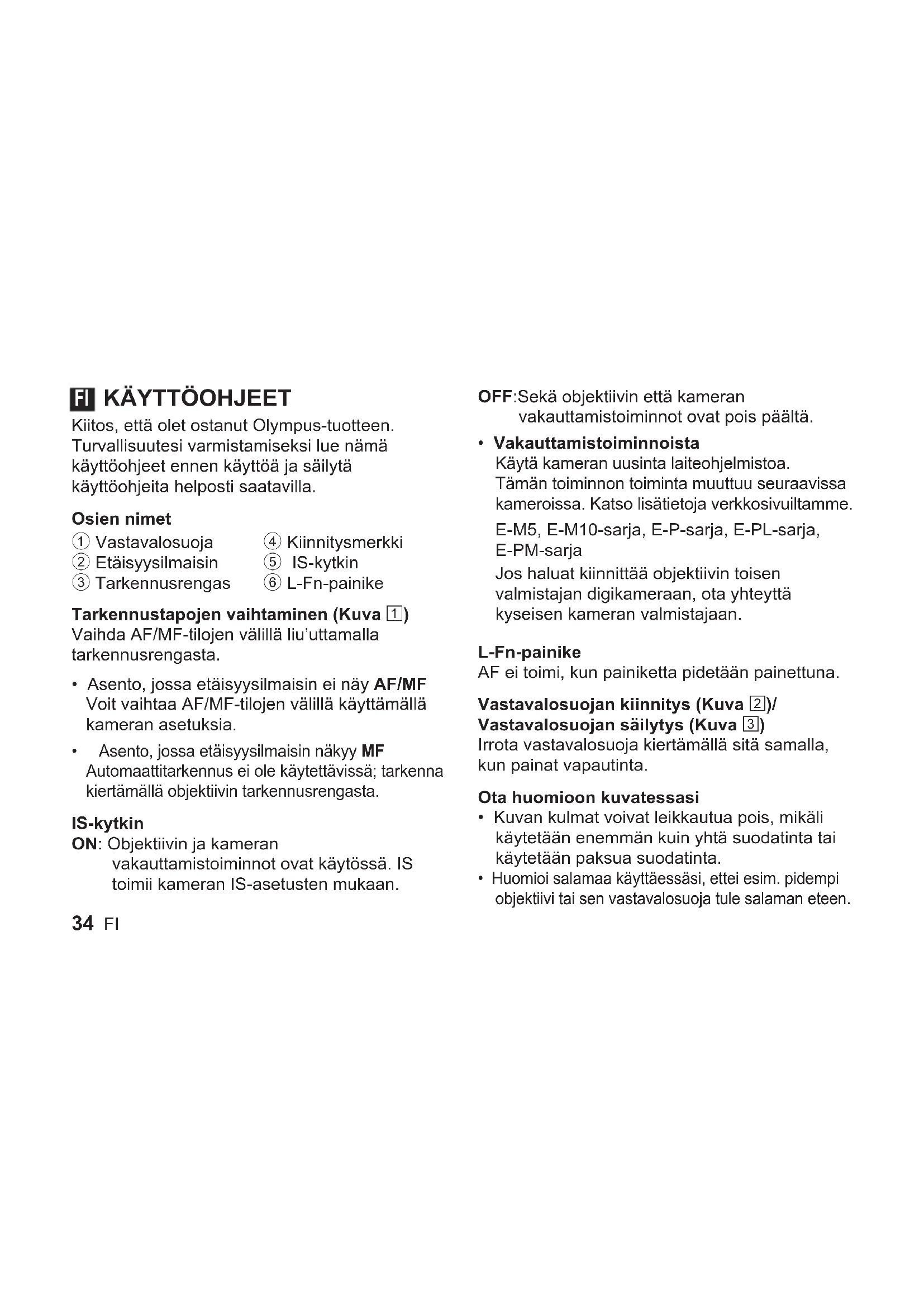 Kiitos, että olet ostanut Olympus-tuotteen. Turvallisuutesi varmistamiseksi lue nämä käyttöohjeet ennen käyttöä ja säilytä käyttöohjeita helposti saatavilla. Osien nimet 1 Vastavalosuoja 2 Etäisyysilmaisin 3 Tarkennusrengas 4 Kiinnitysmerkki 5 IS-kytkin 6 L-Fn-painike Tarkennustapojen vaihtaminen (Kuva 1) Vaihda AF/MF-tilojen välillä liu’uttamalla tarkennusrengasta.