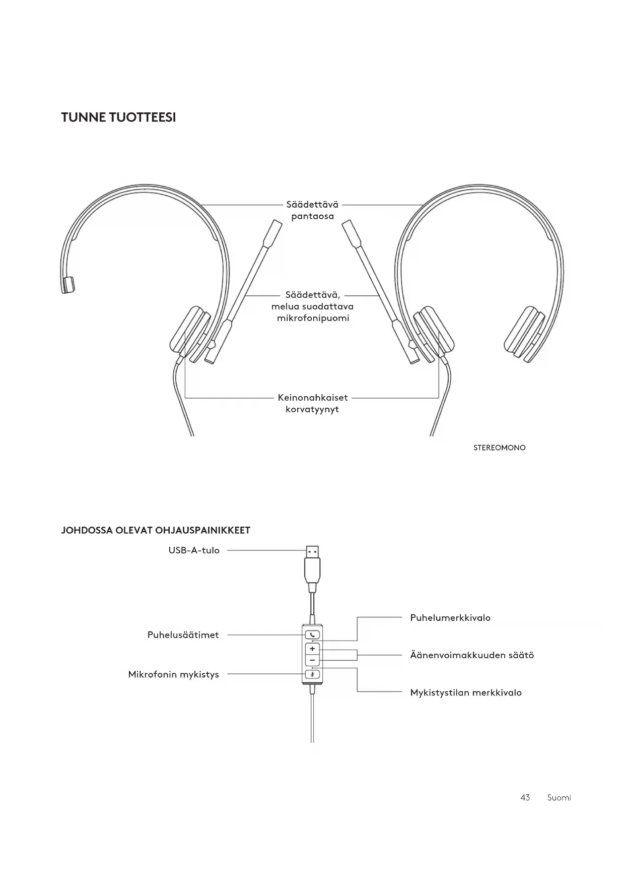 Säädettävä pantaosa USB-A-tulo Puhelusäätimet Mikrofonin mykistys Säädettävä, melua suodattava mikrofonipuomi Keinonahkaiset korvatyynyt STEREOMONO Äänenvoimakkuuden säätö Puhelumerkkivalo Mykistystilan merkkivalo 43 SuomiKUULOKEMIKROFONIN ISTUVUUS Säädä kuulokemikrofonia liu’uttamalla pantaosaa ylöstai alas.