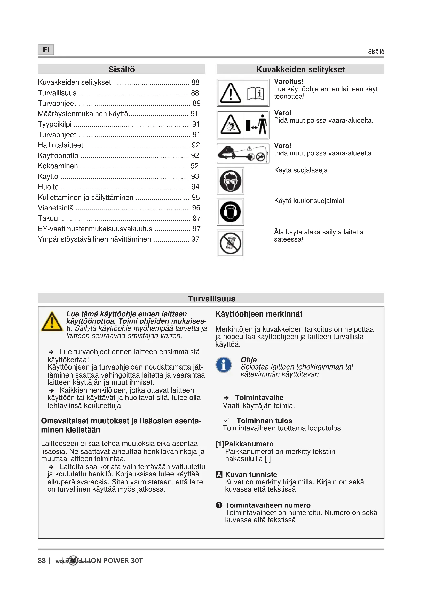 - Ympäristöystävällinen hävittäminen Turvallisuus Kuvakkeiden selitykset Varoitus! Lue käyttöohje ennen laitteen käyt- töönottoa! Varo! Pidä muut poissa vaara-alueelta. 360° Varo! Pidä muut poissa vaara-alueelta. Käytä suojalaseja! Käytä kuulonsuojaimia! Älä käytä äläkä säilytä laitetta sateessa!Turvaohjeet p. 97