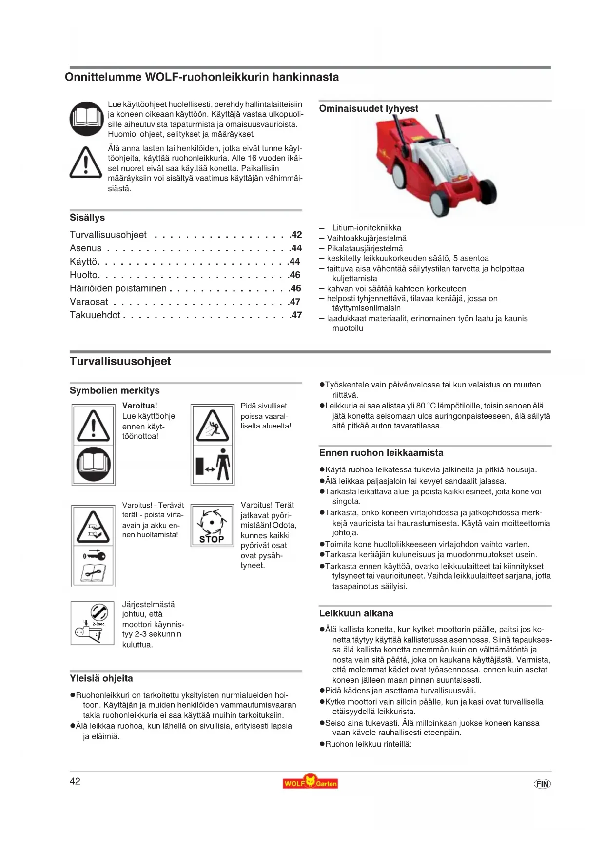 – Aja konetta aina poikittain rinteeseen nähden, älä ylös- ja alaspäin. – Ole varovainen vaihtaessasi suuntaa. – Älä aja konetta jyrkillä rinteillä. z Ole erityisen varovainen, kun ajat konetta takaperin ja vedät sitä itseesi päin. z Älä milloinkaan koske liikkuvaan leikkuriin. z Älä asetu ruohosäiliön poistoaukon eteen. z Älä milloinkaan avaa suojapäällistä, jos moottori on vielä käynnissä. z Älä milloinkaan aja soran ylitse moottorin ollessa käynnissä – kiviensinkoiluvaara! z Vältä märän ruohikon leikkuuta, jos mahdollista. z Laite on pysäytettävä, pistoke on irrotettava pistorasiasta, eikä leikkuulaite saa liikkua: – kun laite jätetään vaille valvontaa – vapautettaessa tukkeutunut terä – säädettäessä leikkuukorkeutta – tyhjennettäessä kerääjä – osuttaessa vieraaseen kappaleeseen (varmista ensin, onko leikkuri tai leikkuuväline vaurioitunut. Korjaa ensin vaurio). – leikkuri tärisee epätasapainon vaikutuksesta voimakkaasti (katkaise virta heti ja selvitä syy) – liitäntäjohdon vaurioituessa käytössä – ennen leikkurin nostamista tai kantamista – ennen leikkurin kallistamista tai kuljettamista (esim. nurmi- kolta/nurmikolle tai teiden yli) Huolto 1 Huomio! Pyörivä leikkuriterä Ennen huoltoa ja puhdistusta: z Poista virta-avain ja akku. z Älä koske liikkuviin teriin. z Tarkasta kaikkien näkyvien kiinnitysruuvien ja -mutterien – erityisesti teräpalkin – kireys säännöllisesti, ja kiristä tarvitta- essa. z Älä säilytä leikkuria kosteassa tilassa. z For safety reasons, replace worn or damaged parts. z Käytä vain alkuperäisiä WOLF varaosia, koska muut et voi ti- etää varmasti, onko kone turvallinen. Latauslaite z Latauslaite on tarkoitettu vain WOLF-akkuleikkurien LI-ION POWER 34 lataamiseen. z Älä käytä latauslaitetta kosteassa tai märässä tilassa. Käytä vain sisätiloissa. z Irrota johto vain pistokkeesta vetämällä. Johdosta vetäessä se ja pistoke voivat vaurioita, jolloin sähköturvallisuus vaaran- tuu. z Älä käytä latauslaite, jos johto, pistoke tai itse laite ovat ja pis- toke voivat vaurioita, jolloin sähköturvallisuus vaarantuu.ja pistoke voivat vaurioita, jolloin sähköturvallisuus vaaran- tuu.vaurioituneet. Toimita latauslaite huoltoliiikkeeseen. z Älä peitä tuuletusaukkoja, jotta ilman kierto ei esty. Älä käytä laitetta lähellä lämmönlähteitä. z Älä avaa latauslaitetta. Jos havaitset häiriön, toimita latauslai- te huoltoliikkeeseen. z Käytä akun lataamiseen vain sopivia Wolf-Garten-latauslait- teita. Muiden latauslaitteiden käyttämisestä voi aiheutua viko- ja tai tulipalo. Akku z Akusta voi väärin käytettäessä vuotaa nestettä. Vältä kos- kettamasta sitä. Jos kosketat vahingossa, huuhtele vedellä. Jos nestettä joutuu silmiin, hakeudu lääkäriin. Akusta vuotava neste voi ärsyttää tai polttaa ihoa. z Vaurioituneesta tai väärin käsiteltävä akusta voi purkautua höyryjä. Mene raittiiseen ilmaan, ja hakeudu lääkäriin, jos si- nulla on oireita. Höyryt voivat ärsyttää hengitysteitä. 1 Tulipalon vaara! z Älä lataa akkuja happojen ja helposti syttyvien materiaalien lähellä. z Lataa akku vain ympäristön lämpötilassa 0 ... +40 °C. Anna voimakkaasti kuormitetun akun jäähtyä ensin. 1 Räjähdysvaara! Suojaa akku kuumuudelta ja tulelta. z Älä aseta lämpöpatterien päälle tai jätä pitkäksi aikaa voimakkaaseen auringonpaisteeseen. z Käytä akkua vain, ympäristön lämpötilassa 0 ... +40 °C. 1 Oikosulun vaara z Kun hävität, kuljetat tai varastoit akun, pakkaa se (muo- vipussiin, laatikkoon) tai suojaa liittimet teipillä. z Akkua ei saa avata. Akkujen hävittäminen Jätteenpoisto z WOLF in laitteissa käytetään Li-ION-akkuja , jotka ovat ongelmajätettä. Toimita käytöstä poistetut akut laitteen myyneeseen liikkee- seen. Akut on poistettava laitteesta ennen sen romuttamista. z WOLF in akut soveltuvat nykytietämyksen mukaan parhaiden verkosta riippumattomien sähkölaitteiden energian lähteeksi. Li-ION- akut ovat ympäristölle haitallisia, jos ne hävit- tää tavallaisen talousjätteen seassa. z WOLF Garten huolehtii osaltaan ympärist- östä. Toimita siksi käytöstä poistetut akut WOLF tuotteita myyvään liikkeeseen tai muu- hun ongelmajätteen vastaanottopaikkaan. z Älä hävitä elektronisia laitteita kotitalousjät- teen mukana. Kierrätä elektroniset tavarat, osat ja pakkausmateriaalit ympäristöystävälli- sesti.44