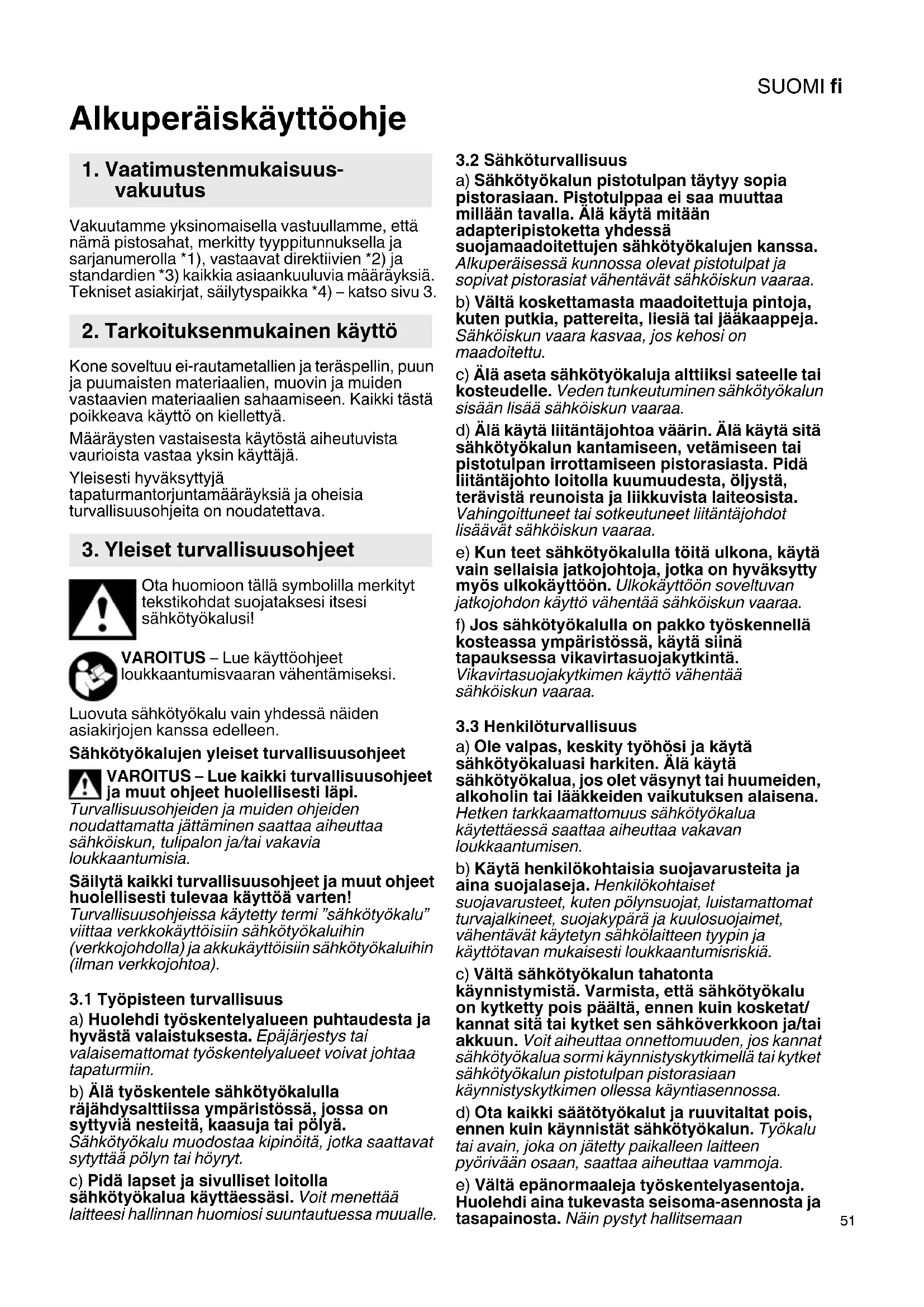 Alkuperäiskäyttöohje Vakuutamme yksinomaisella vastuullamme, että nämä pistosahat, merkitty tyyppitunnuksella ja sarjanumerolla *1), vastaavat direktiivien *2) ja standardien *3) kaikkia asiaankuuluvia määräyksiä. Tekniset asiakirjat, säilytyspaikka *4) – katso sivu 3. Kone soveltuu ei-rautametallien ja teräspellin, puun ja puumaisten materiaalien, muovin ja muiden vastaavien materiaalien sahaamiseen. Kaikki tästä poikkeava käyttö on kiellettyä. Määräysten vastaisesta käytöstä aiheutuvista vaurioista vastaa yksin käyttäjä. Yleisesti hyväksyttyjä tapaturmantorjuntamääräyksiä ja oheisia turvallisuusohjeita on noudatettava. Ota huomioon tällä symbolilla merkityt tekstikohdat suojataksesi itsesi sähkötyökalusi! VAROITUS – Lue käyttöohjeet loukkaantumisvaaran vähentämiseksi. Luovuta sähkötyökalu vain yhdessä näiden asiakirjojen kanssa edelleen. Sähkötyökalujen yleiset turvallisuusohjeet VAROITUS – Lue kaikki turvallisuusohjeet ja muut ohjeet huolellisesti läpi. Turvallisuusohjeiden ja muiden ohjeiden noudattamatta jättäminen saattaa aiheuttaa sähköiskun, tulipalon ja/tai vakavia loukkaantumisia. Säilytä kaikki turvallisuusohjeet ja muut ohjeet huolellisesti tulevaa käyttöä varten! Turvallisuusohjeissa käytetty termi ”sähkötyökalu” viittaa verkkokäyttöisiin sähkötyökaluihin (verkkojohdolla) ja akkukäyttöisiin sähkötyökaluihin (ilman verkkojohtoa).