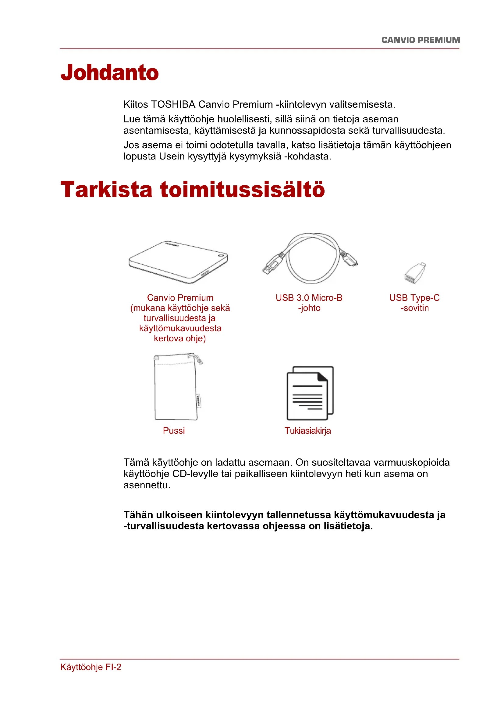 - Asetusten vaatimat ilmoitukset Käyttöohje FI-2 CANVIO PREMIUM Johdanto Kiitos TOSHIBA Canvio Premium -kiintolevyn valitsemisesta. Lue tämä käyttöohje huolellisesti, sillä siinä on tietoja aseman asentamisesta, käyttämisestä ja kunnossapidosta sekä turvallisuudesta. Jos asema ei toimi odotetulla tavalla, katso lisätietoja tämän käyttöohjeen lopusta Usein kysyttyjä kysymyksiä -kohdasta. Tarkista toimitussisältö Tämä käyttöohje on ladattu asemaan. On suositeltavaa varmuuskopioida käyttöohje CD-levylle tai paikalliseen kiintolevyyn heti kun asema on asennettu. Tähän ulkoiseen kiintolevyyn tallennetussa käyttömukavuudesta ja -turvallisuudesta kertovassa ohjeessa on lisätietoja. Canvio Premium (mukana käyttöohje sekä turvallisuudesta ja käyttömukavuudesta kertova ohje) USB 3.0 Micro-B -johto Pussi USB Type-C -sovitin TukiasiakirjaKäyttöohje FI-3 CANVIO PREMIUM Järjestelmävaatimukset ■ Windows p. 8