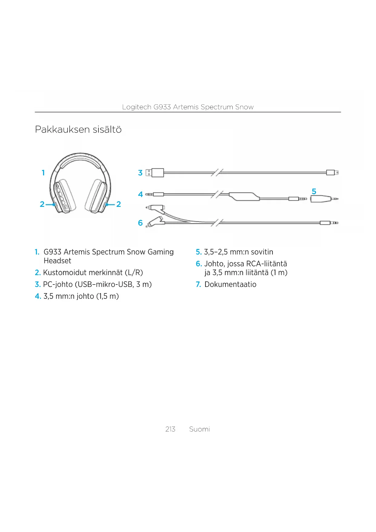 3Logitech G933 Artemis Spectrum Snow 222 Suomi PC-määritys (3,5 mm:n yhteys) Äänilaitteita voidaan myös liittää G933-kuulokemikrofoniin käyttämällä ainoastaan 3,5 mm johtoa.