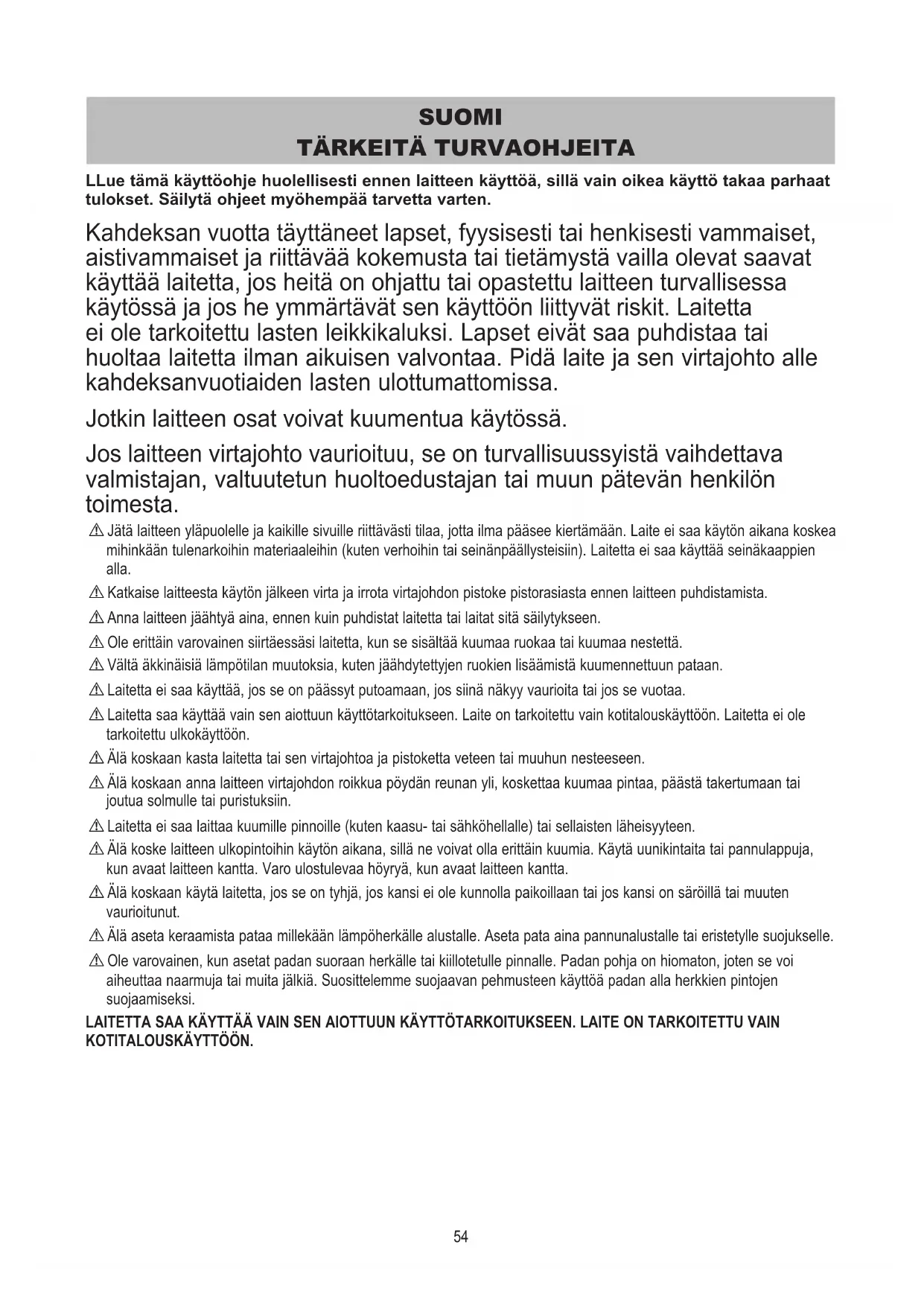 LLue tämä käyttöohje huolellisesti ennen laitteen käyttöä, sillä vain oikea käyttö takaa parhaat tulokset. Säilytä ohjeet myöhempää tarvetta varten. Kahdeksanvuottatäyttäneetlapset,fyysisestitaihenkisestivammaiset, aistivammaisetjariittävääkokemustataitietämystävaillaolevatsaavat käyttäälaitetta,josheitäonohjattutaiopastettulaitteenturvallisessa käytössäjajosheymmärtävätsenkäyttöönliittyvätriskit.Laitetta ei ole tarkoitettu lasten leikkikaluksi. Lapset eivät saa puhdistaa tai huoltaa laitetta ilman aikuisen valvontaa. Pidä laite ja sen virtajohto alle kahdeksanvuotiaiden lasten ulottumattomissa. Jotkinlaitteenosatvoivatkuumentuakäytössä. Joslaitteenvirtajohtovaurioituu,seonturvallisuussyistävaihdettava valmistajan, valtuutetun huoltoedustajan tai muun pätevän henkilön toimesta. ! Jätä laitteen yläpuolelle ja kaikille sivuille riittävästi tilaa, jotta ilma pääsee kiertämään. Laite ei saa käytön aikana koskea mihinkään tulenarkoihin materiaaleihin (kuten verhoihin tai seinänpäällysteisiin). Laitetta ei saa käyttää seinäkaappien alla. ! Katkaise laitteesta käytön jälkeen virta ja irrota virtajohdon pistoke pistorasiasta ennen laitteen puhdistamista. ! Anna laitteen jäähtyä aina, ennen kuin puhdistat laitetta tai laitat sitä säilytykseen. ! Ole erittäin varovainen siirtäessäsi laitetta, kun se sisältää kuumaa ruokaa tai kuumaa nestettä. ! Vältä äkkinäisiä lämpötilan muutoksia, kuten jäähdytettyjen ruokien lisäämistä kuumennettuun pataan. ! Laitetta ei saa käyttää, jos se on päässyt putoamaan, jos siinä näkyy vaurioita tai jos se vuotaa. ! Laitetta saa käyttää vain sen aiottuun käyttötarkoitukseen. Laite on tarkoitettu vain kotitalouskäyttöön. Laitetta ei ole tarkoitettu ulkokäyttöön. ! Älä koskaan kasta laitetta tai sen virtajohtoa ja pistoketta veteen tai muuhun nesteeseen. ! Älä koskaan anna laitteen virtajohdon roikkua pöydän reunan yli, koskettaa kuumaa pintaa, päästä takertumaan tai joutua solmulle tai puristuksiin. ! Laitetta ei saa laittaa kuumille pinnoille (kuten kaasu- tai sähköhellalle) tai sellaisten läheisyyteen. ! Älä koske laitteen ulkopintoihin käytön aikana, sillä ne voivat olla erittäin kuumia. Käytä uunikintaita tai pannulappuja, kun avaat laitteen kantta. Varo ulostulevaa höyryä, kun avaat laitteen kantta. ! Älä koskaan käytä laitetta, jos se on tyhjä, jos kansi ei ole kunnolla paikoillaan tai jos kansi on säröillä tai muuten vaurioitunut. ! Älä aseta keraamista pataa millekään lämpöherkälle alustalle. Aseta pata aina pannunalustalle tai eristetylle suojukselle. ! Ole varovainen, kun asetat padan suoraan herkälle tai kiillotetulle pinnalle. Padan pohja on hiomaton, joten se voi aiheuttaa naarmuja tai muita jälkiä. Suosittelemme suojaavan pehmusteen käyttöä padan alla herkkien pintojen suojaamiseksi. LAITETTA SAA KÄYTTÄÄ VAIN SEN AIOTTUUN KÄYTTÖTARKOITUKSEEN. LAITE ON TARKOITETTU VAIN