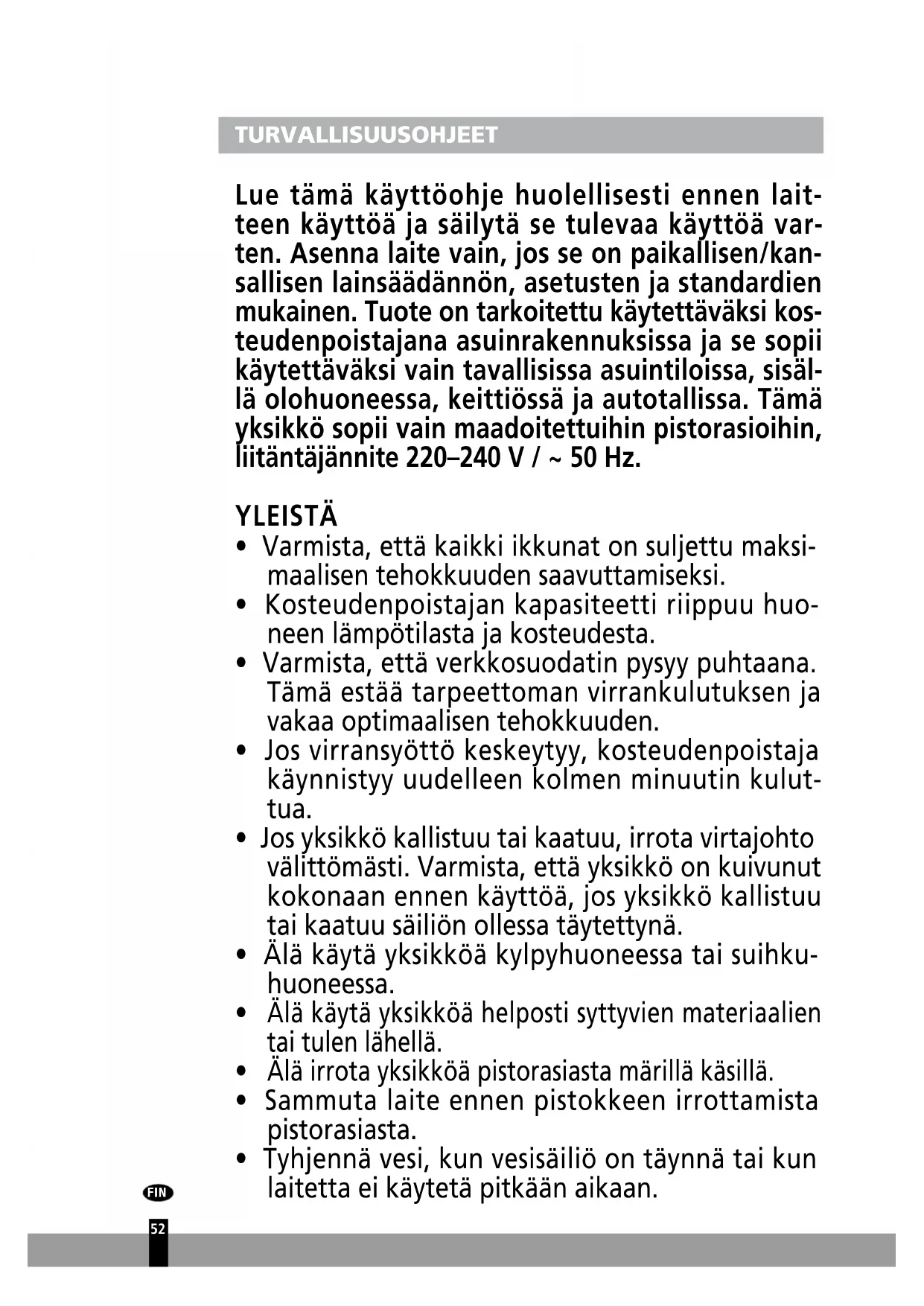 TURVALLISUUSOHJEET Lue tämä käyttöohje huolellisesti ennen lait- teen käyttöä ja säilytä se tulevaa käyttöä var- ten. Asenna laite vain, jos se on paikallisen/kan- sallisen lainsäädännön, asetusten ja standardien mukainen. Tuote on tarkoitettu käytettäväksi kos- teudenpoistajana asuinrakennuksissa ja se sopii käytettäväksi vain tavallisissa asuintiloissa, sisäl- lä olohuoneessa, keittiössä ja autotallissa. Tämä yksikkö sopii vain maadoitettuihin pistorasioihin, liitäntäjännite 220–240 V / ~ 50 Hz. YLEISTÄ