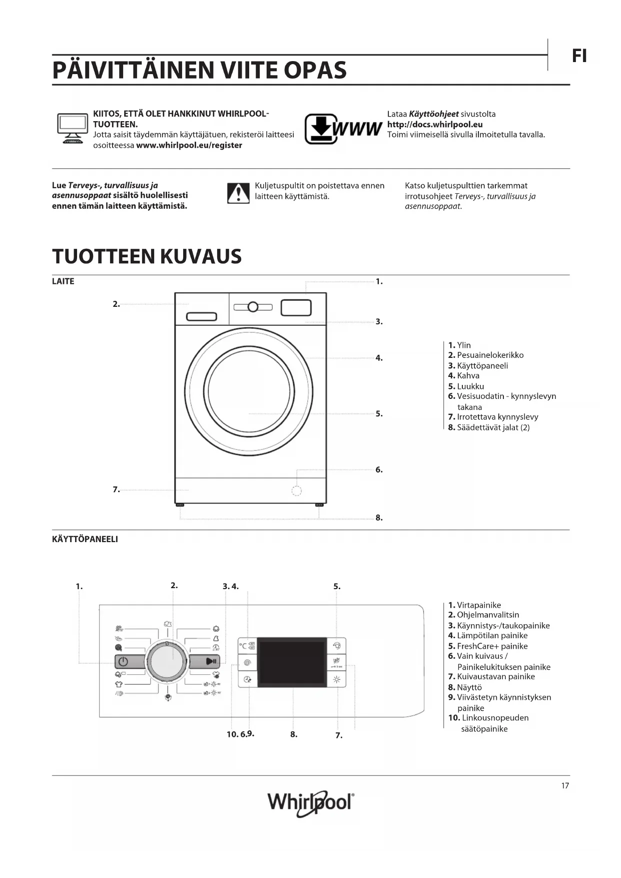 TUOTTEEN. Jotta saisit täydemmän käyttäjätuen, rekisteröi laitteesi osoitteessa www.whirlpool.eu/register Lataa Käyttöohjeet sivustolta http://docs.whirlpool.eu Toimi viimeisellä sivulla ilmoitetulla tavalla. WWW TUOTTEEN KUVAUS