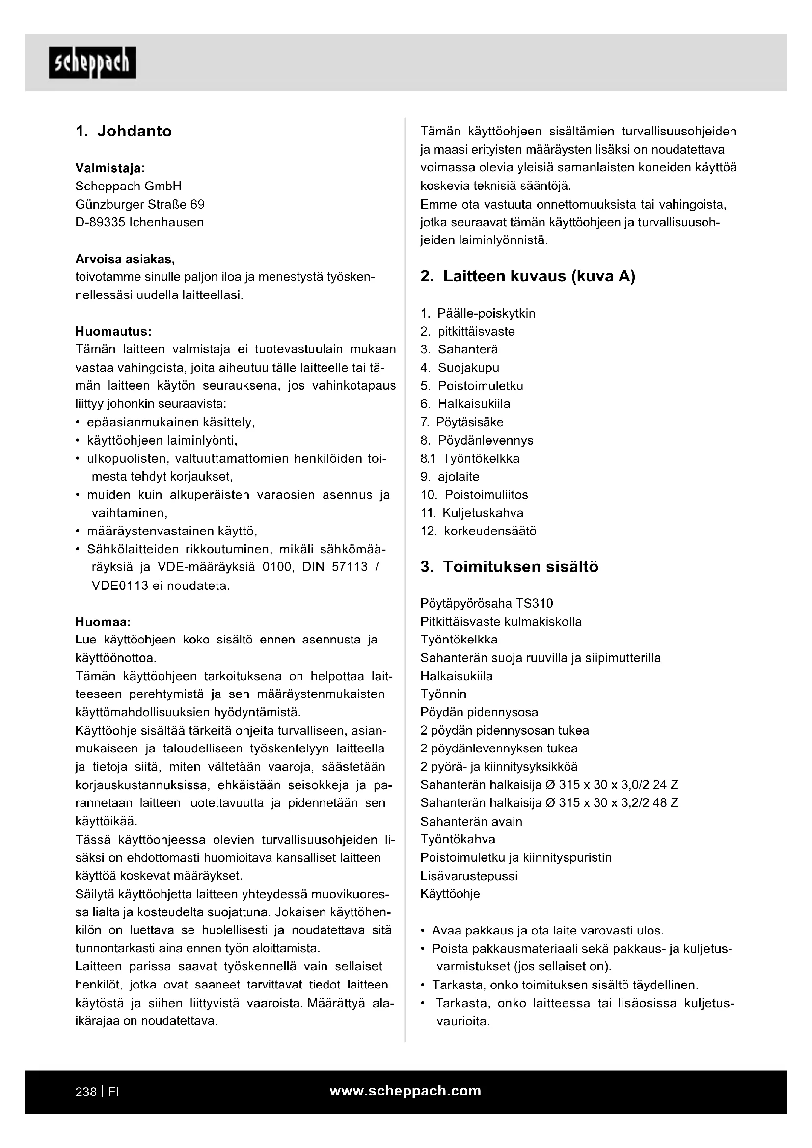 Löydä laitteen käyttöohje ilmaiseksi TS310 SCHEPPACH PDF-muodossa.