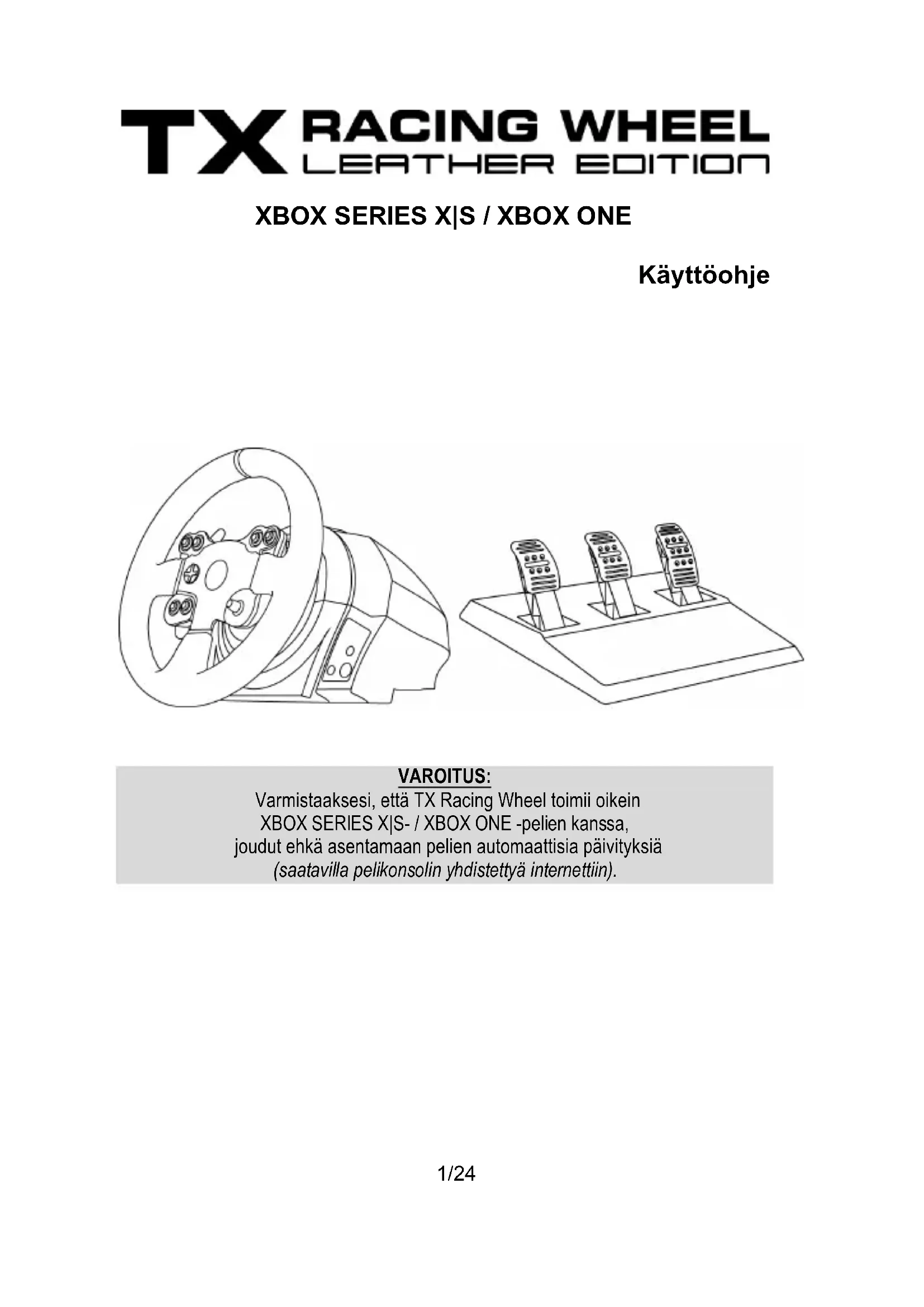 Muut MODE-painikkeen tiedot MODE-painikkeesta ja ilmaisinvalosta saa lisätietoa osoitteesta https://support.thrustmaster.com. Napsauta Racing Wheels / TX Racing Wheel LEATHER Edition ja valitse sitten Manual tai FAQ. Ohjetiedostot ja UKK/FAQ (eivät sisälly tähän käyttöohjeeseen) Käy osoitteessa https://support.thrustmaster.com , napsauta Racing Wheels / TX Racing Wheel LEATHER Edition ja valitse sitten Manual tai FAQ.14/2415/24 TEKNISET OMINAISUUDET 1 Metallituki kartiomaiselle rajoittimelle (ei valmiiksi asennettu) 2 Kartiomainen rajoitin 3 Kiinnitysruuvi metallituelle 4 2,5 mm kuusiokoloavain (mukana) 5 Asennon säätömutteri kartiomaiselle rajoittimelle 6 Polkimen varsi 7 Muovinen kärkituki 8 Metallinen polkimen kärki16/24 VAROITUS Ennen kuin käytät tätä tuotetta, lue nämä ohjeet huolella ja säästä ne myöhempää tarvetta varten.