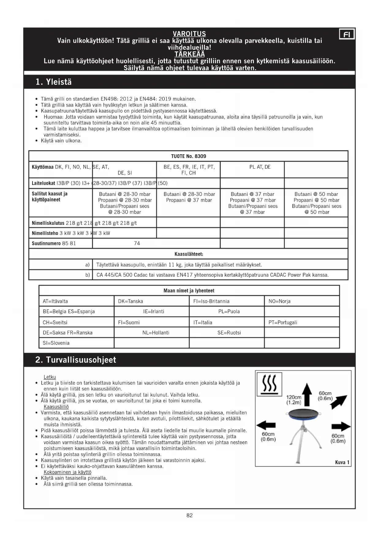 - Käytä vain ulkona. Kuva 1 TUOTE No. 8309 Käyttömaa DK, FI, NO, NL, SE, AT, DE, SI BE, ES, FR, IE, IT, PT, FI, CH PL AT, DE Laiteluokat I3B/P (30) I3+ (28-30/37) I3B/P (37) I3B/P (50) Sallitut kaasut ja käyttöpaineet Butaani @ 28-30 mbar Propaani @ 28-30 mbar Butaani/Propaani seos @ 28-30 mbar Butaani @ 28-30 mbar Propaani @ 37 mbar Butaani @ 37 mbar Propaani @ 37 mbar Butaani/Propaani seos @ 37 mbar Butaani @ 50 mbar Propaani @ 50 mbar Butaani/Propaani seos @ 50 mbar Nimelliskulutus 218 g/t 218 g/t 218 g/t 218 g/t Nimellisteho 3 kW 3 kW 3 kW 3 kW Suutinnumero 85 81 74 Kaasulähteet: a) Täytettävä kaasupullo, enintään 11 kg, joka täyttää paikalliset määräykset. b) CA 445/CA 500 Cadac tai vastaava EN417 yhteensopiva kertakäyttöpatruuna CADAC Power Pak kanssa. Maan nimet ja lyhenteet AT=Itävalta DK=Tanska FI=Iso-Britannia NO=Norja BE=Belgia ES=Espanja IE=Irlanti PL=Puola CH=Sveitsi FI=Suomi IT=Italia PT=Portugali DE=Saksa FR=Ranska NL=Hollanti SE=Ruotsi SI=Slovenia