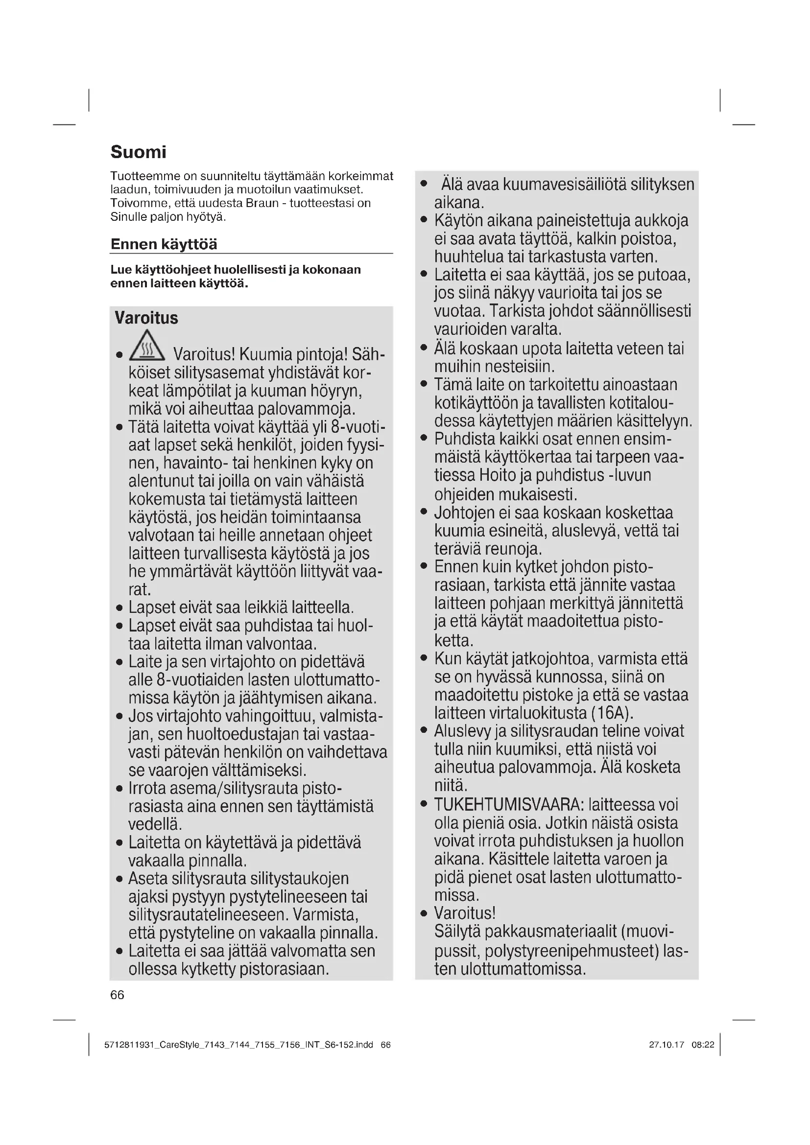 - Älä koskaan käytä puhdistamiseen kemikaaleja, etikkaa tai hankaustyynyjä (esim. karkeista nailonkuiduista valmistettuja sieniä jne.). Älä hävitä tuotetta kotitalousjätteiden kanssa sen käyttöiän lopussa. Hävittäminen tapahtuu Braun-huollossa tai sopivassa keräyspisteessä. 5712811931_CareStyle_7143_7144_7155_7156_INT_S6-152.indd 695712811931_CareStyle_7143_7144_7155_7156_INT_S6-152.indd 69 27.10.17 08:2227.10.17 08:2270 Vianetsintäopas